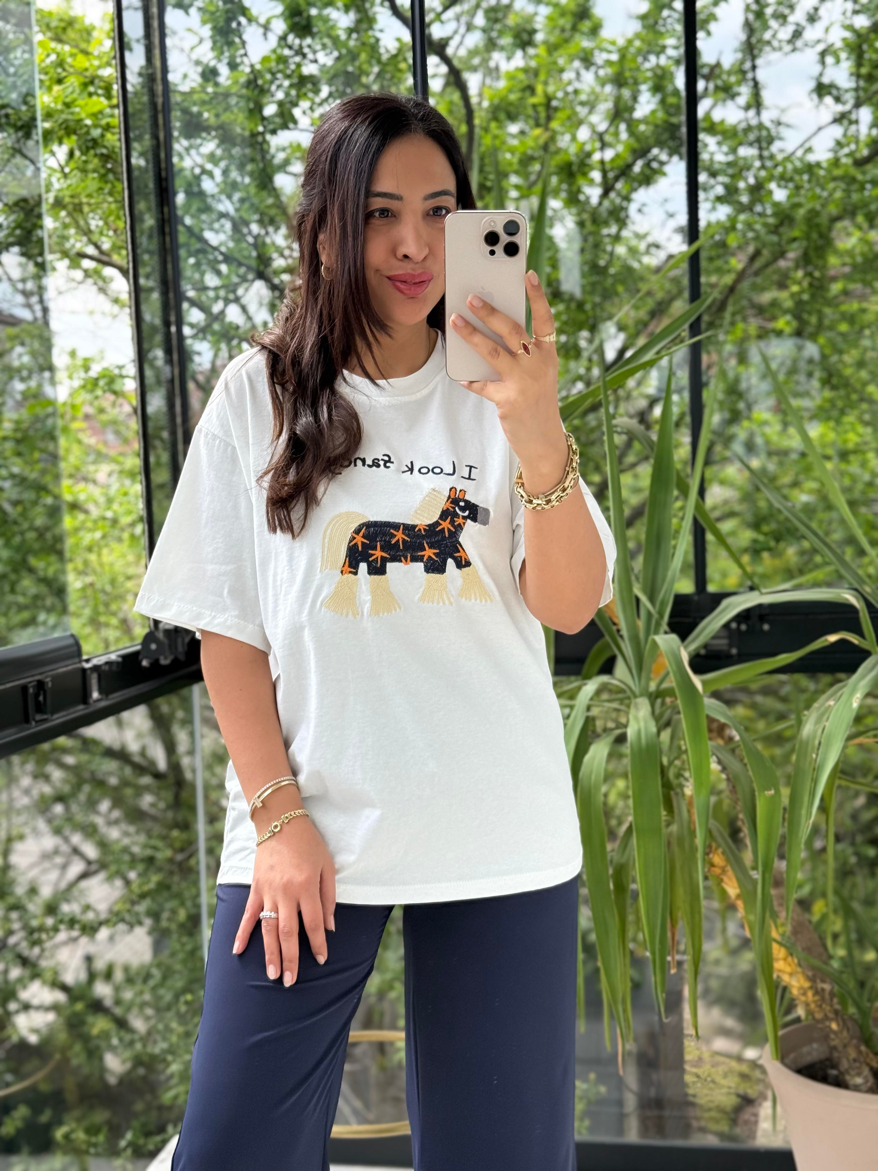 At Nakışlı Pamuklu Tişört Beyaz