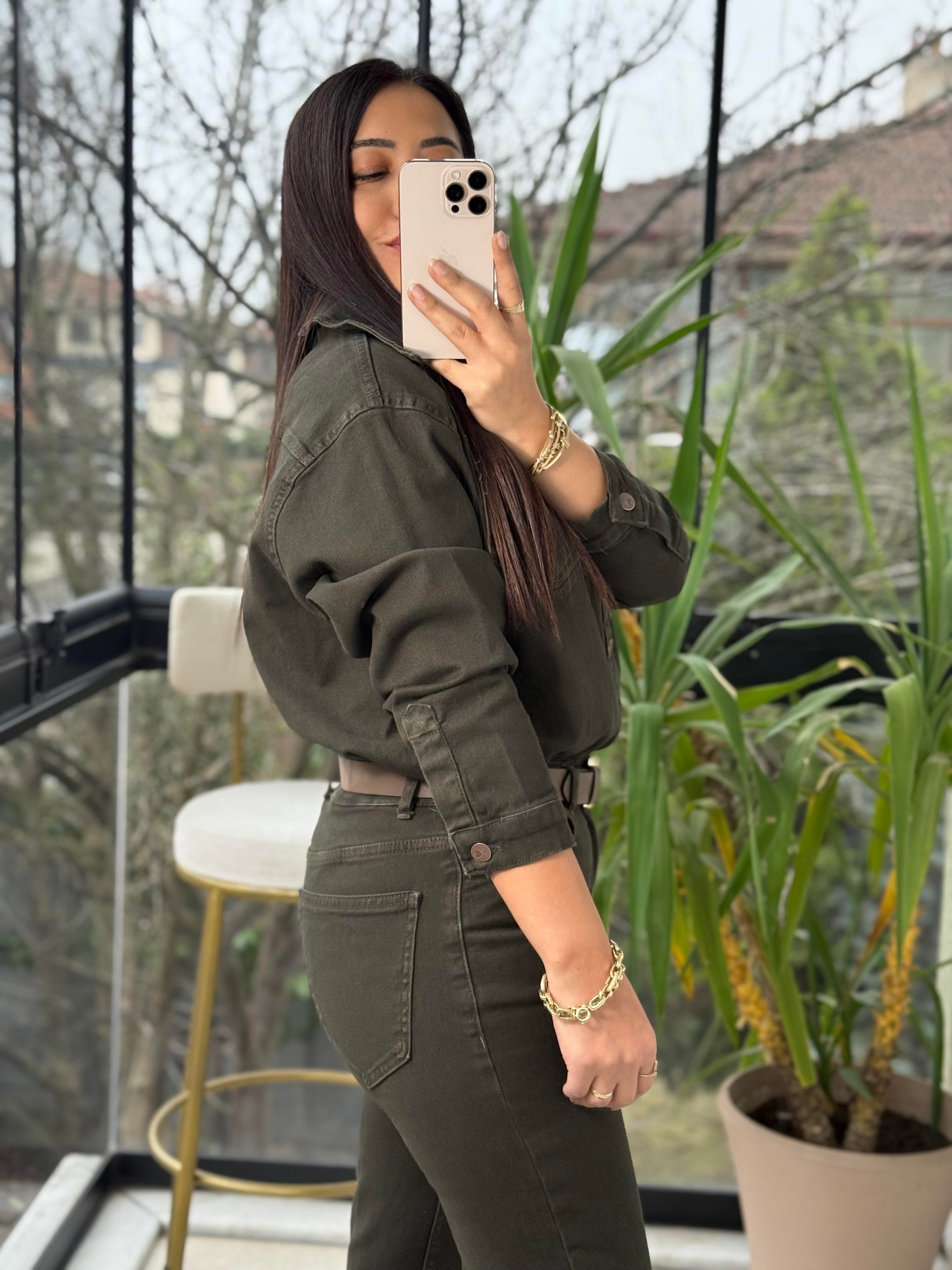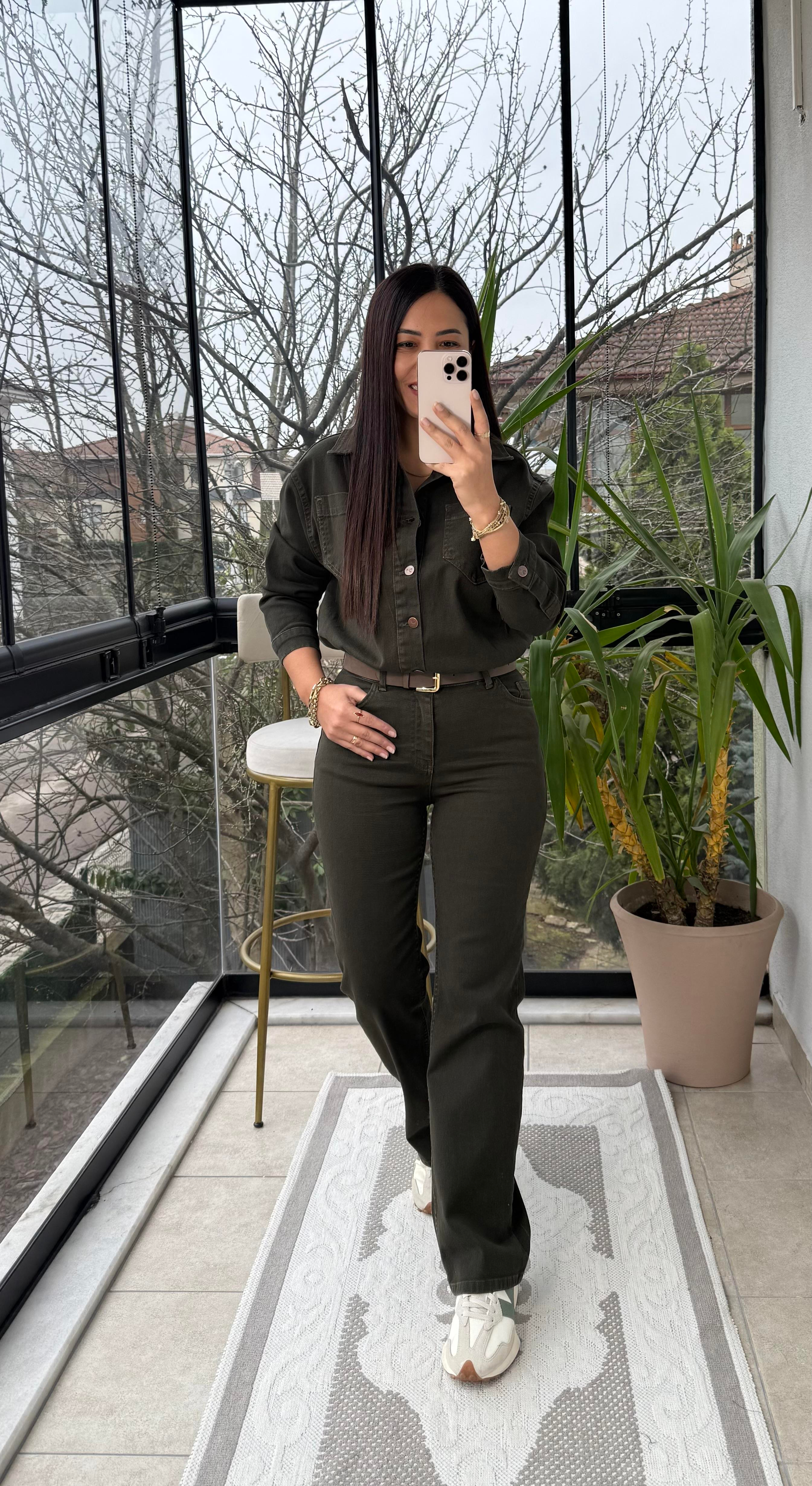 Beli Büzgülü Klasik Kot Tulum Haki Yeşili