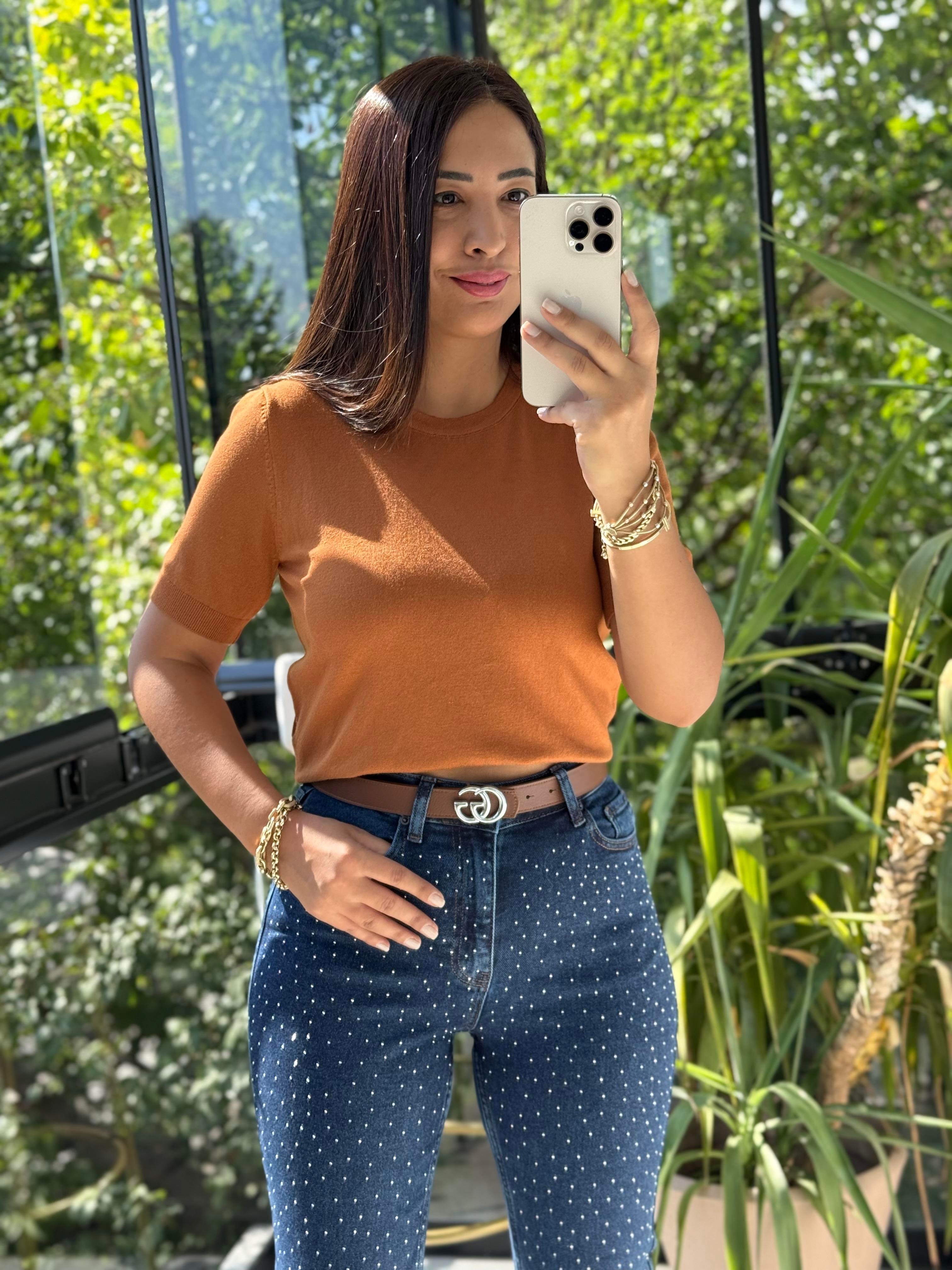 Bisiklet Yaka Kısa Kol Basic Triko Bluz Karamel