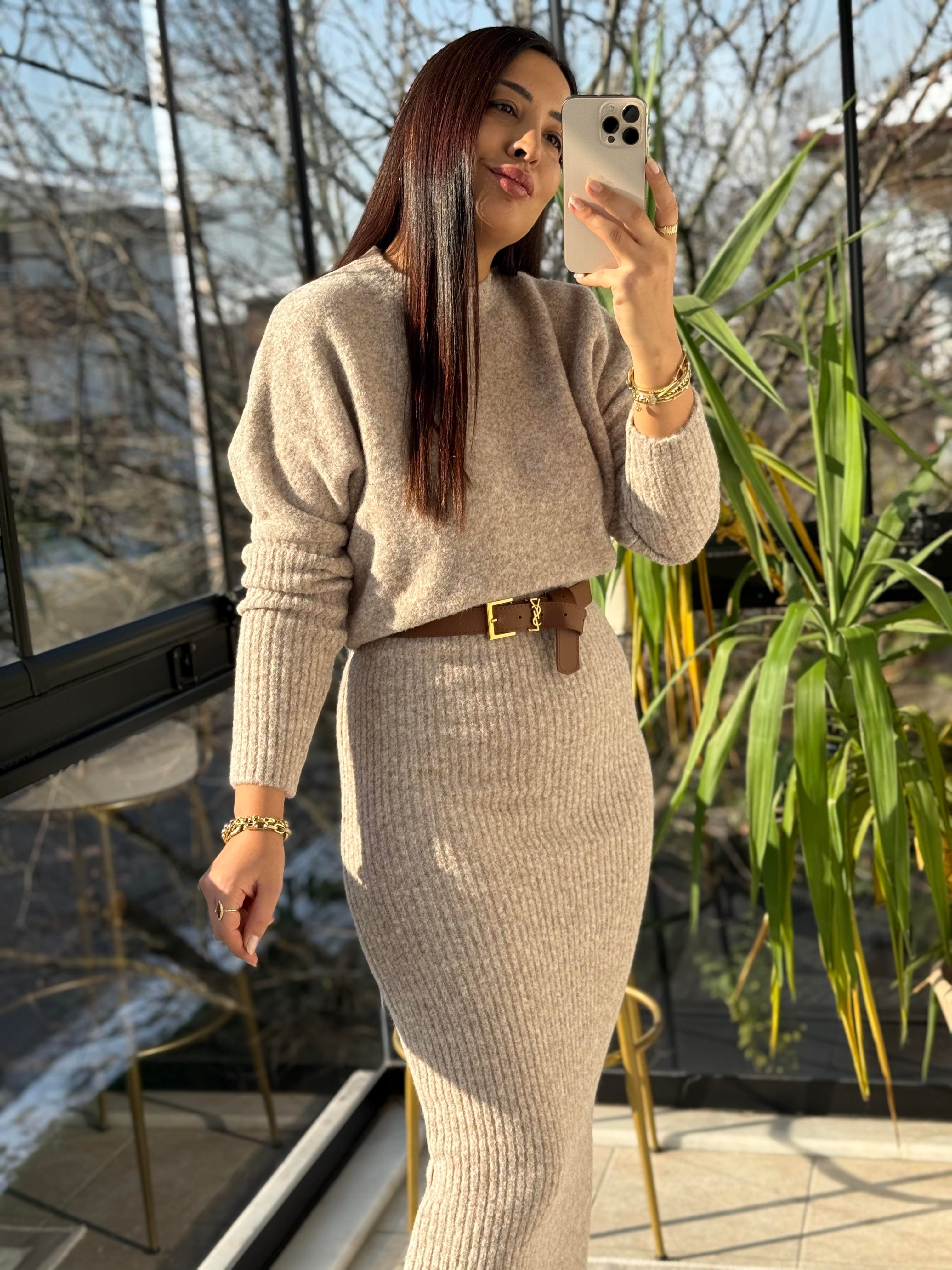 Bisiklet Yaka Yumuşak Dokulu Elbise Bej