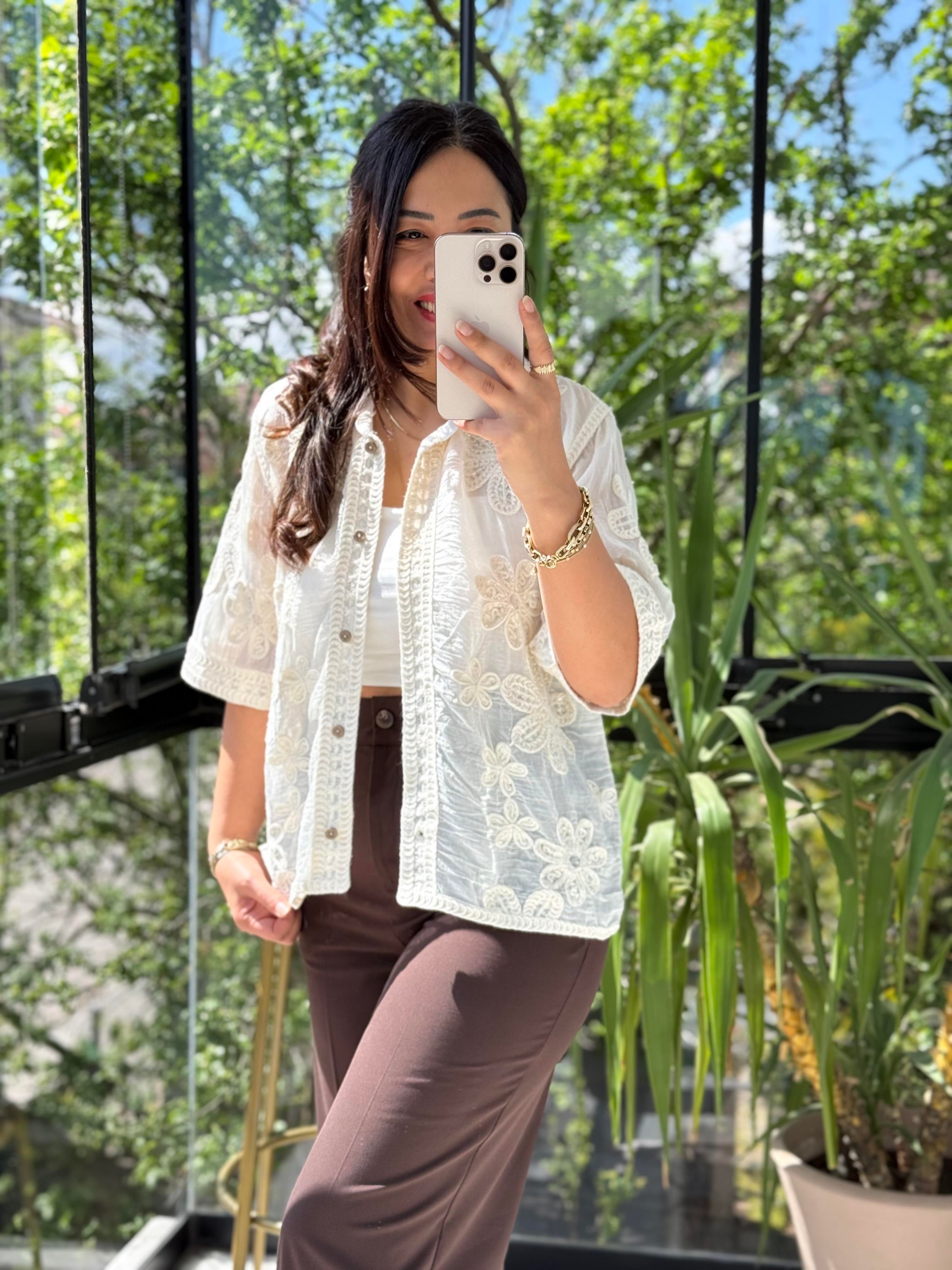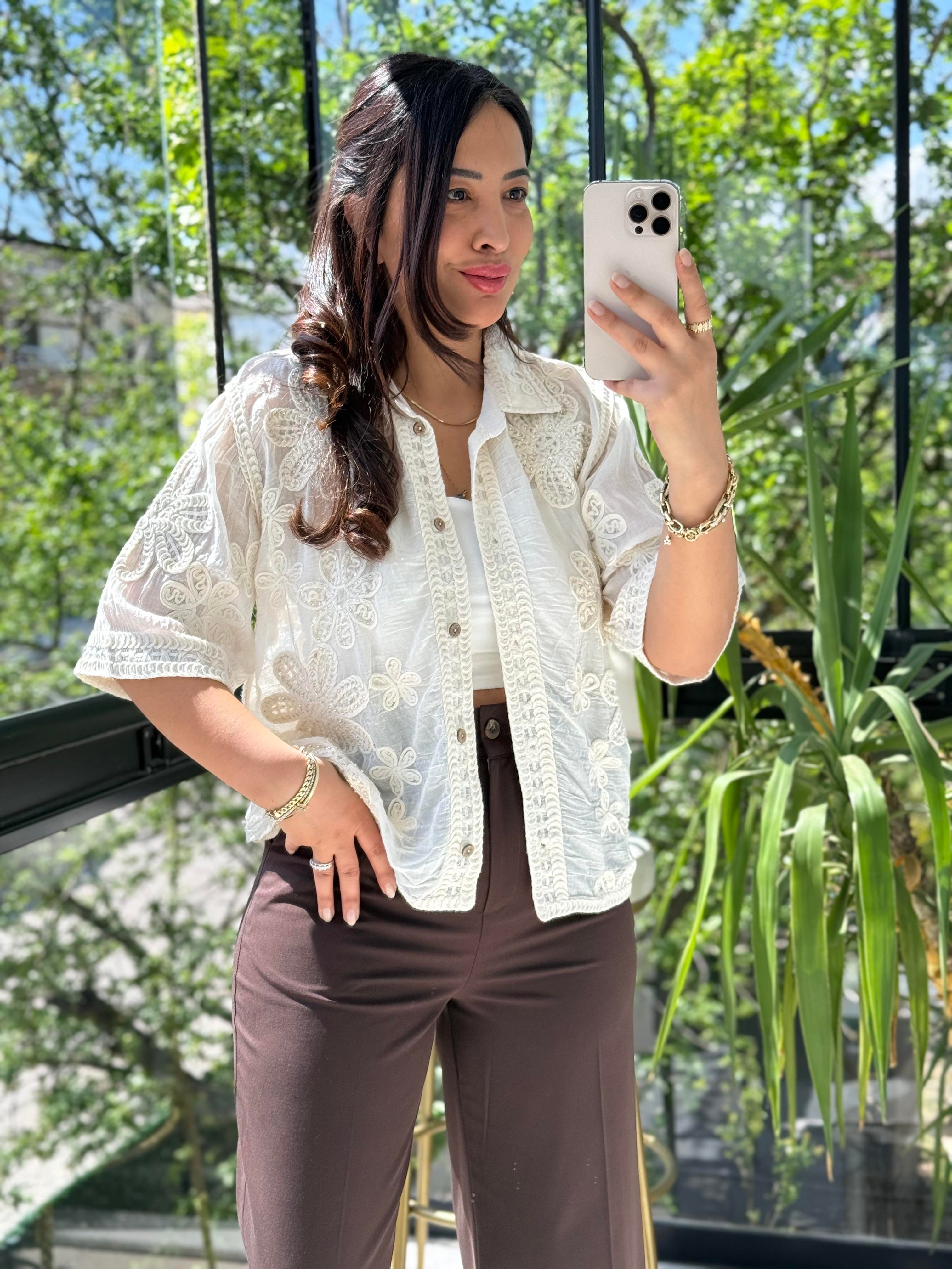 Boncuk İşlemeli Kısa Kol Naturel Gömlek Bej