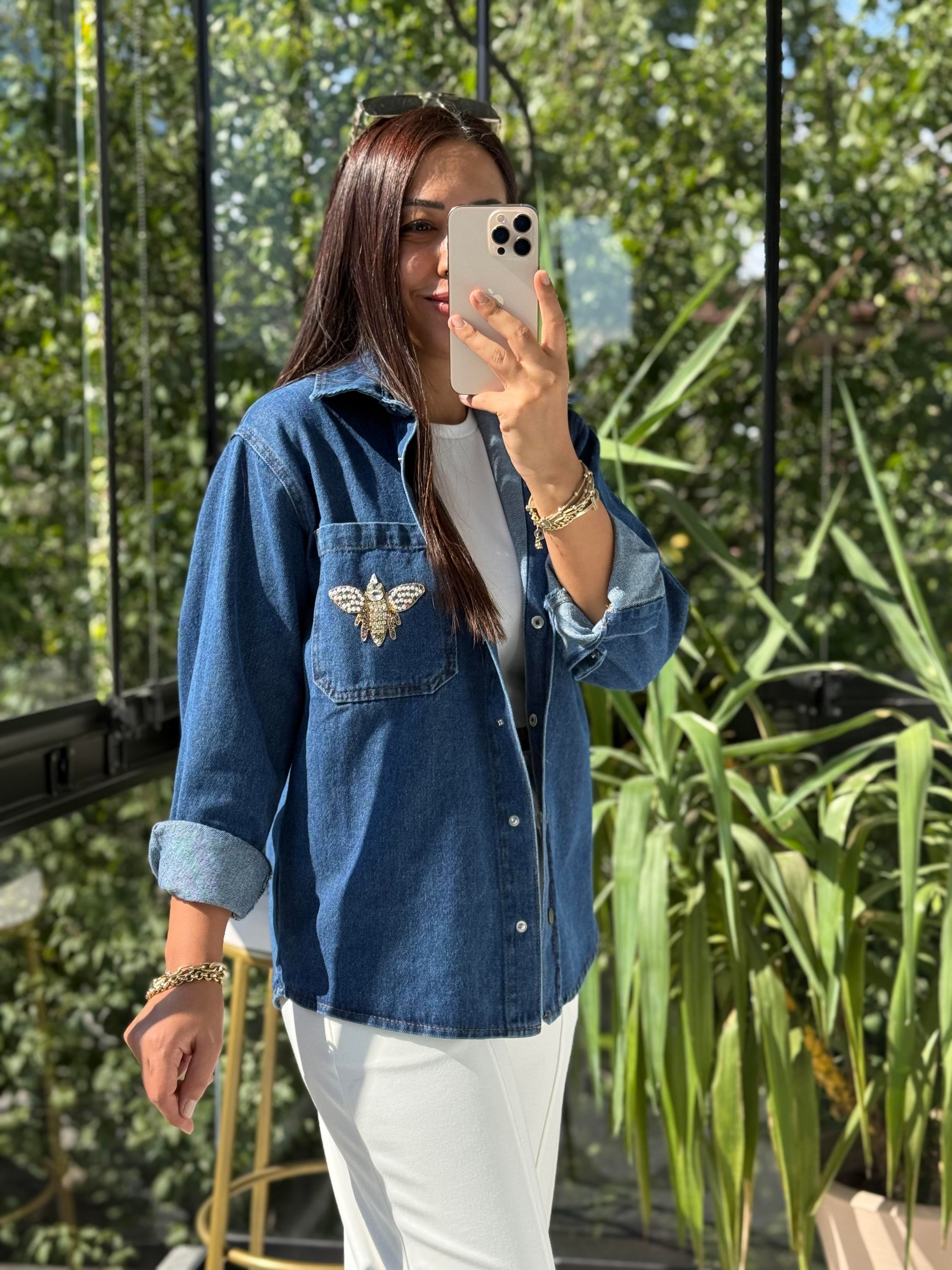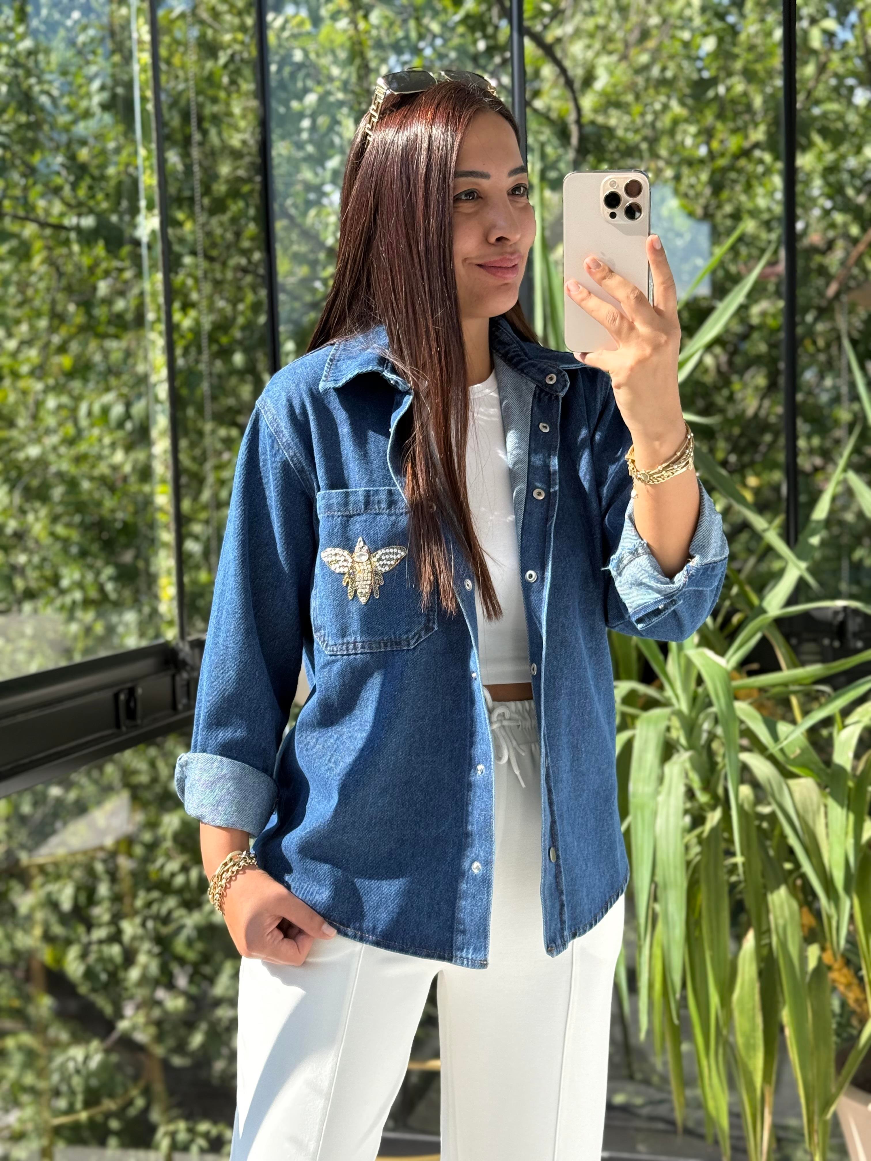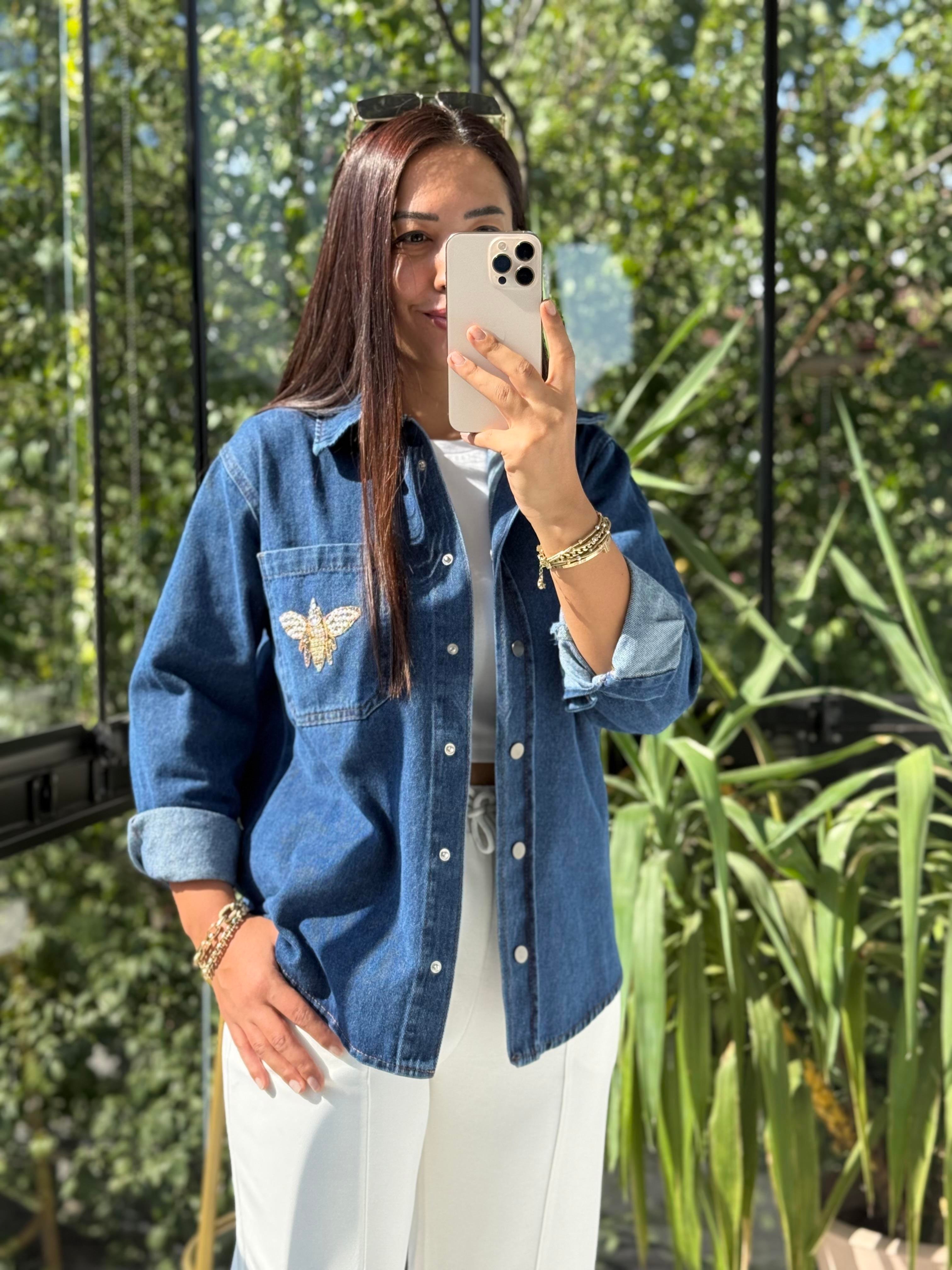 Cebi İşlemeli Baskılı Bymn Gömlek Ceket Mavi