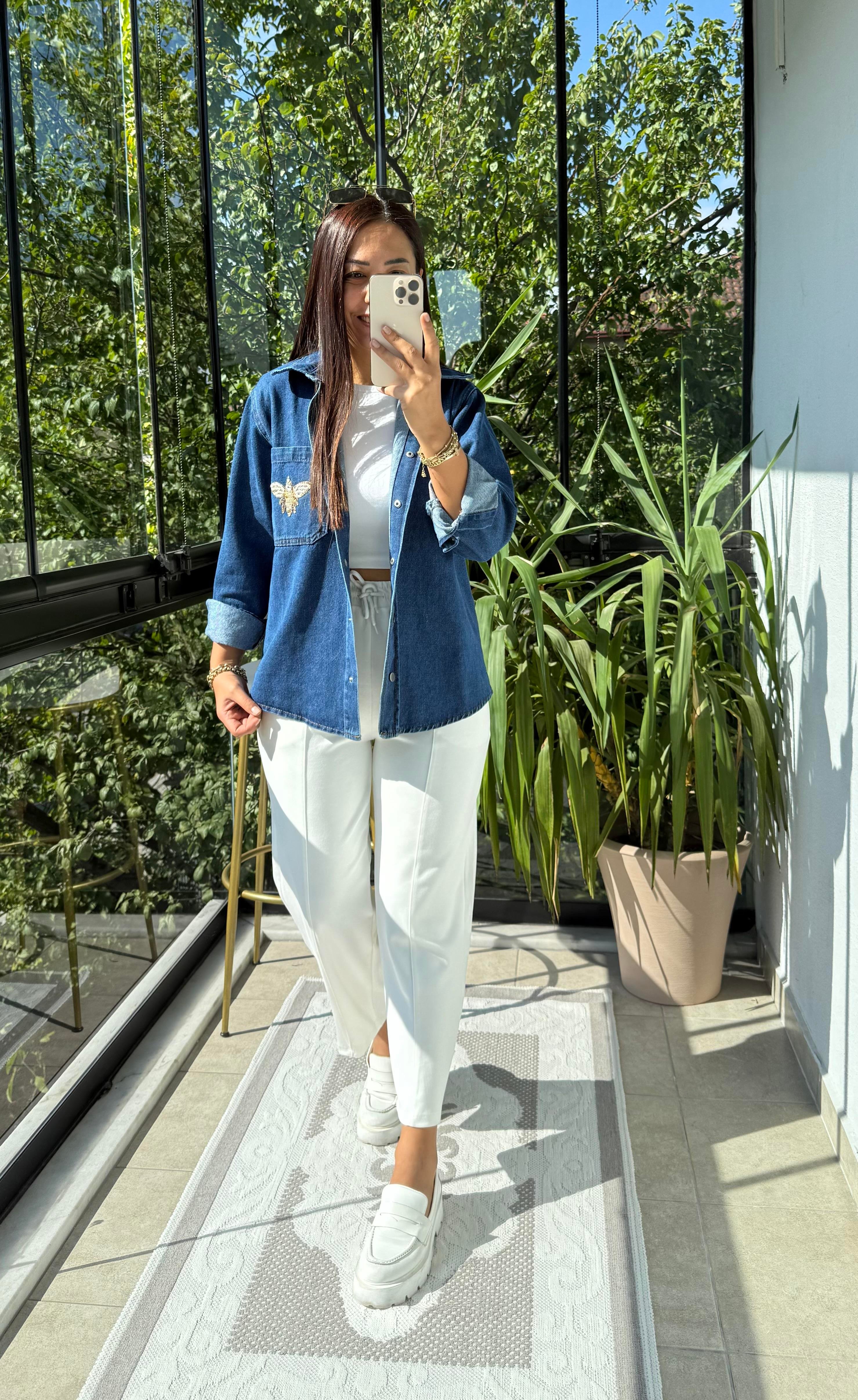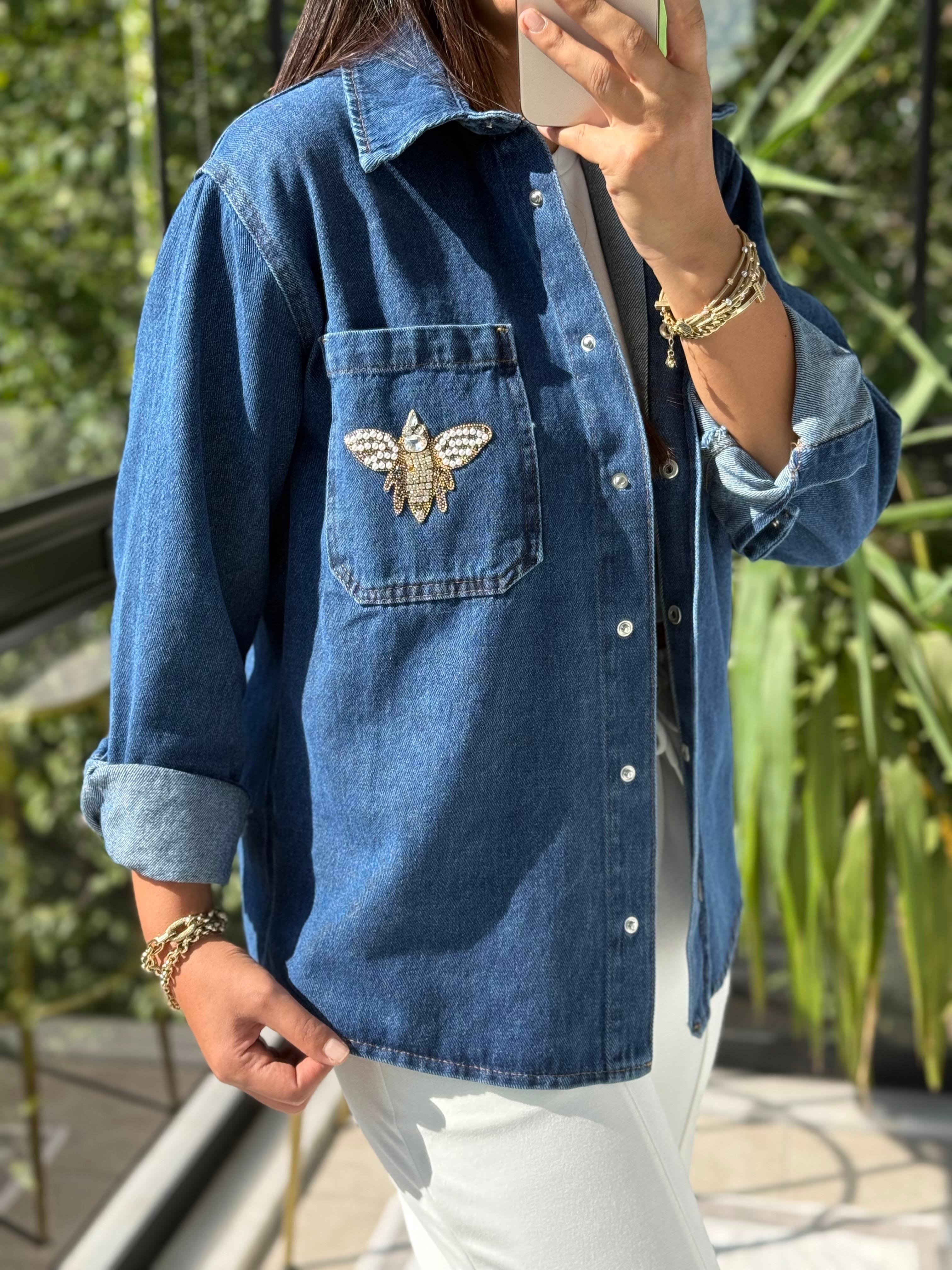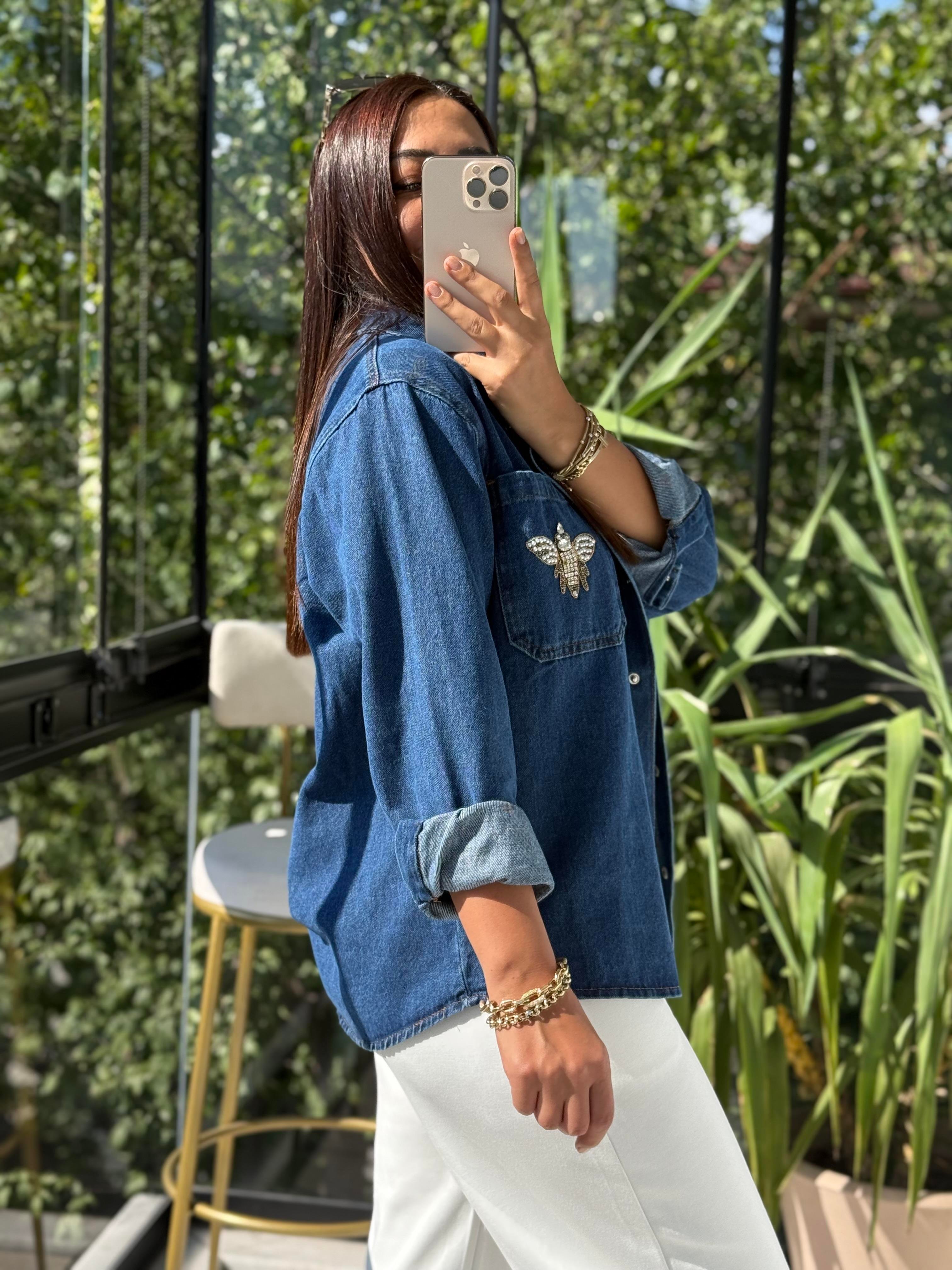 Cebi İşlemeli Baskılı Bymn Gömlek Ceket Mavi