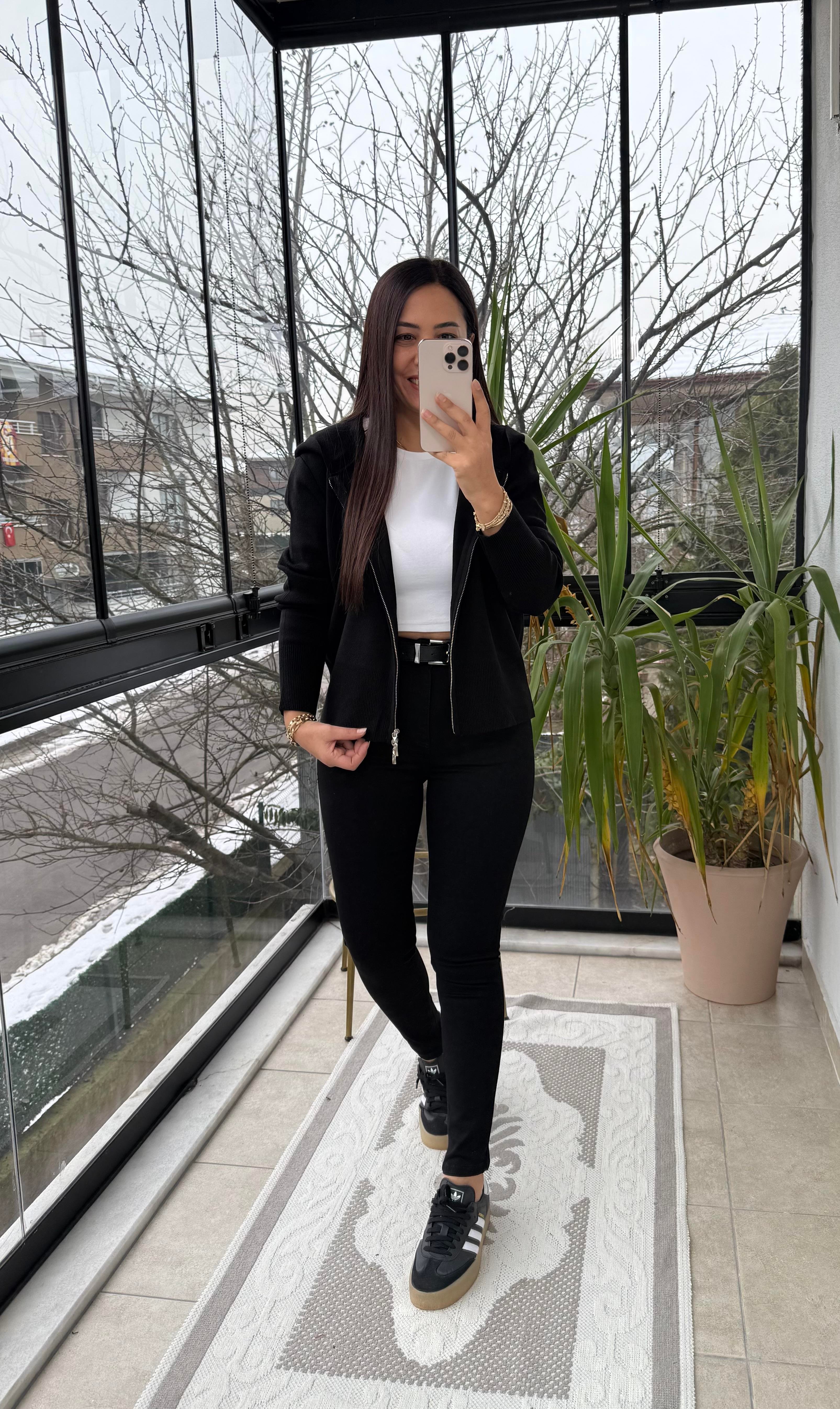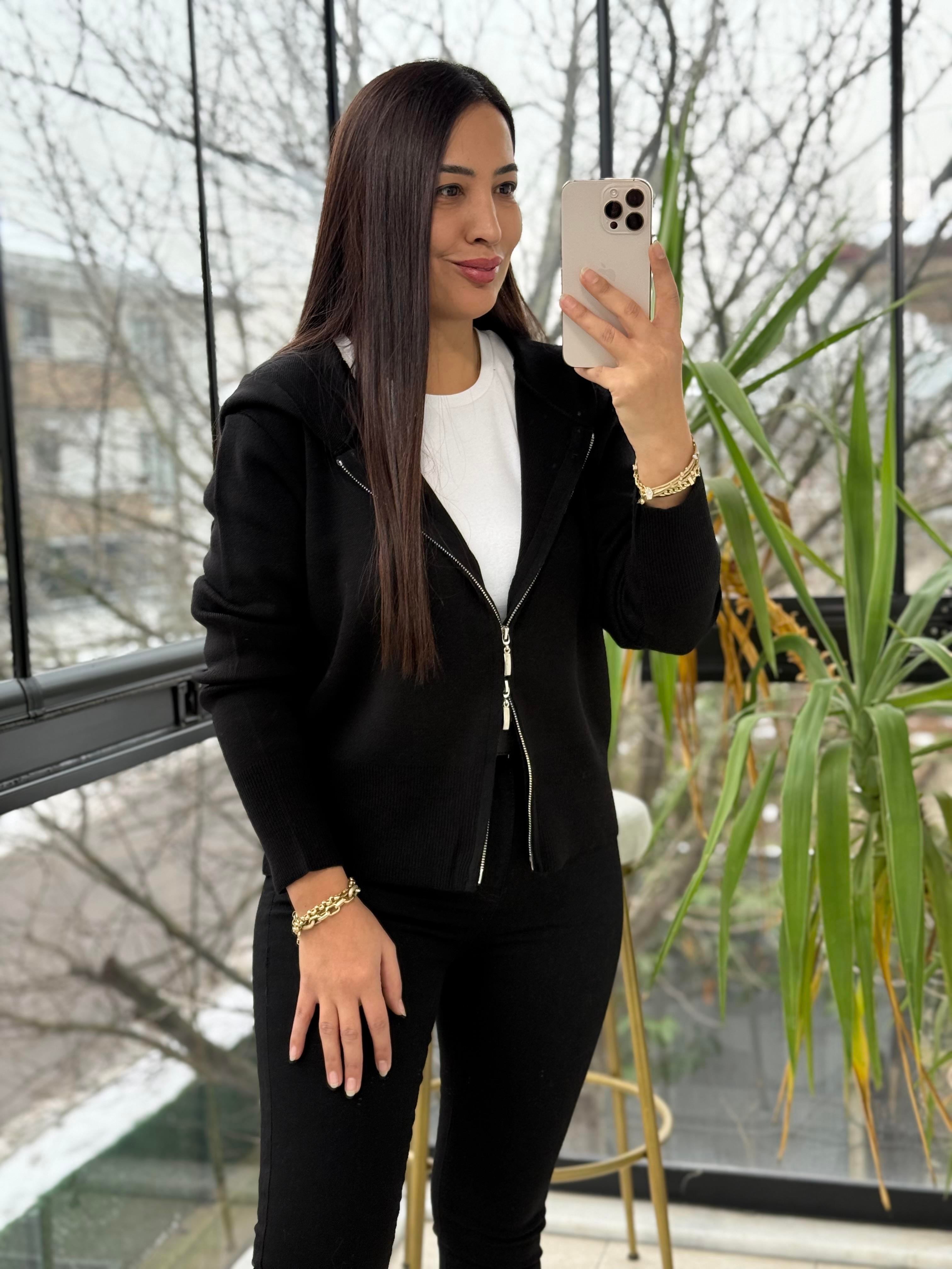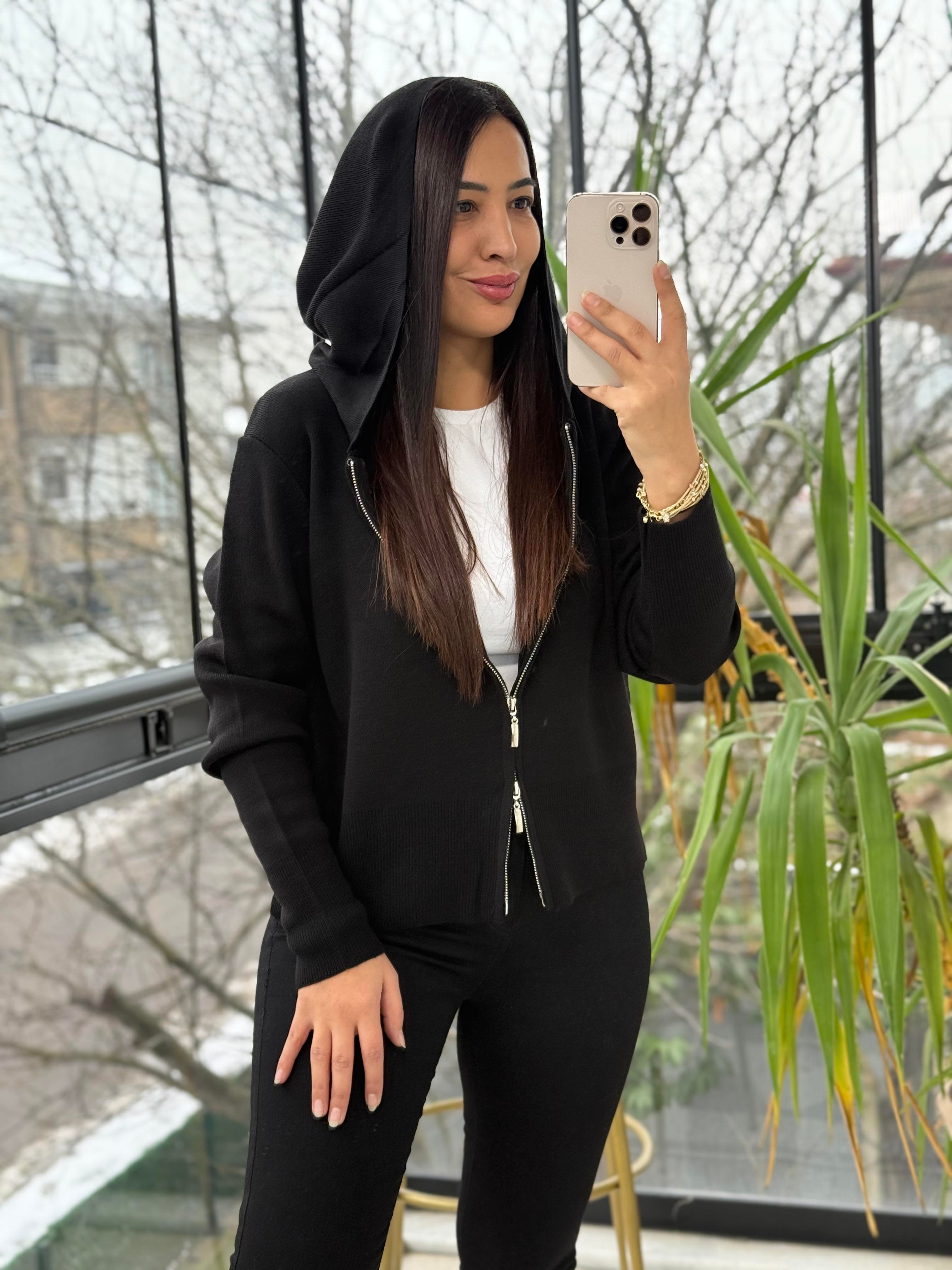 Çift Fermuarlı Kapüşonlu Yumoş Basic Hırka Siyah