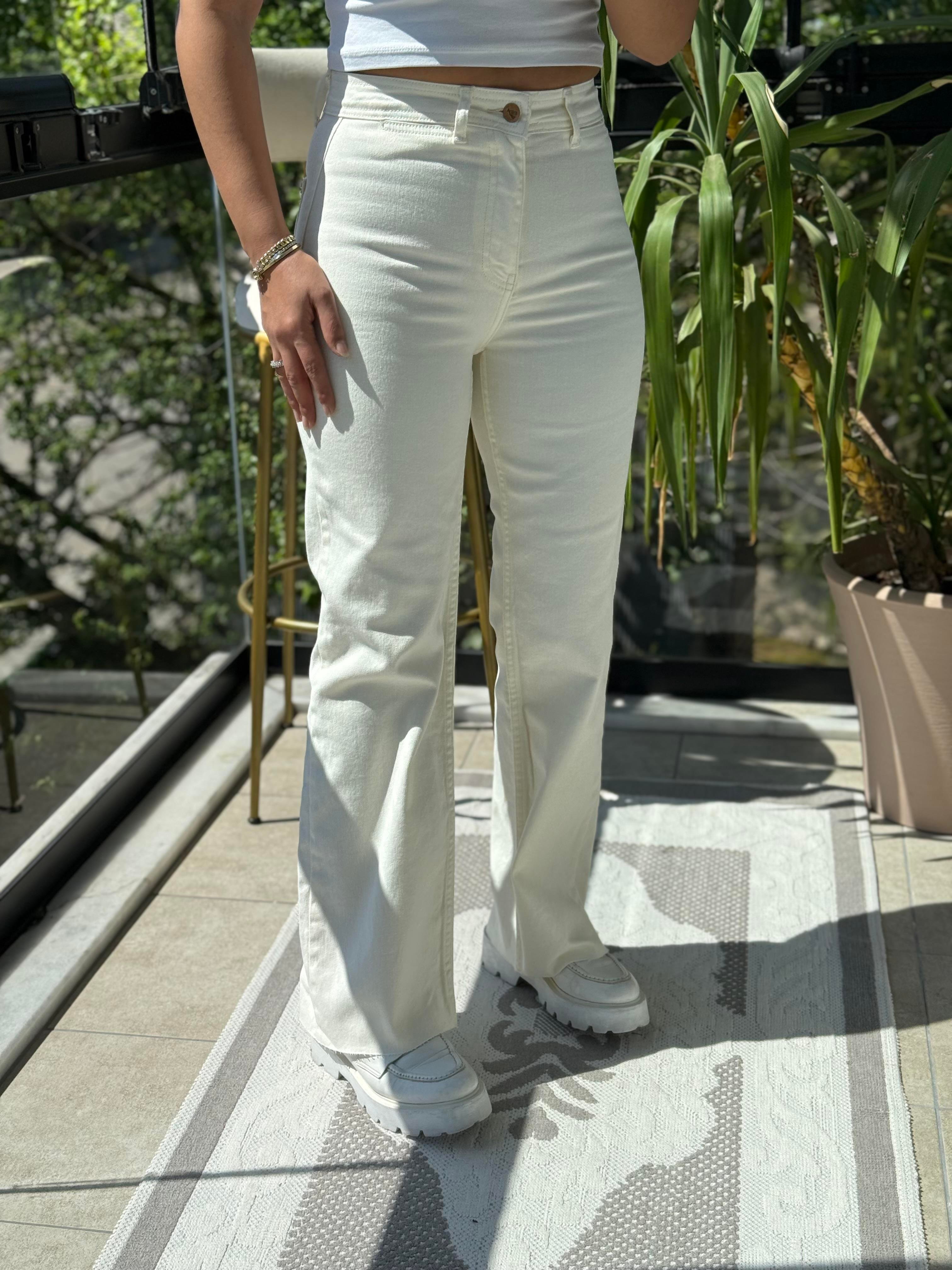Dekoratif Cep Detaylı Palazzo Kot Pantolon Krem