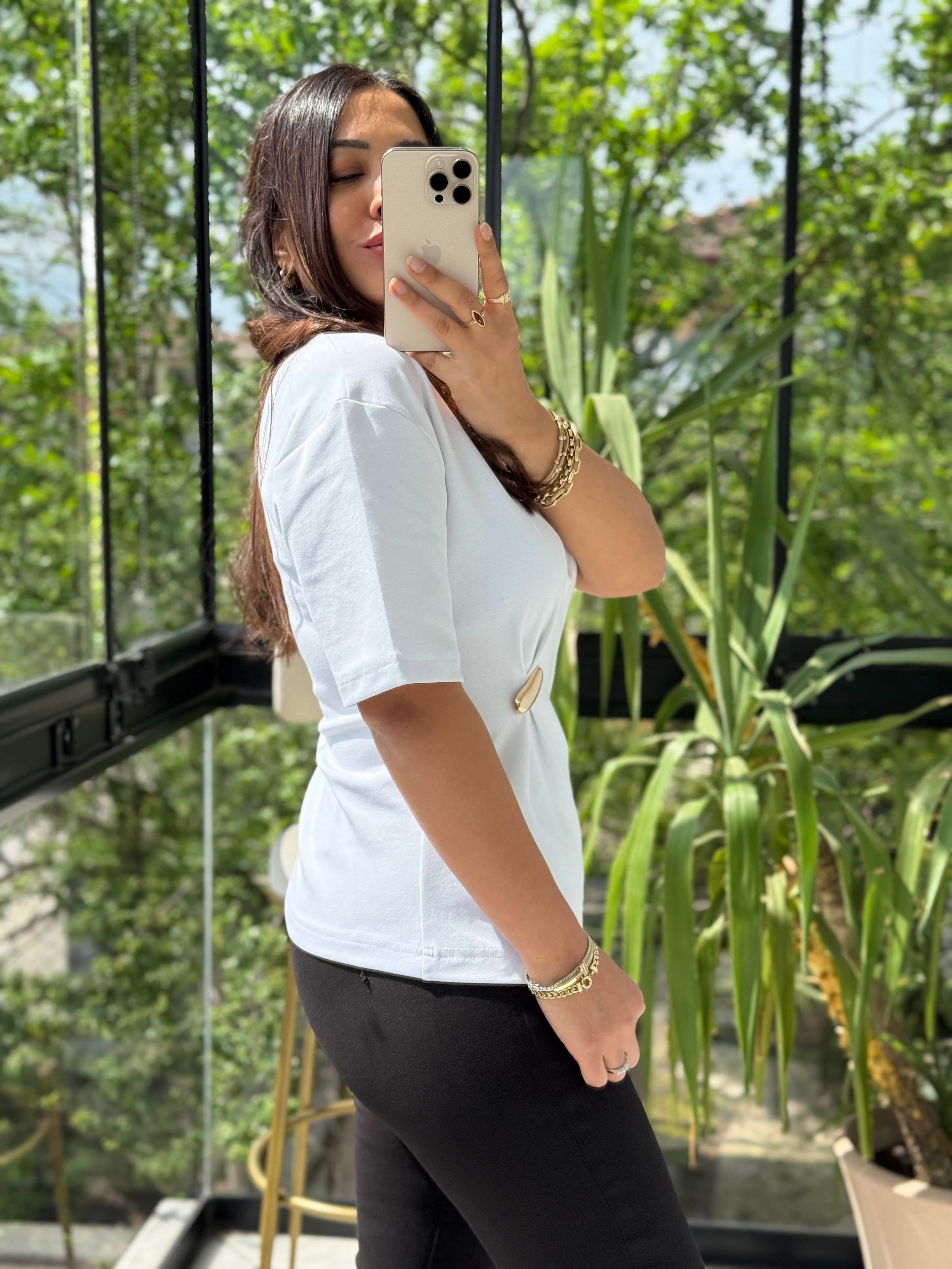 Dilvin Aksesuar Detaylı Kısa Kollu Tişört Beyaz