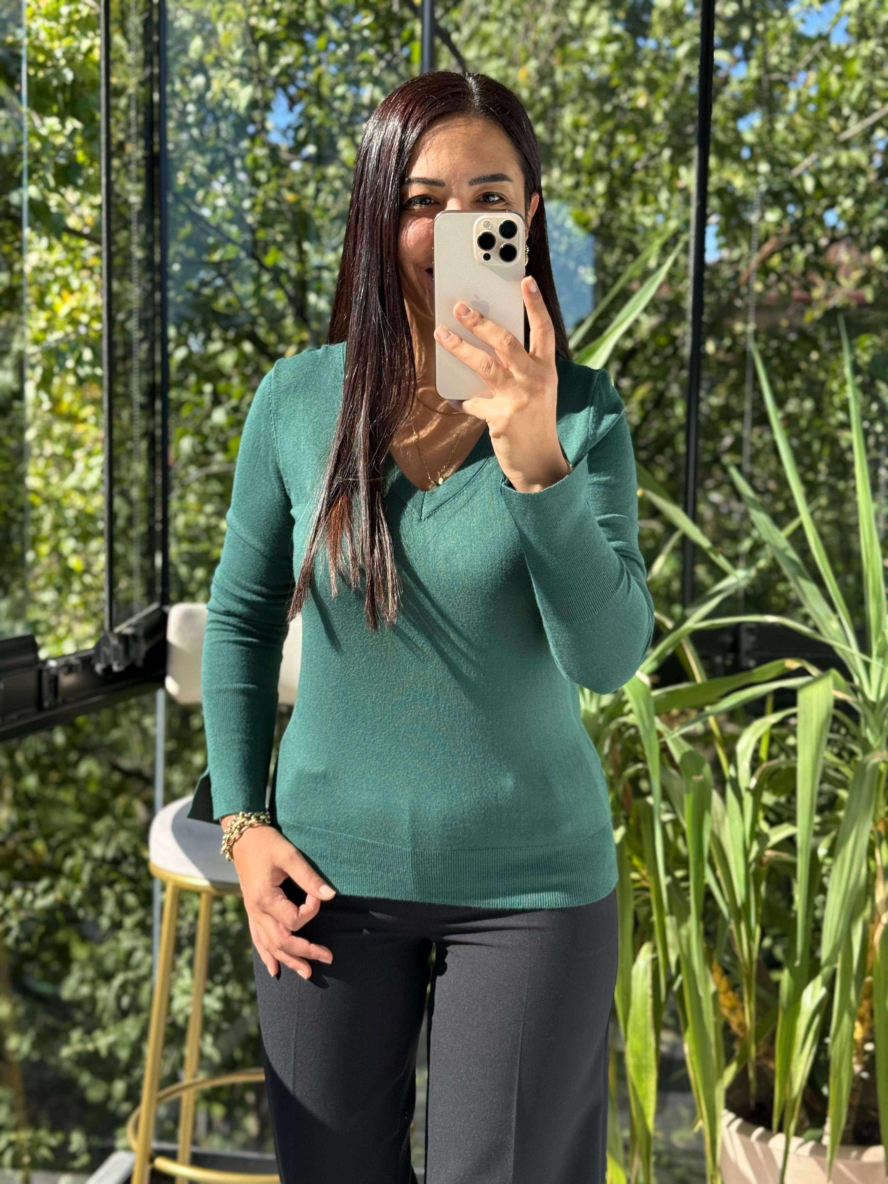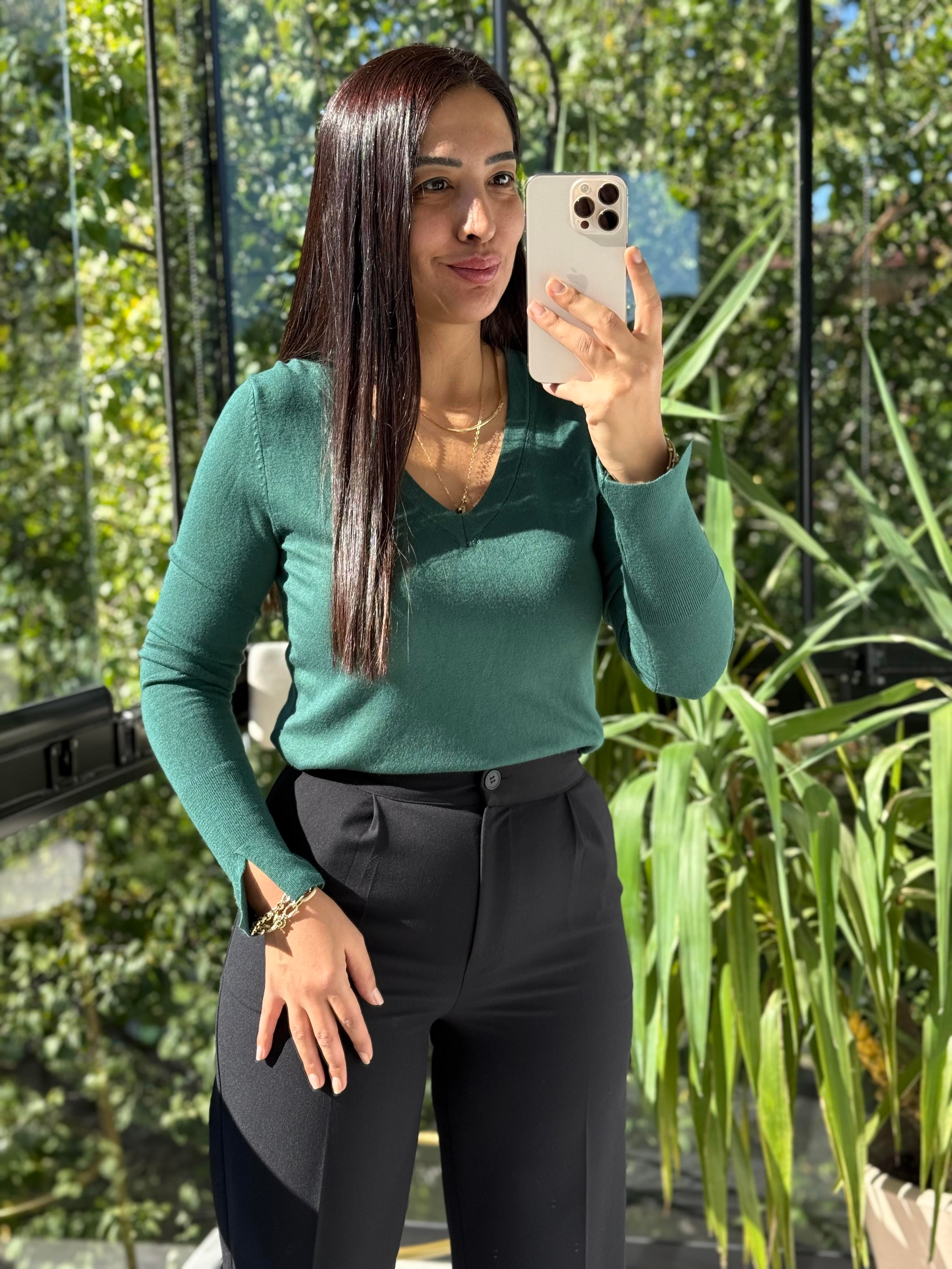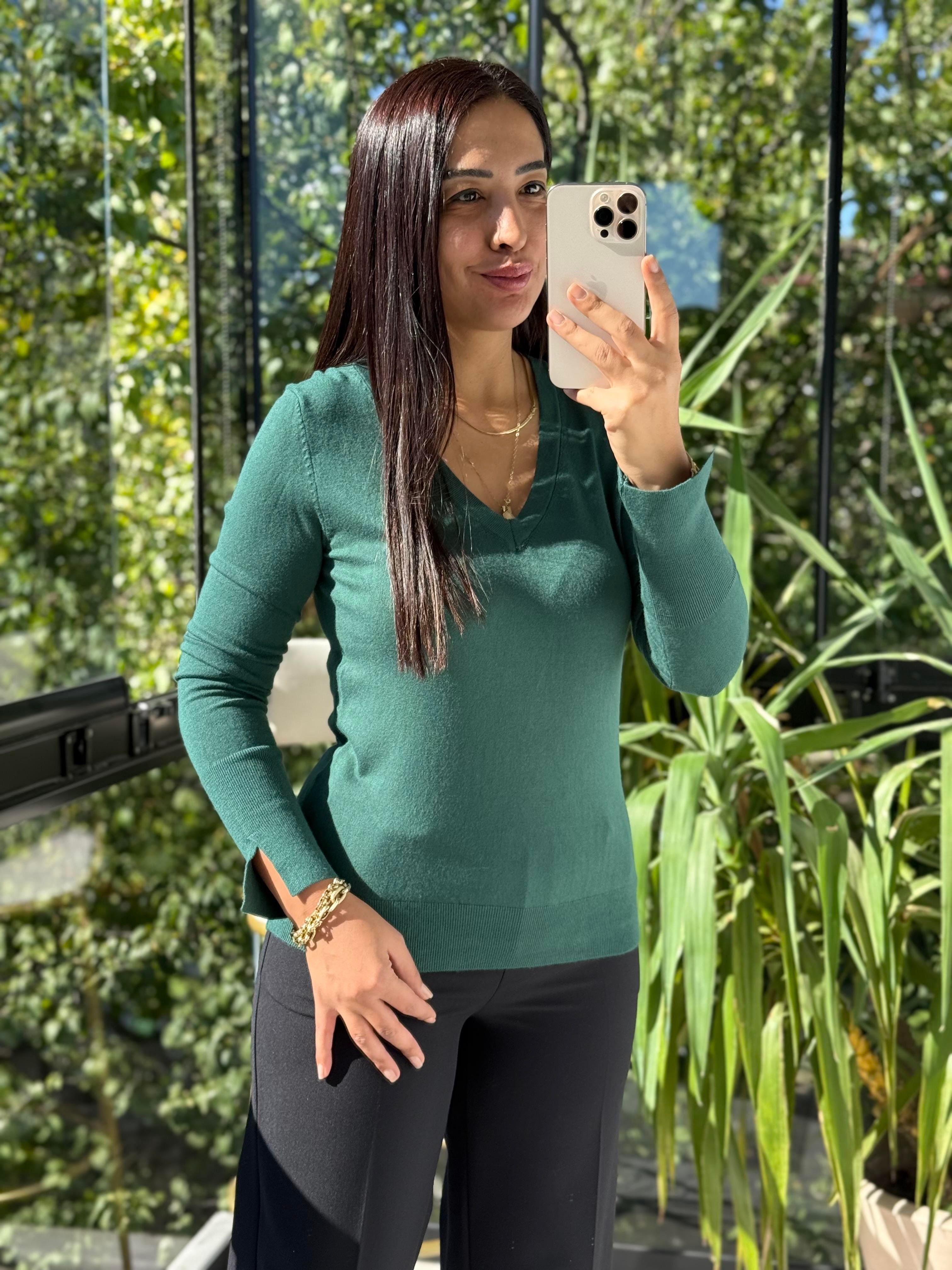 Dilvin V Yaka Kolu Yırtmaçlı Kazak Zümrüt