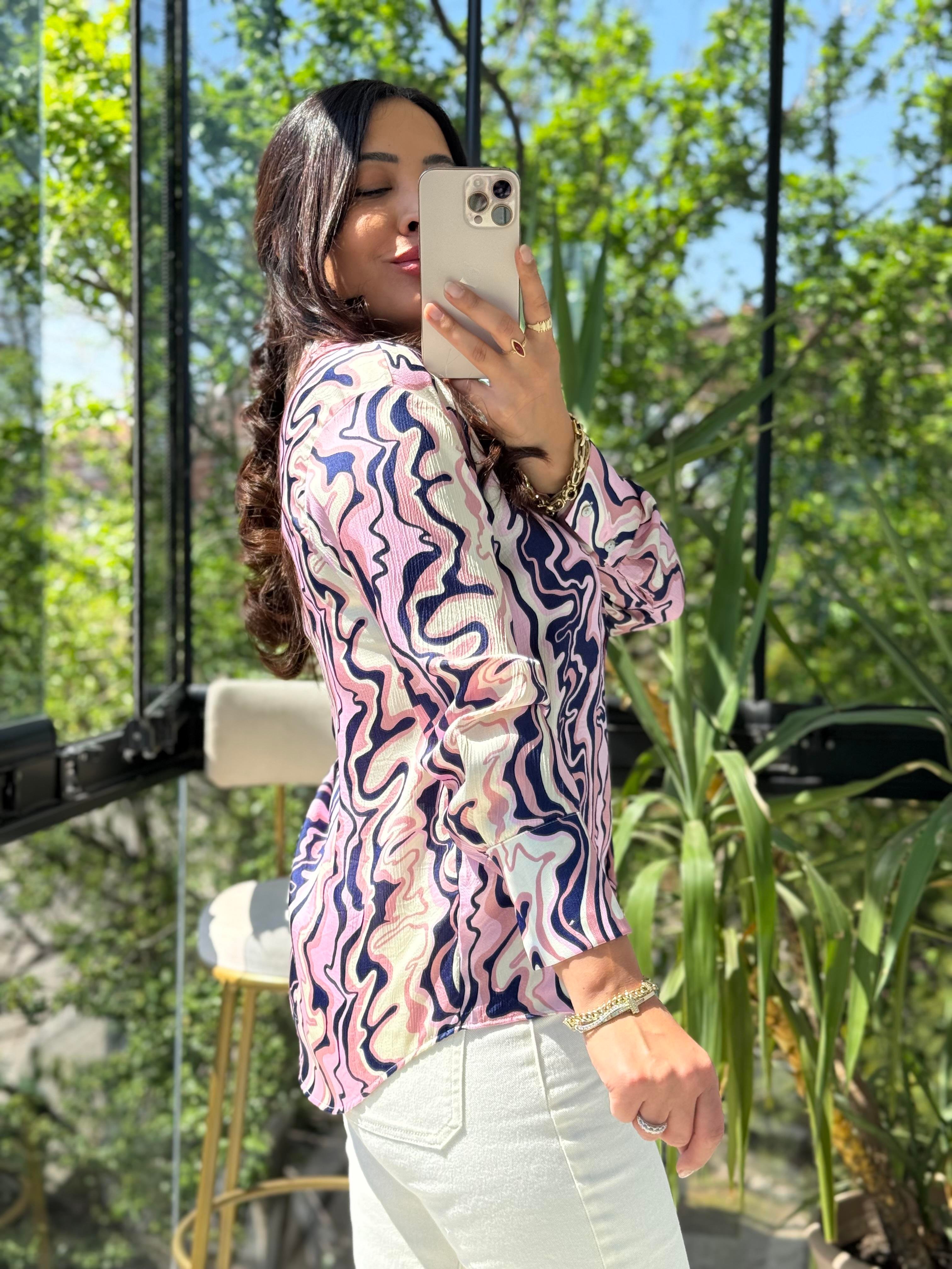 Wave Effect Basic Gömlek Pembe Desenli Saten Gömlek Pudra