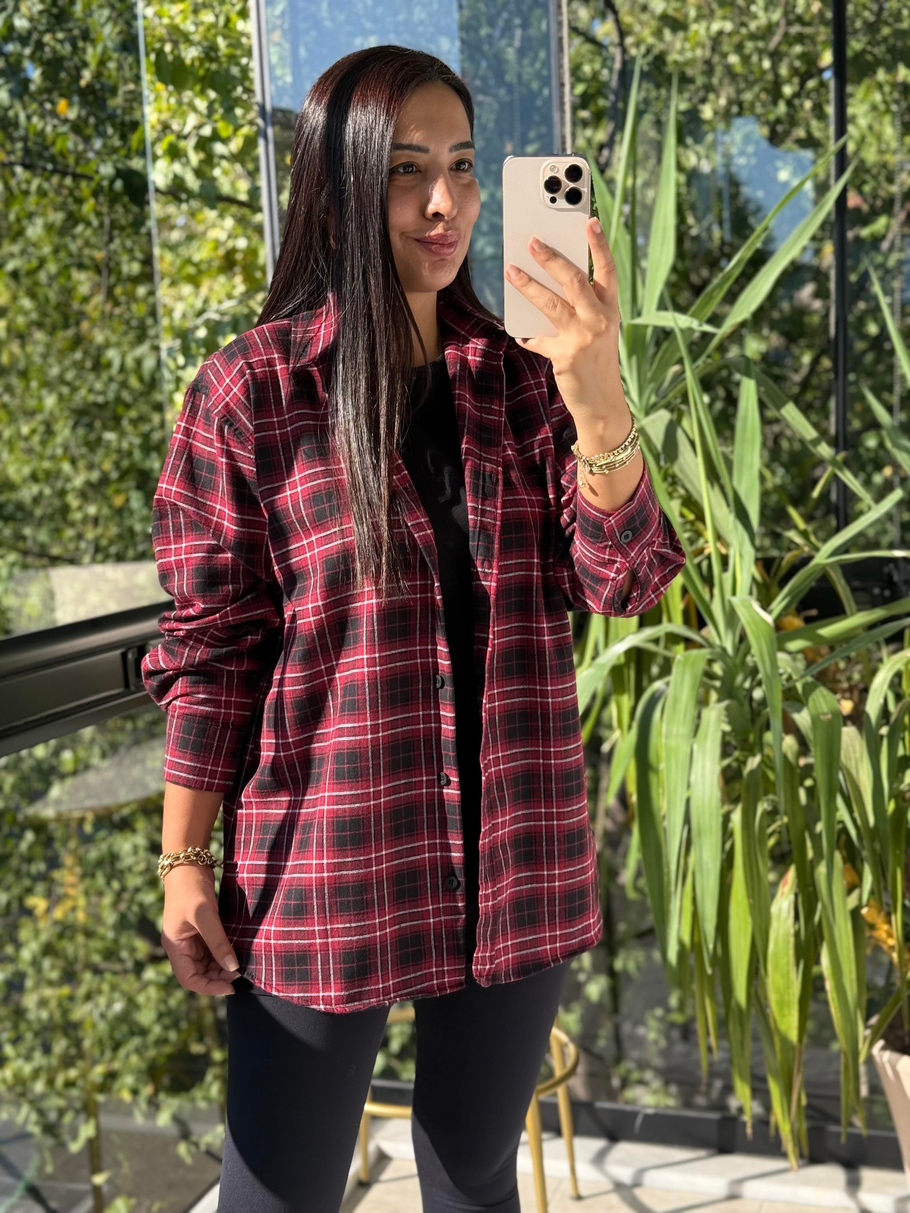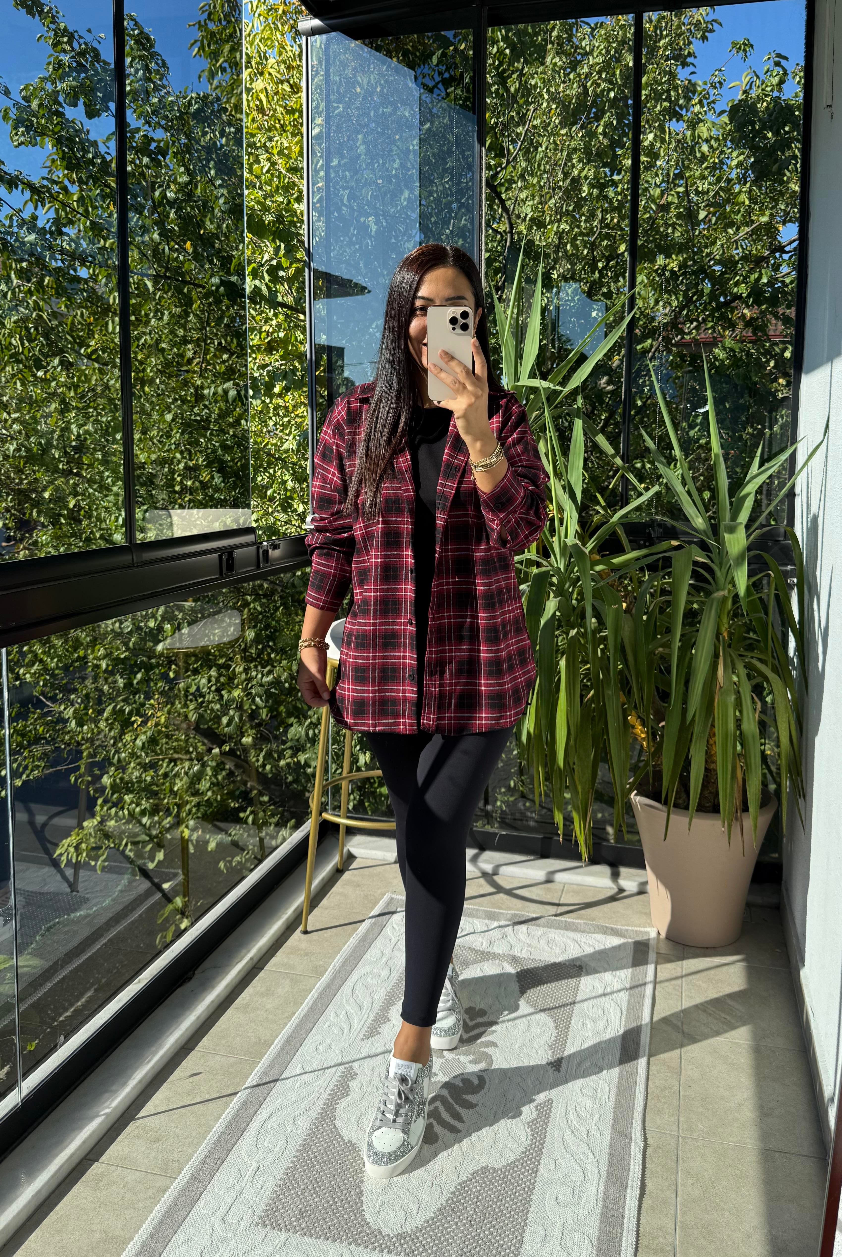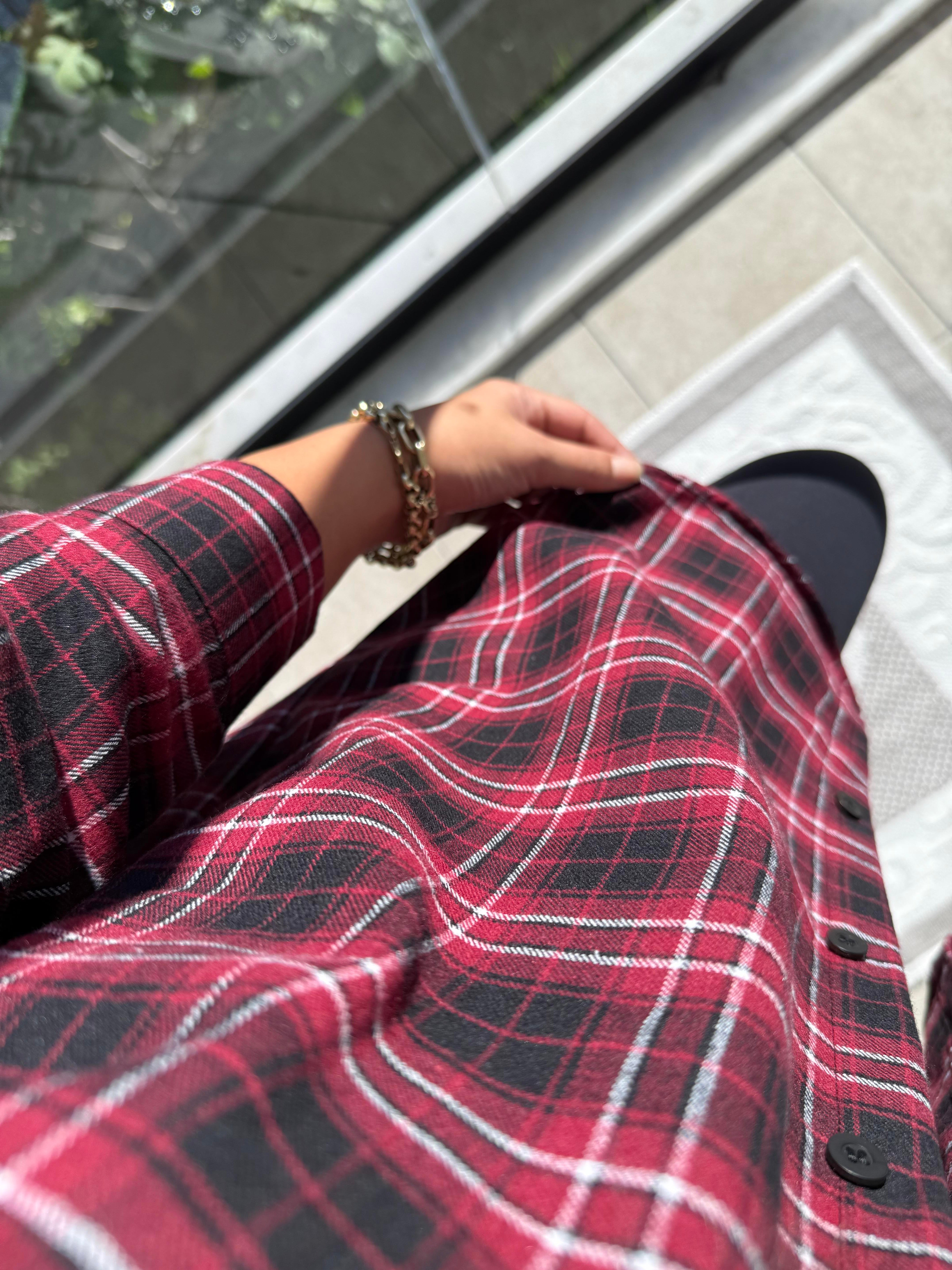 Ekoseli Oversize Gömlek Bordo