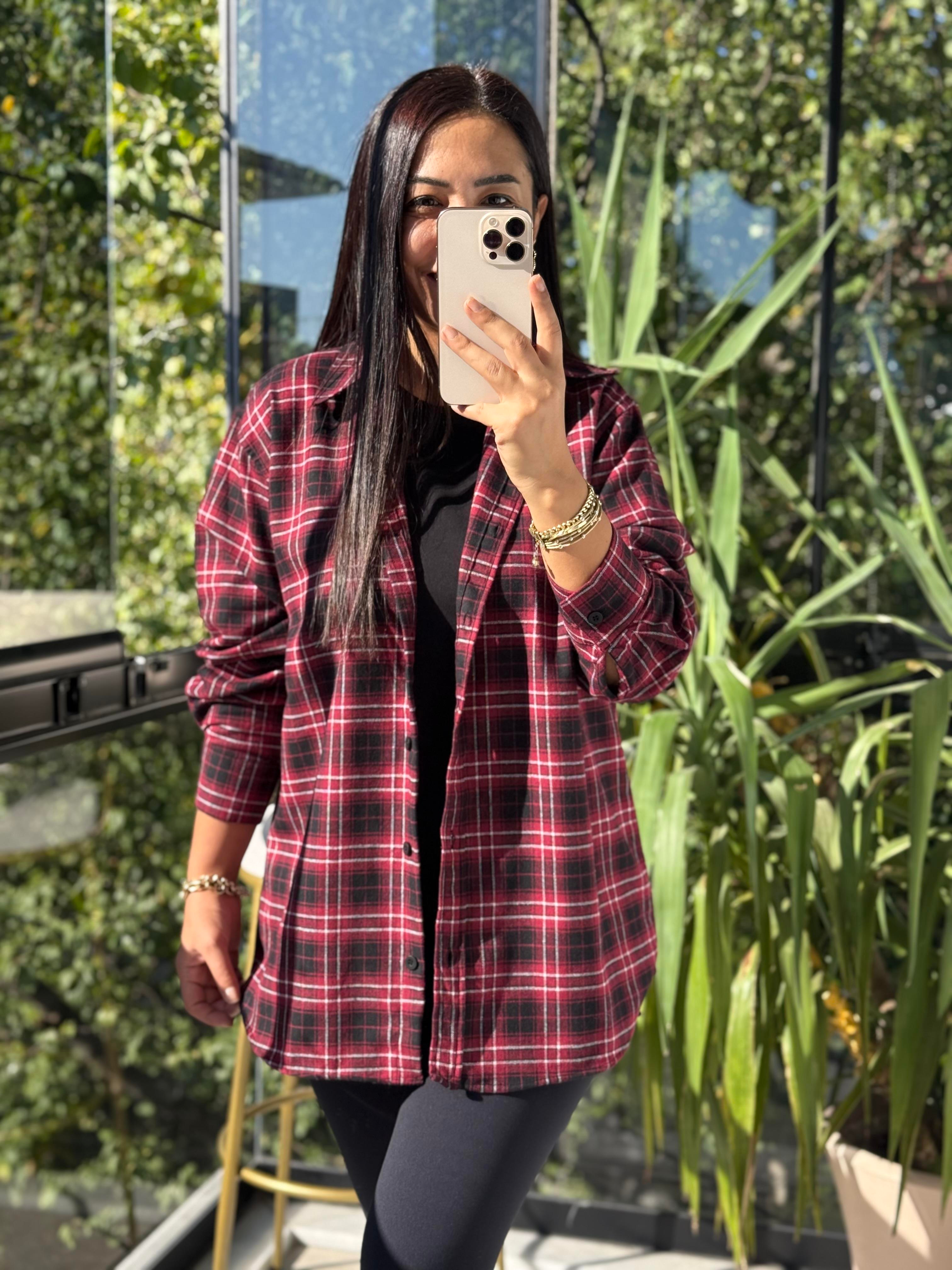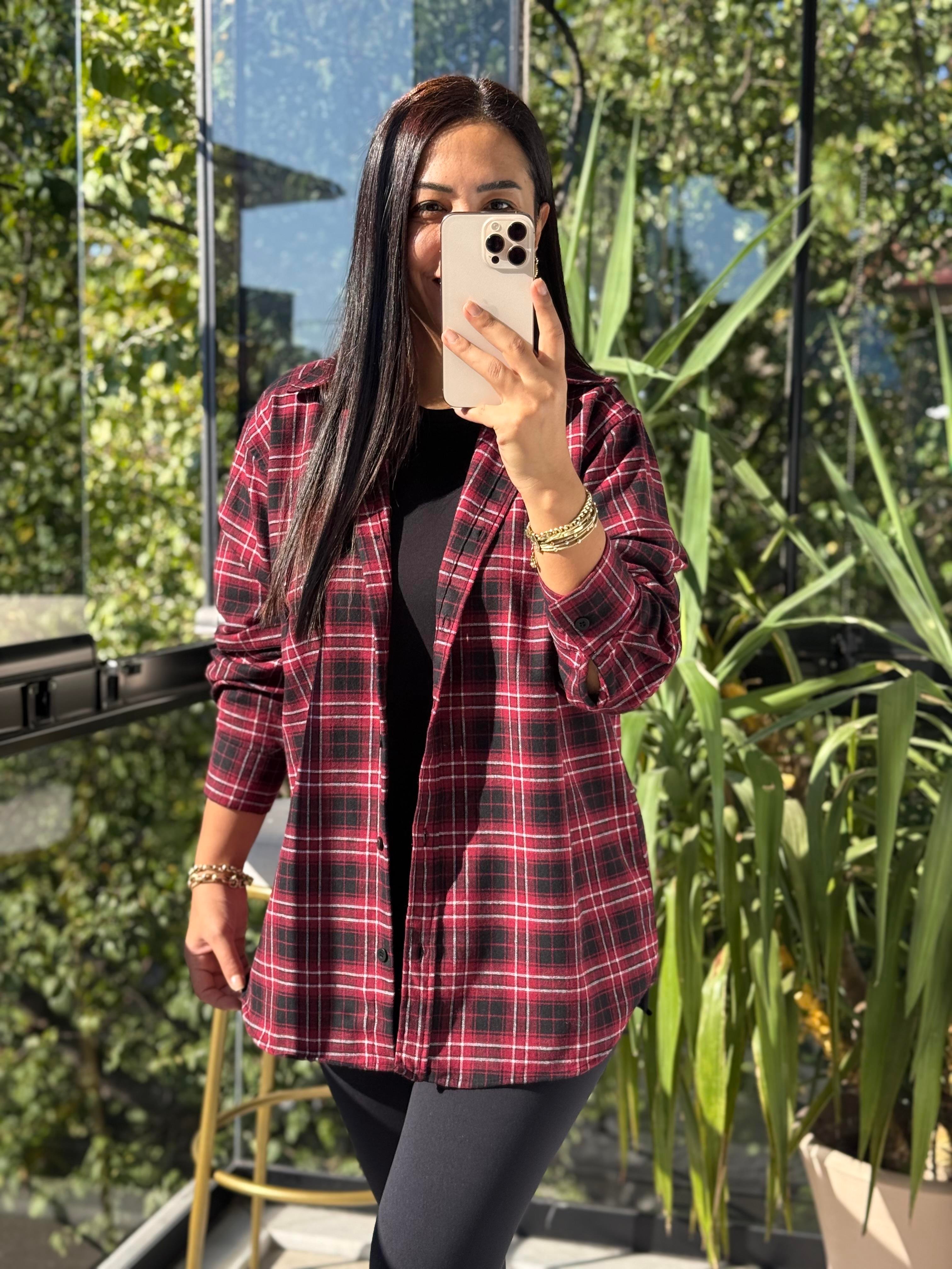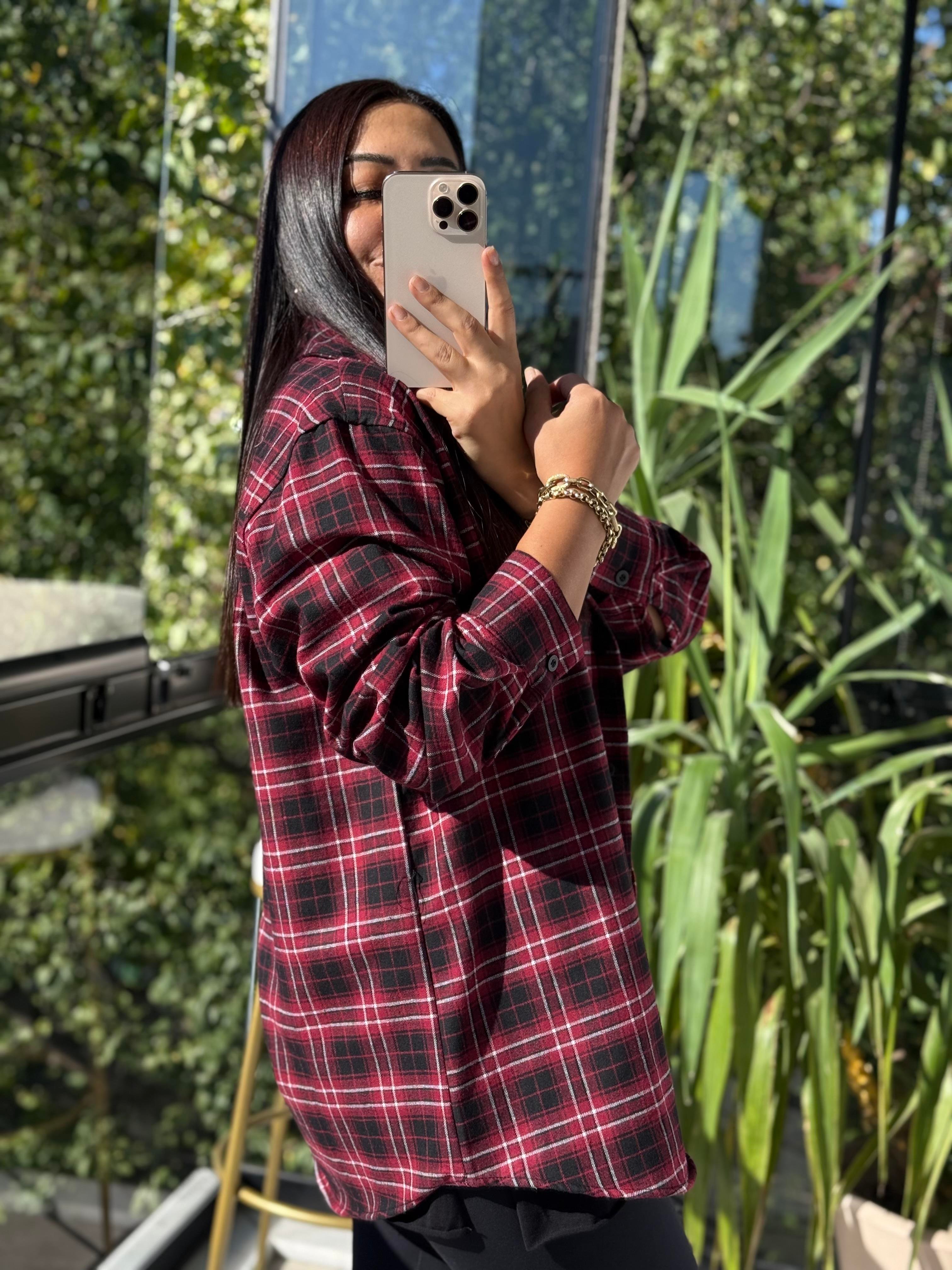 Ekoseli Oversize Gömlek Bordo