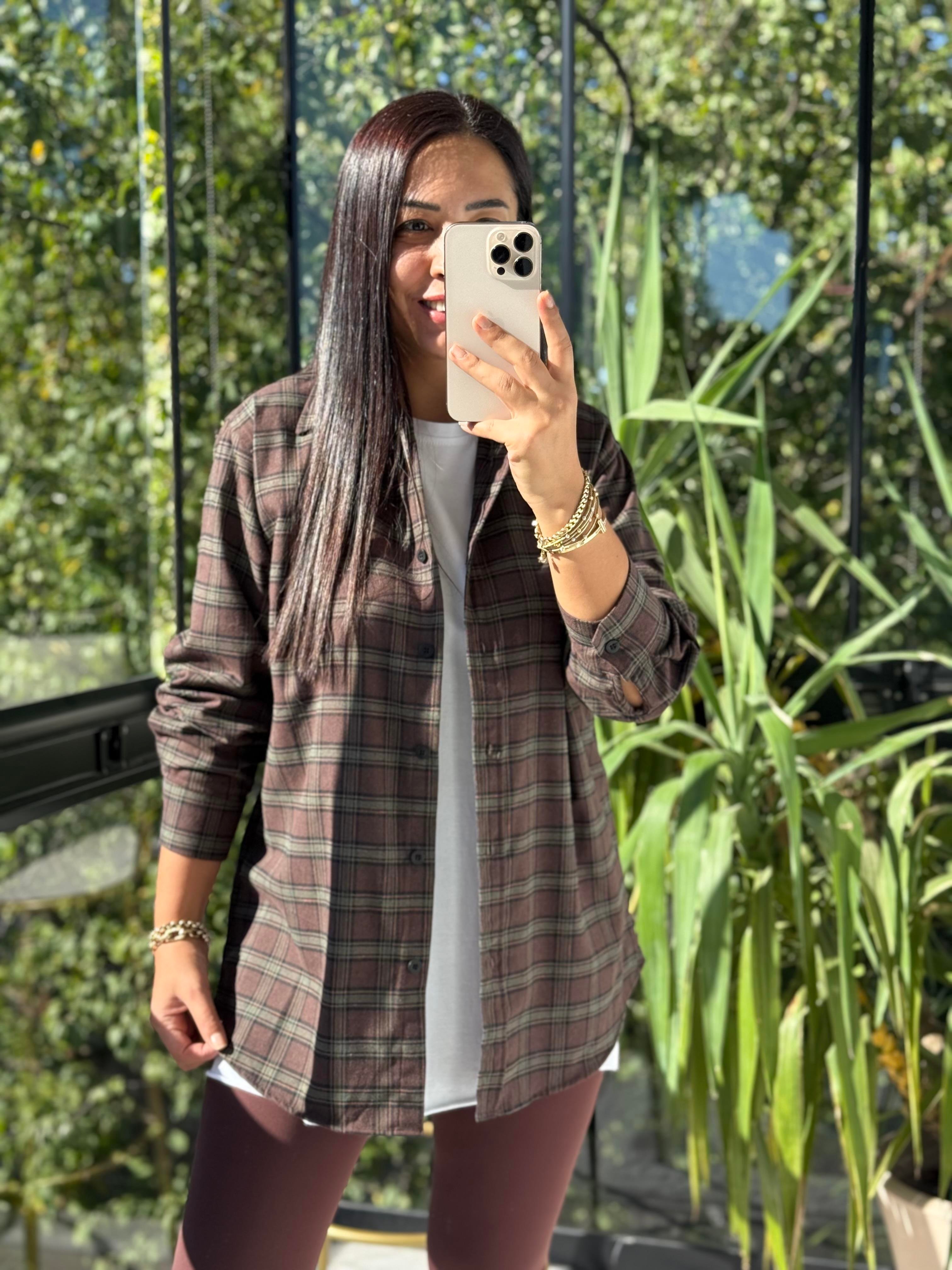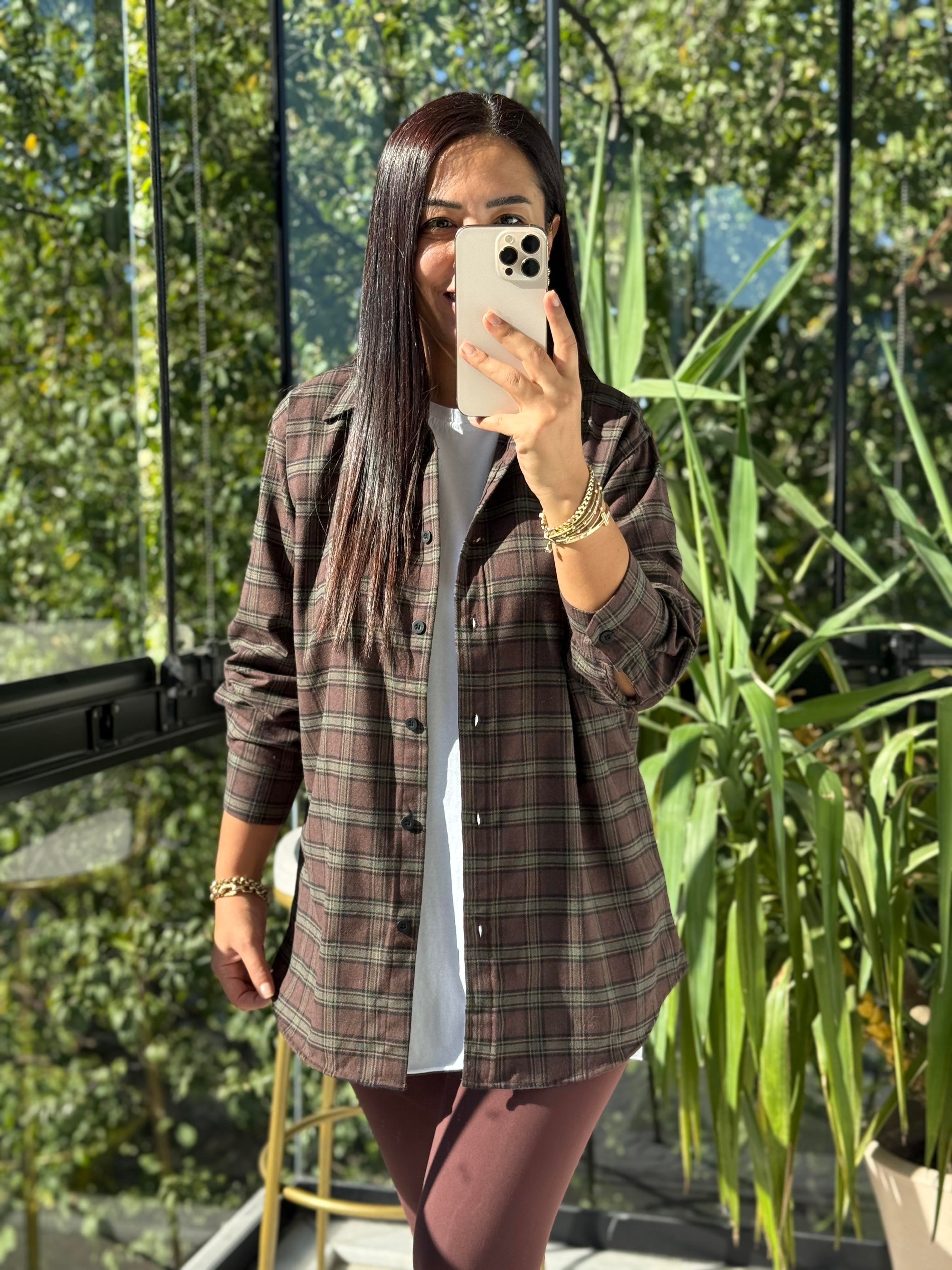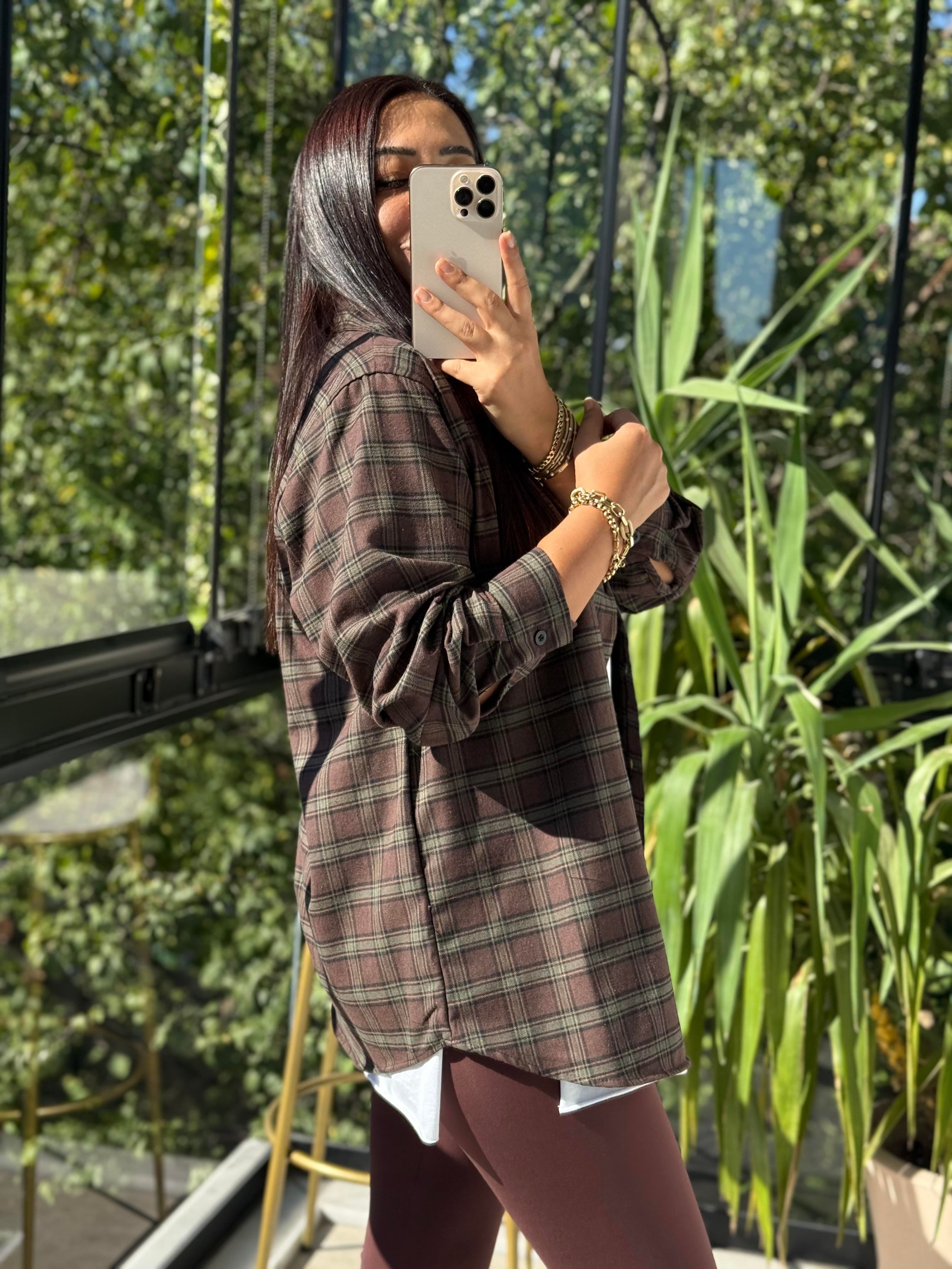 Ekoseli Oversize Gömlek Koyu Kahve
