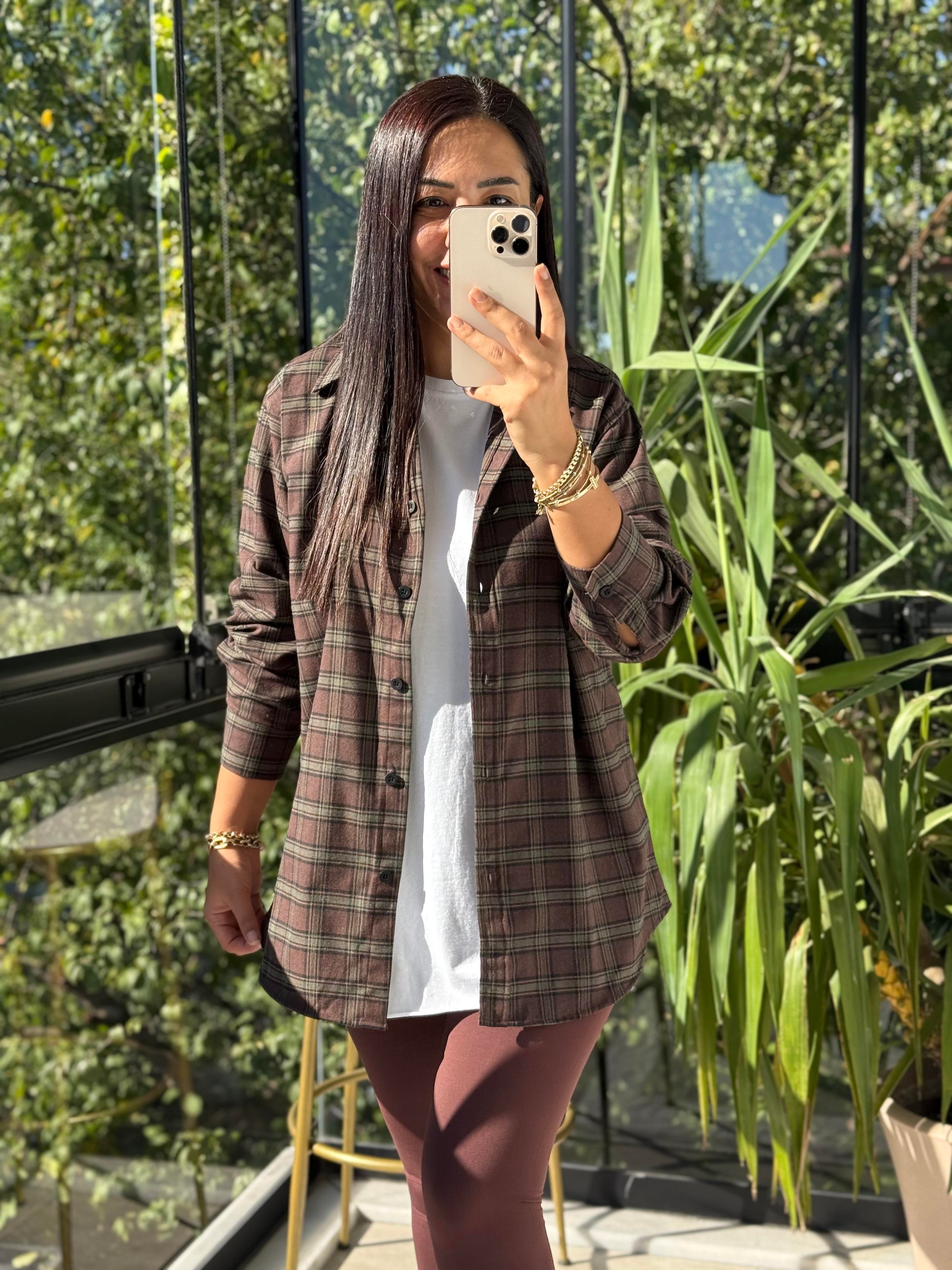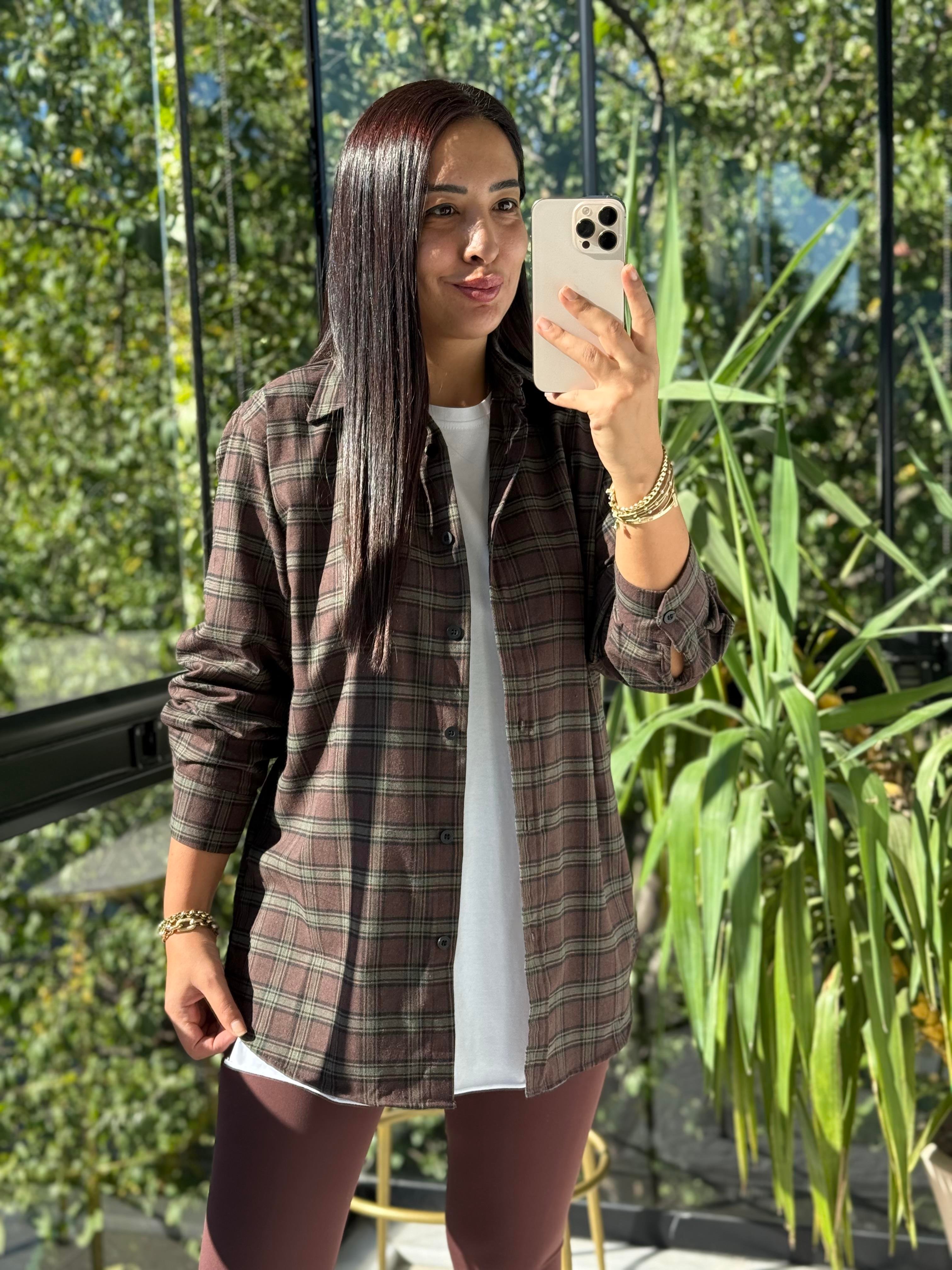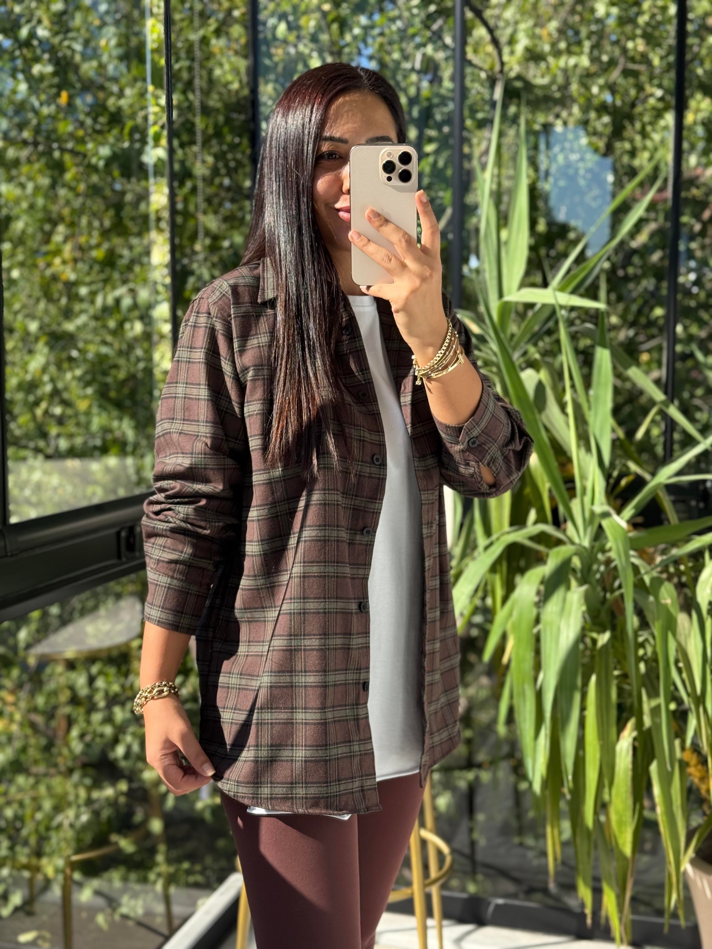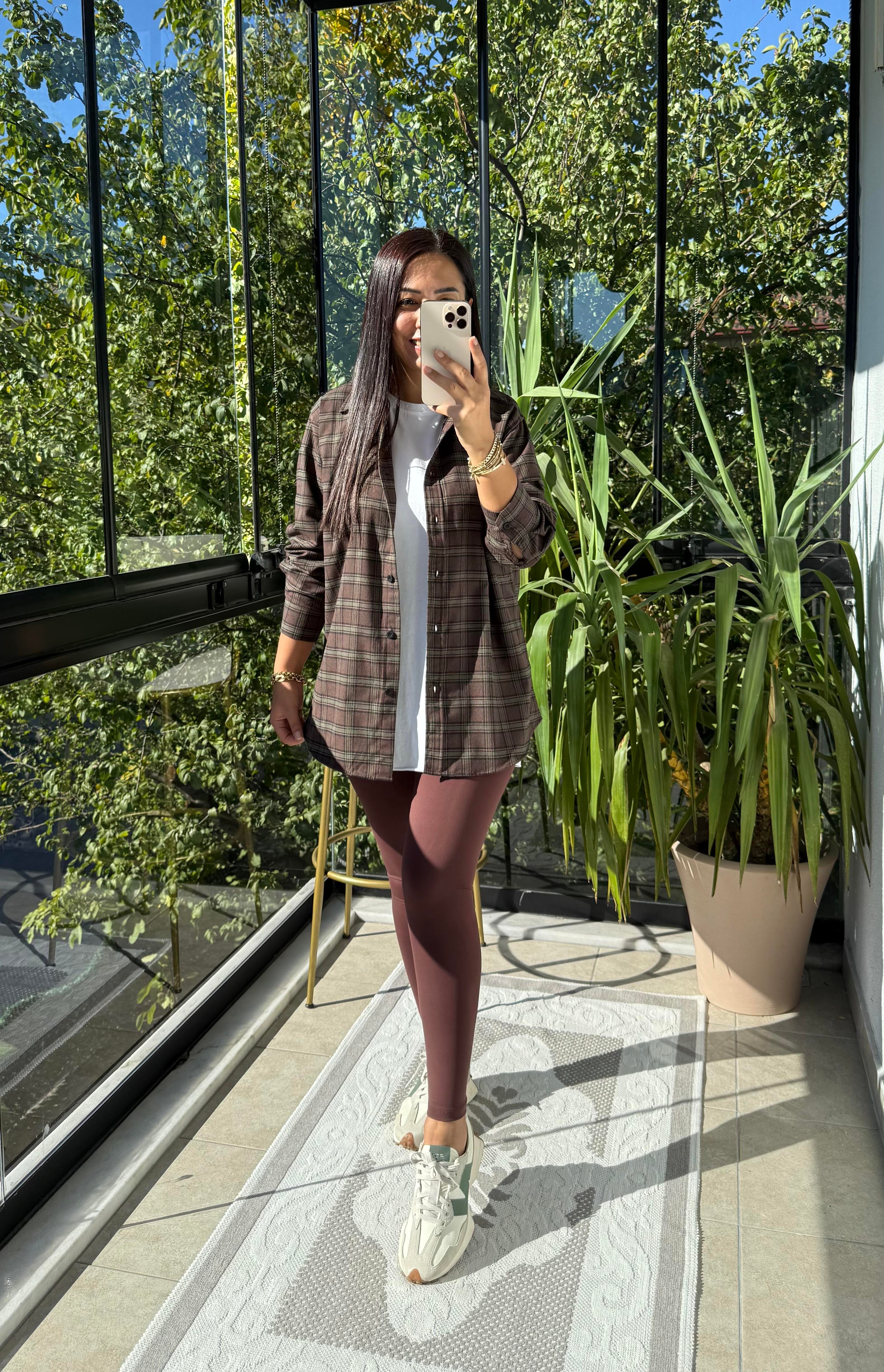 Ekoseli Oversize Gömlek Koyu Kahve