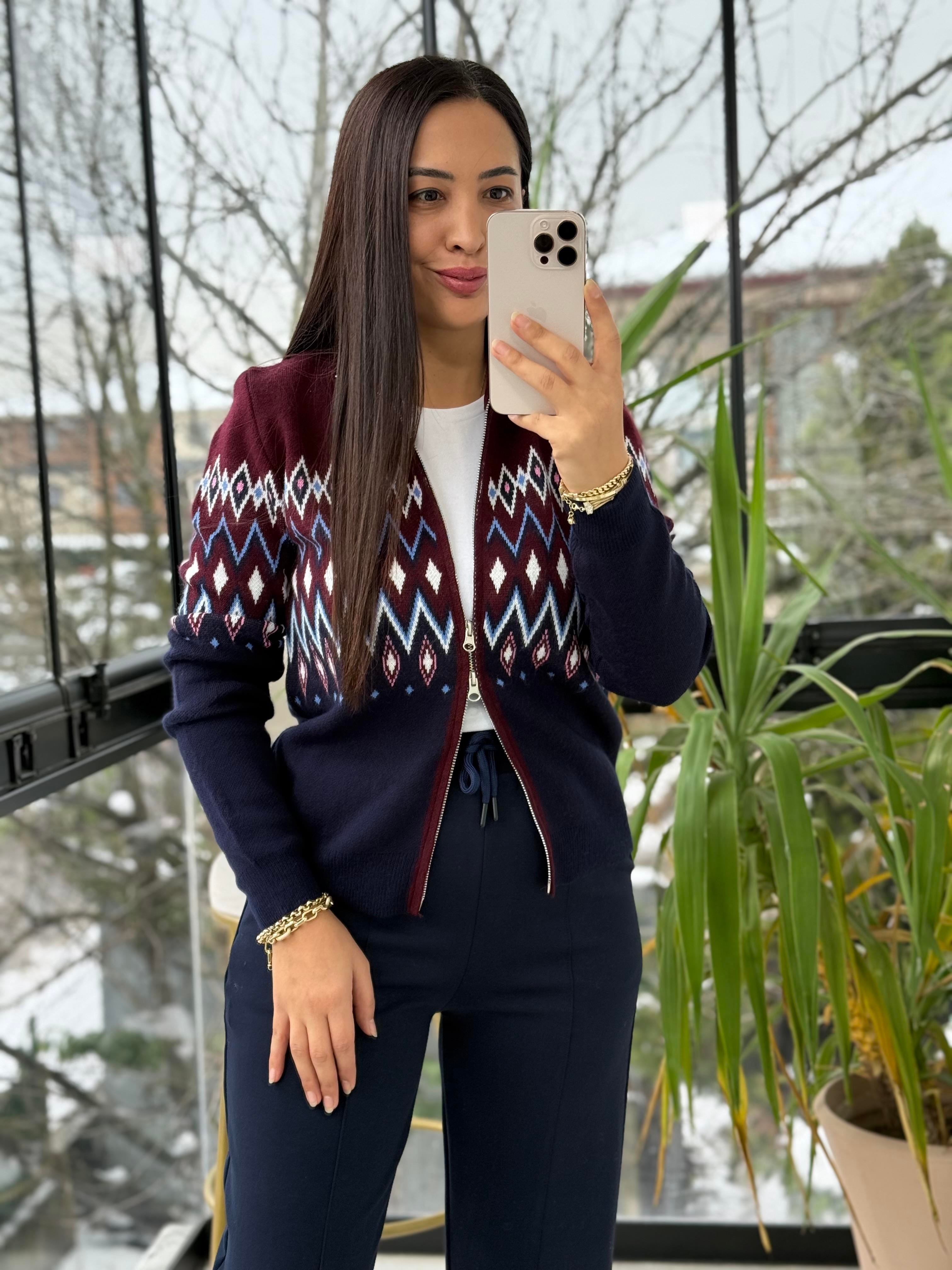 Geometrik Desenli Çift fermuarlı Hırka Lacivert