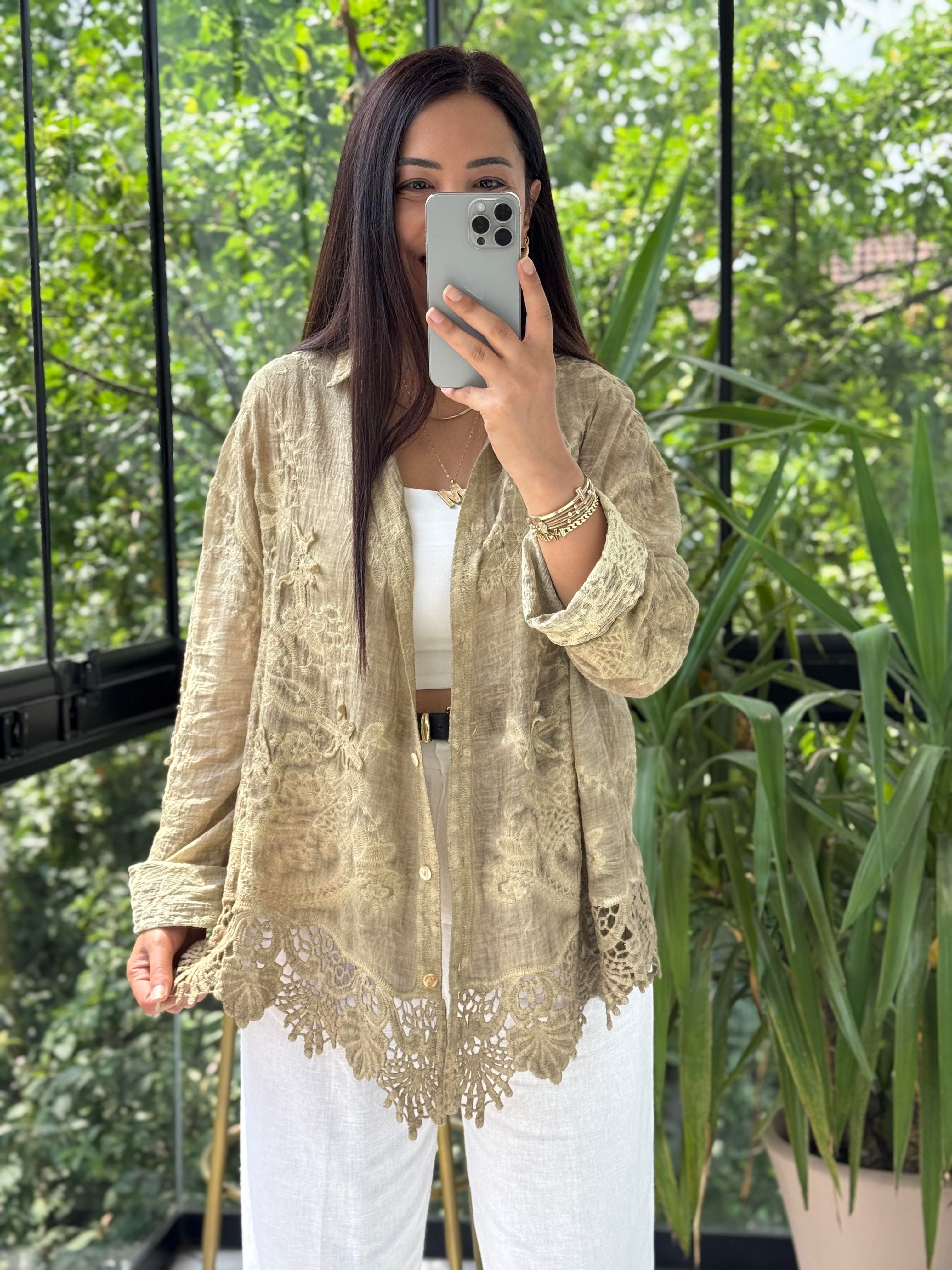 Güpür Detaylı Etnik Gömlek İndigo Mavi Güpür Detaylı Etnik Gömlek Yeşil Güpür Detaylı Etnik Gömlek Vizon