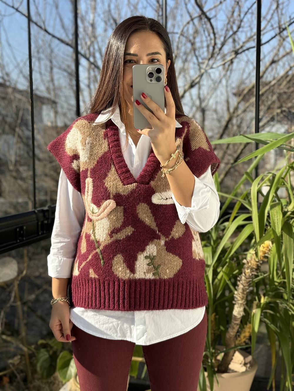 İşlemeli Tasarım Süveter Bordo
