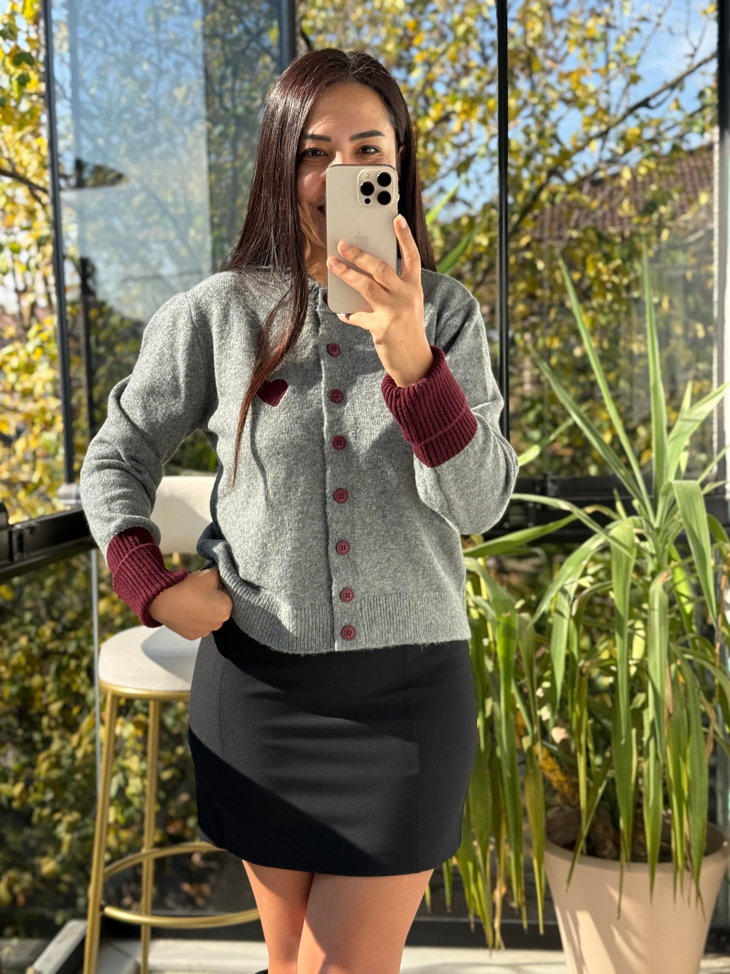 Kalp Nakışlı Renk Bloklu Hırka Gri