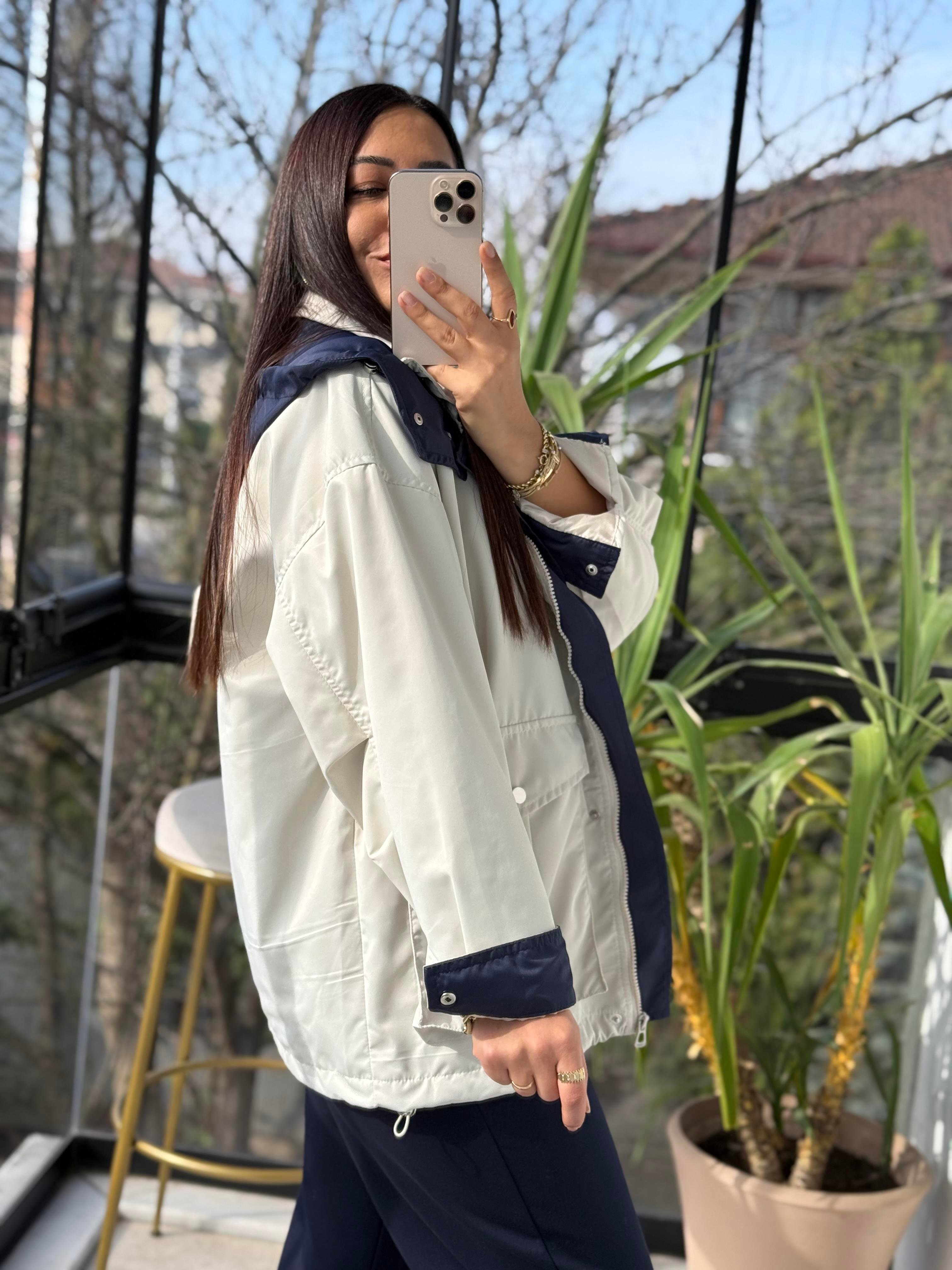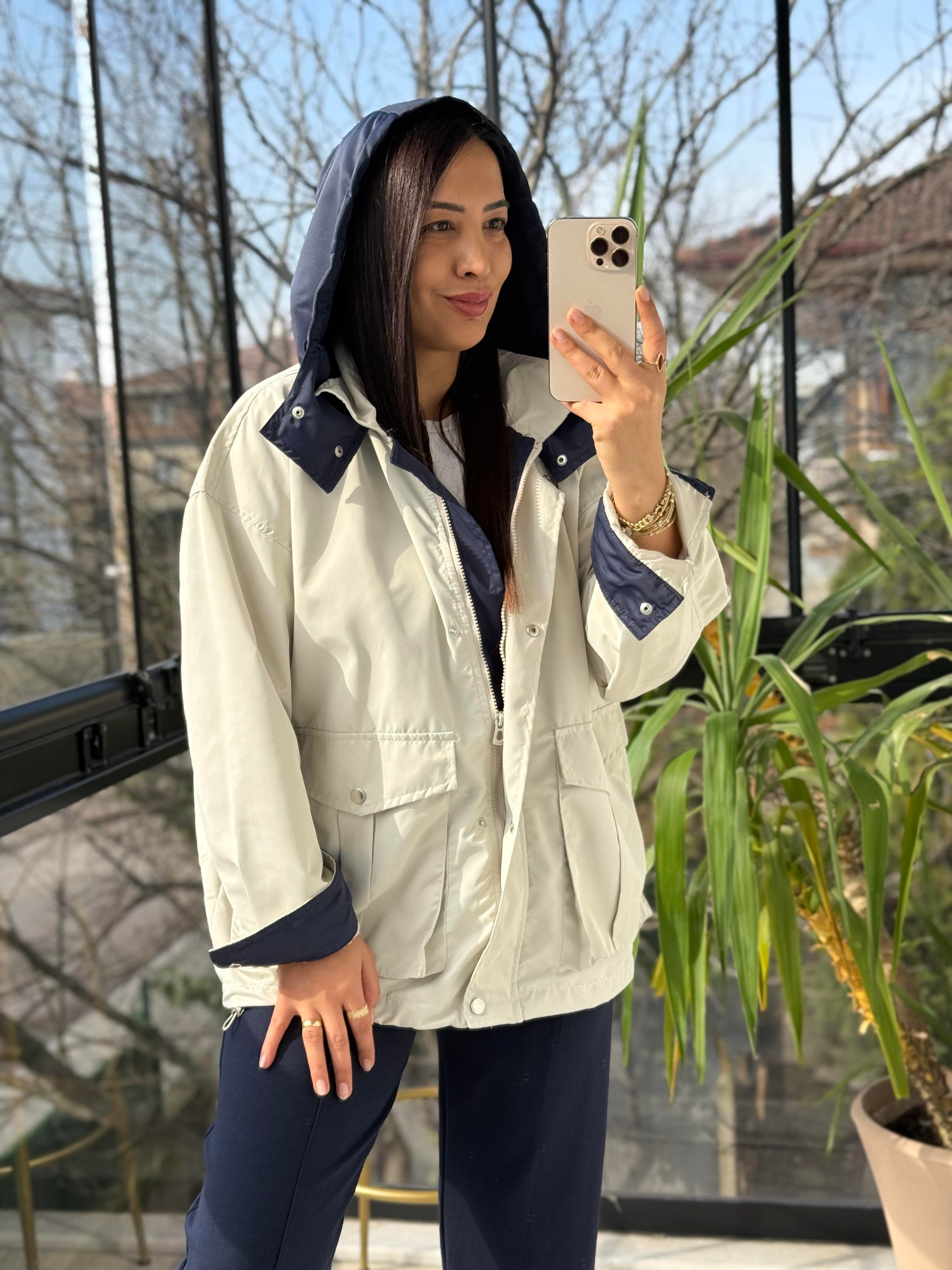 Kontrast Kapüşonlu Yağmurluk Taş