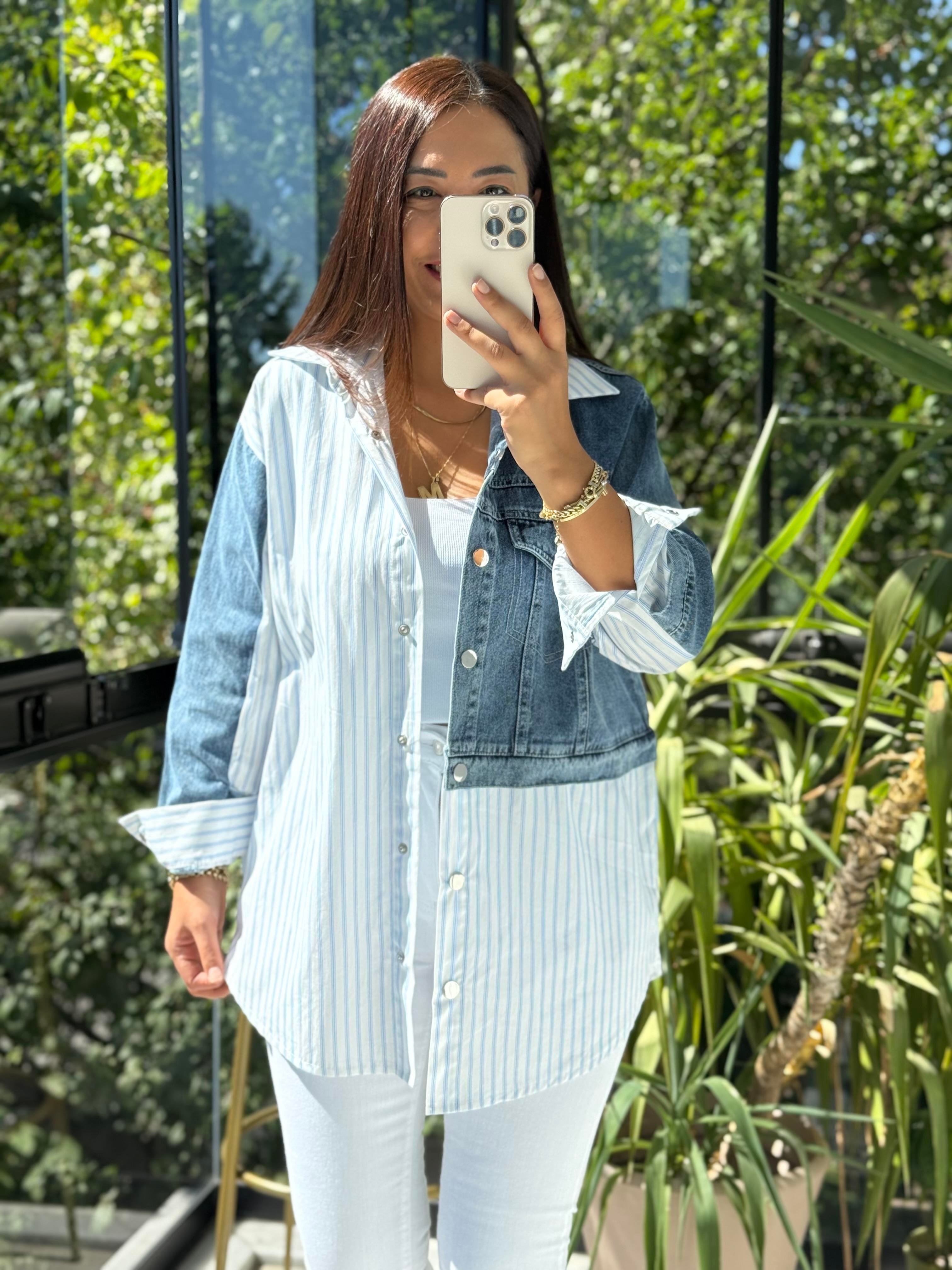 Kot Detaylı Çizgili Poplin Gömlek Mavi