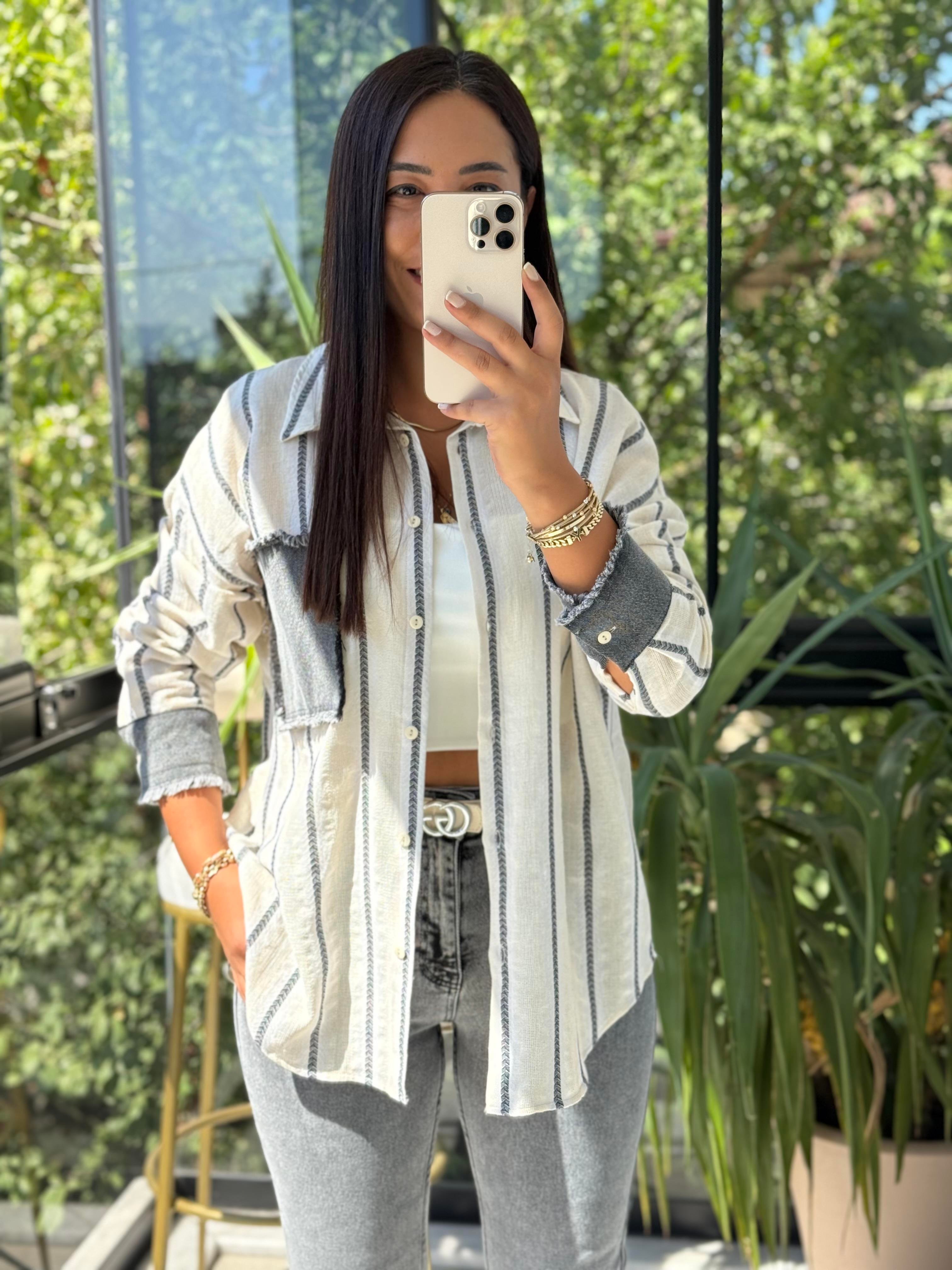 Kot Garnili İbiza Çizgili Keten Gömlek Natural