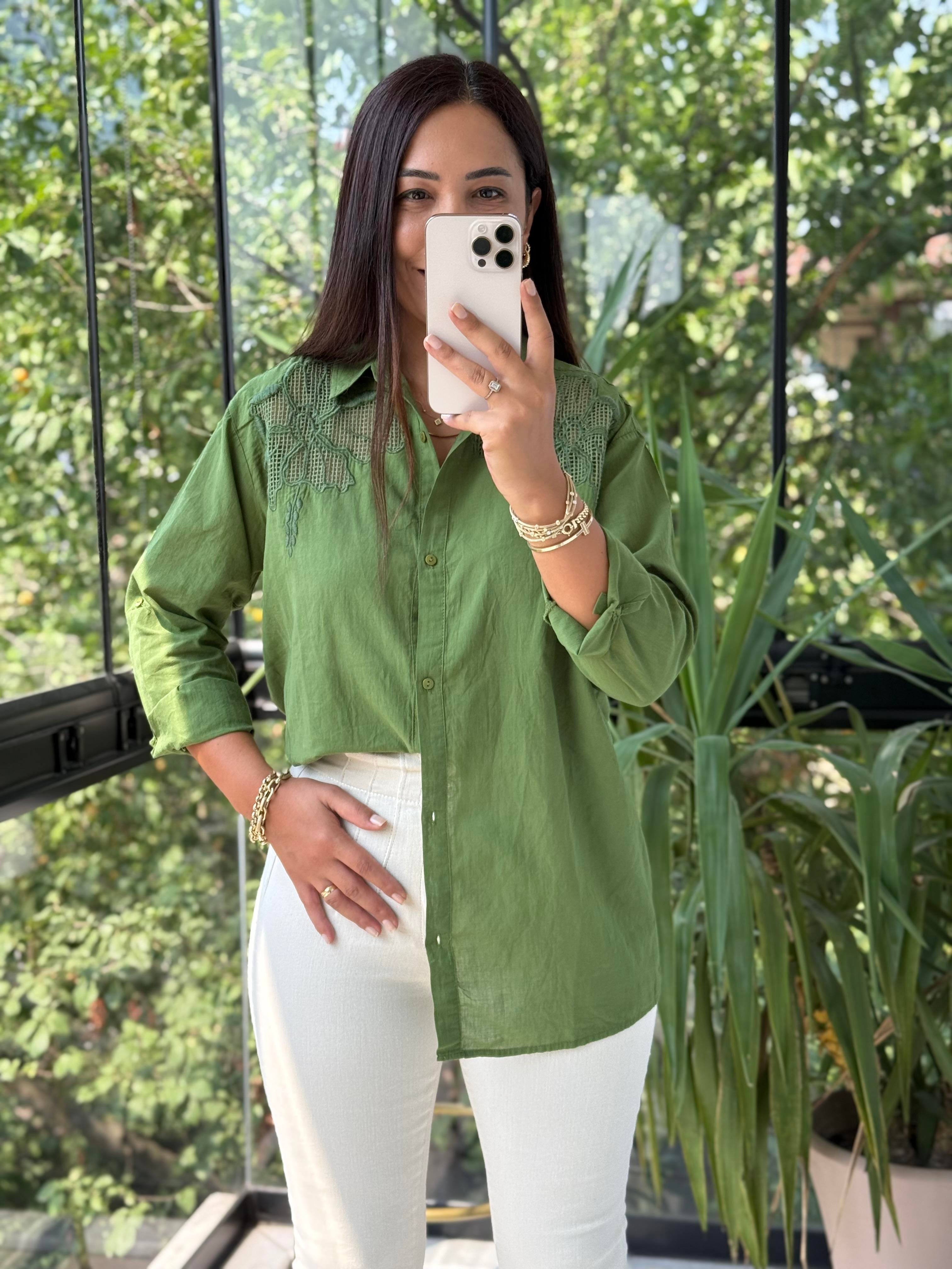 Omzu File Çiçekli Pamuklu Gömlek Haki Yeşili