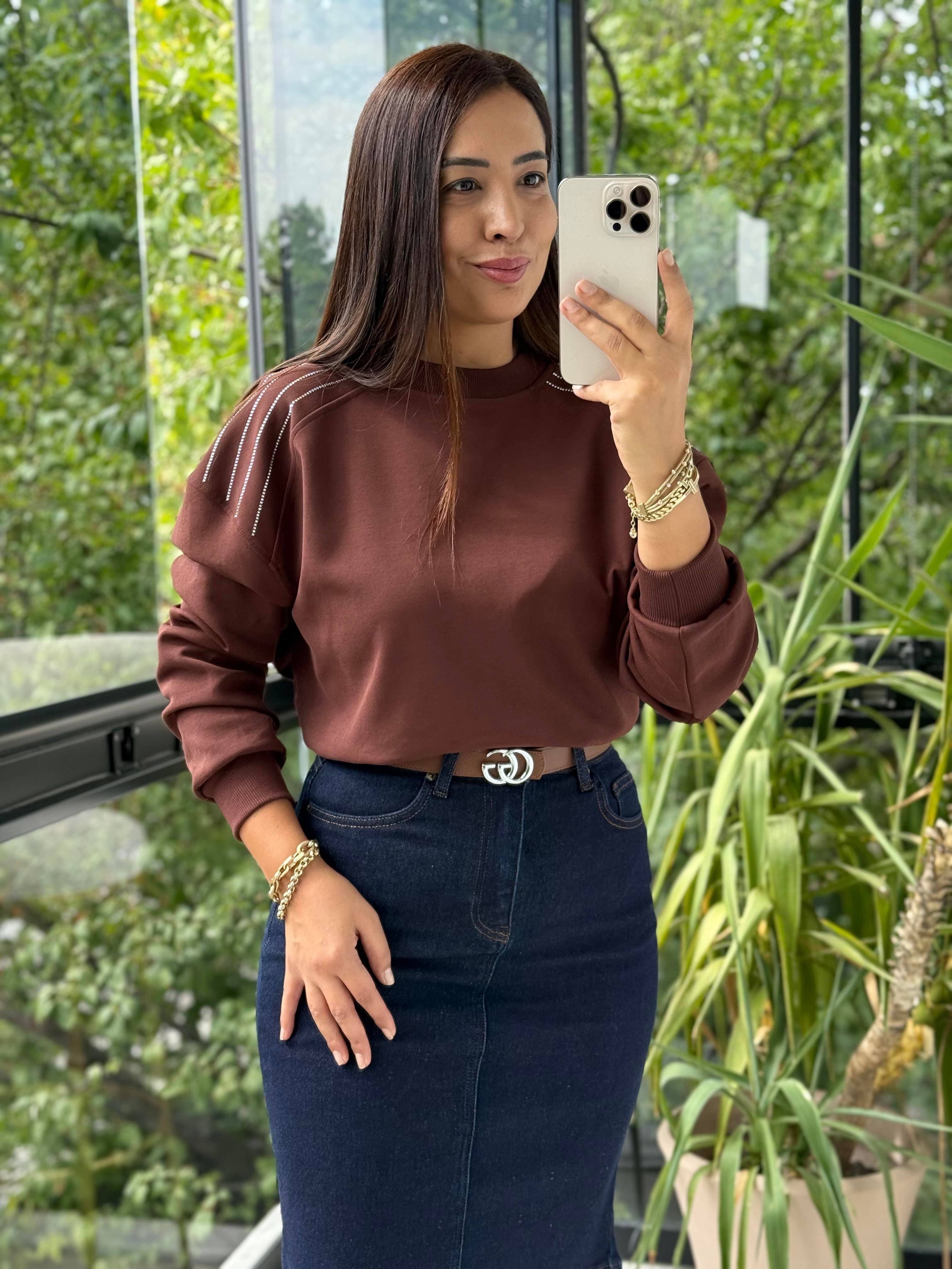 Omzu Sıra Taşlı Sweatshirt Kahve