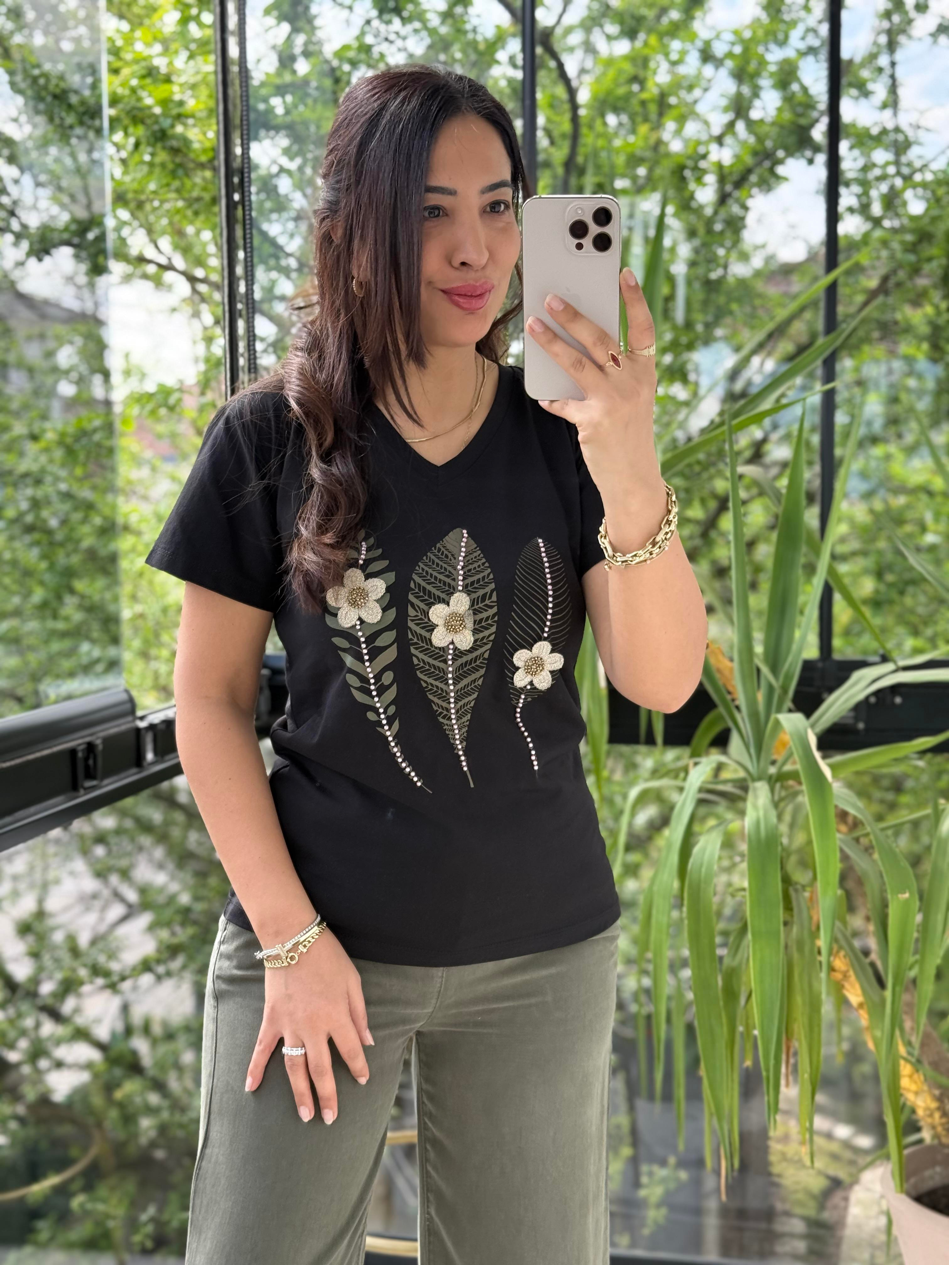 Önü Motif Yapraklı Tişört Siyah