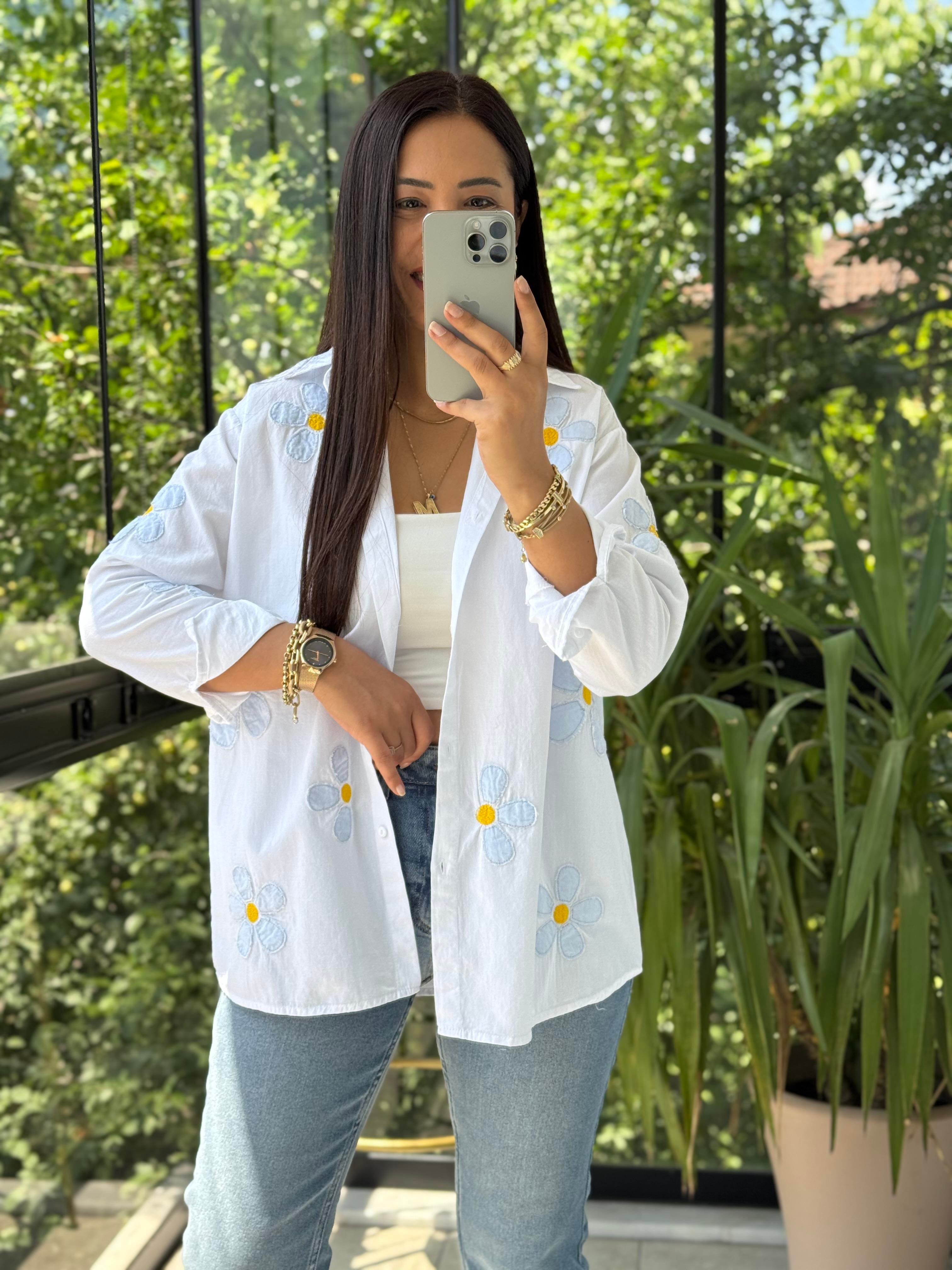 Papatya Detaylı Pamuklu Gömlek Beyaz