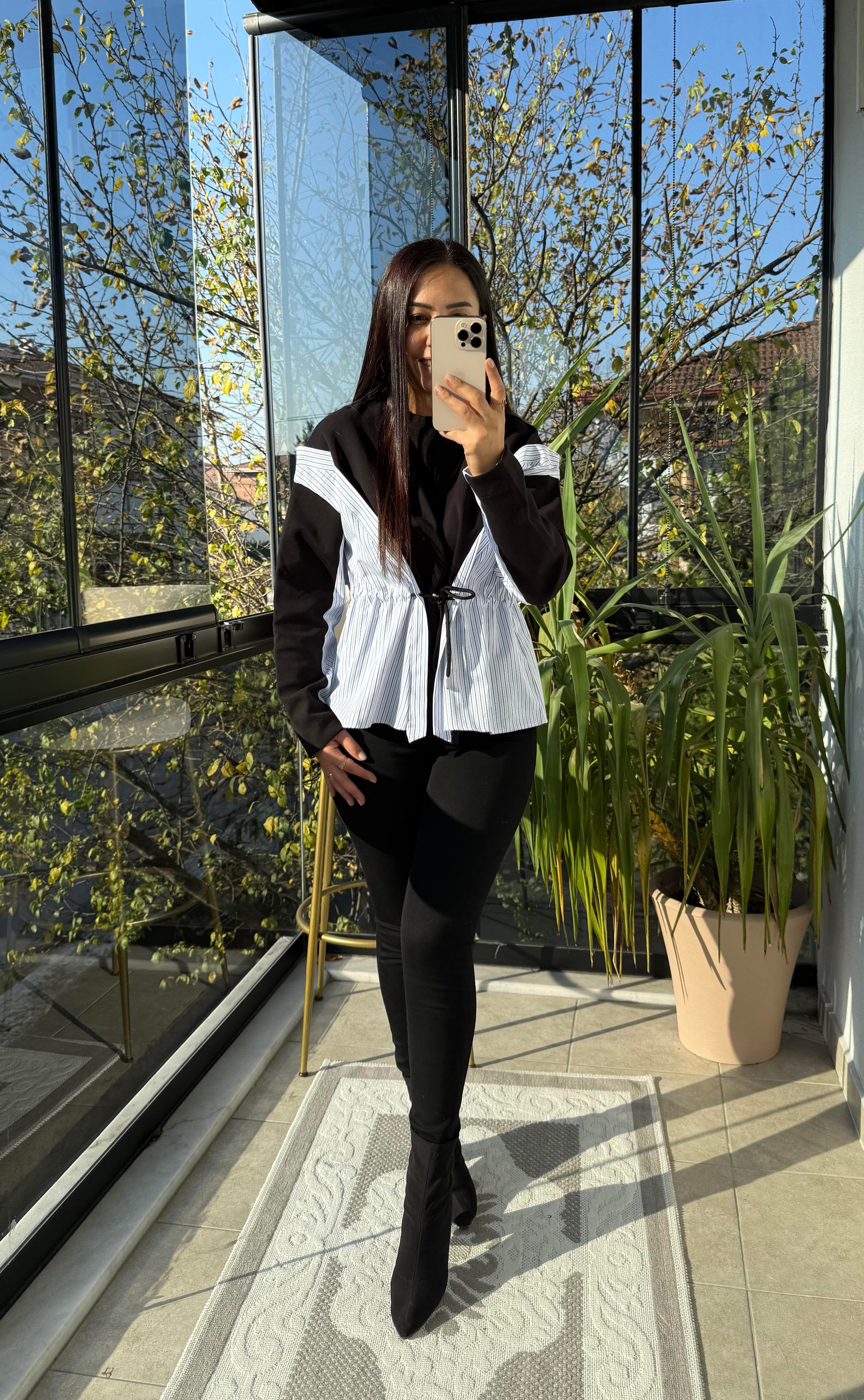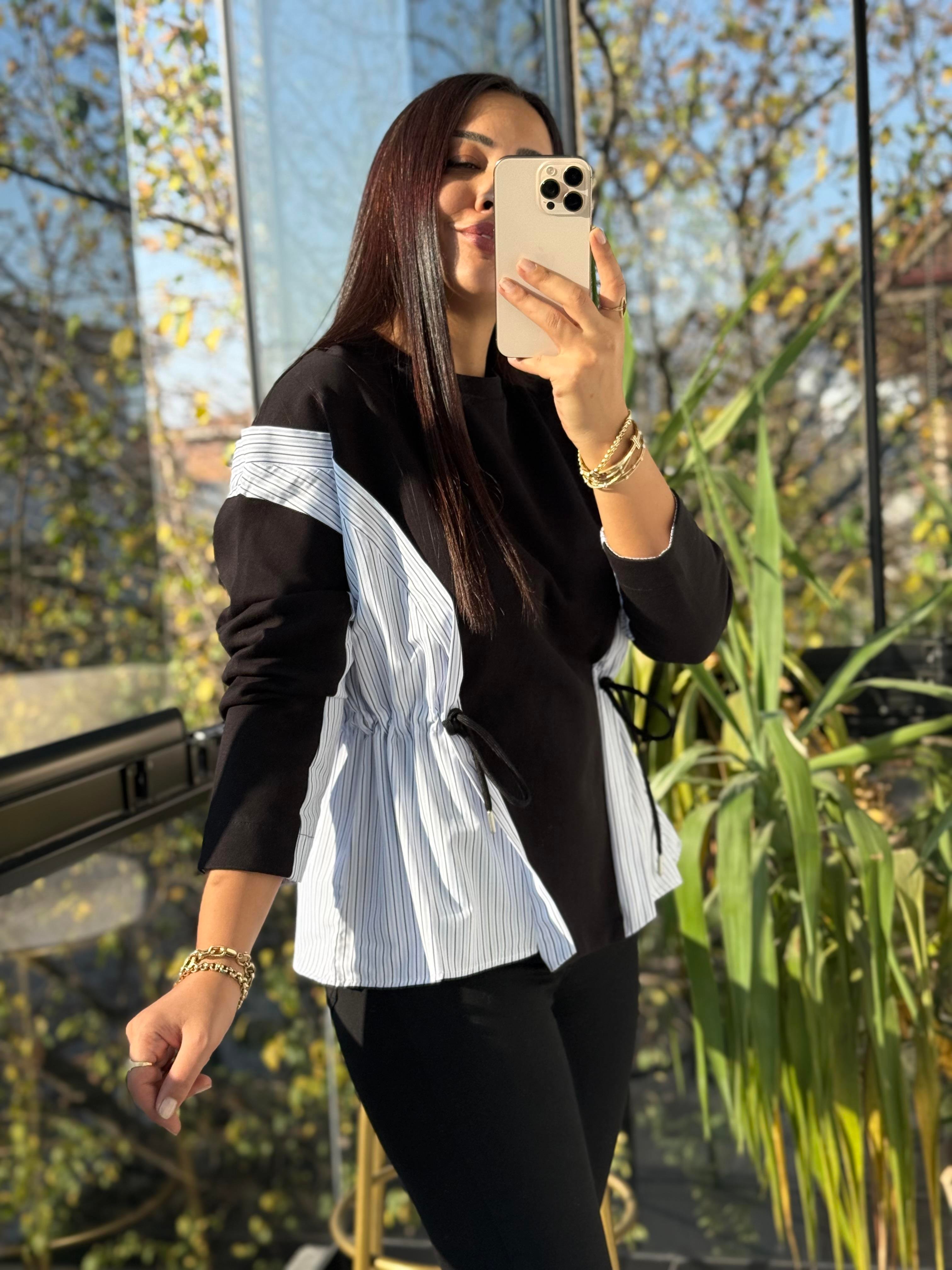 Parçalı Yanı Bağcıklı Sweatshirt Siyah