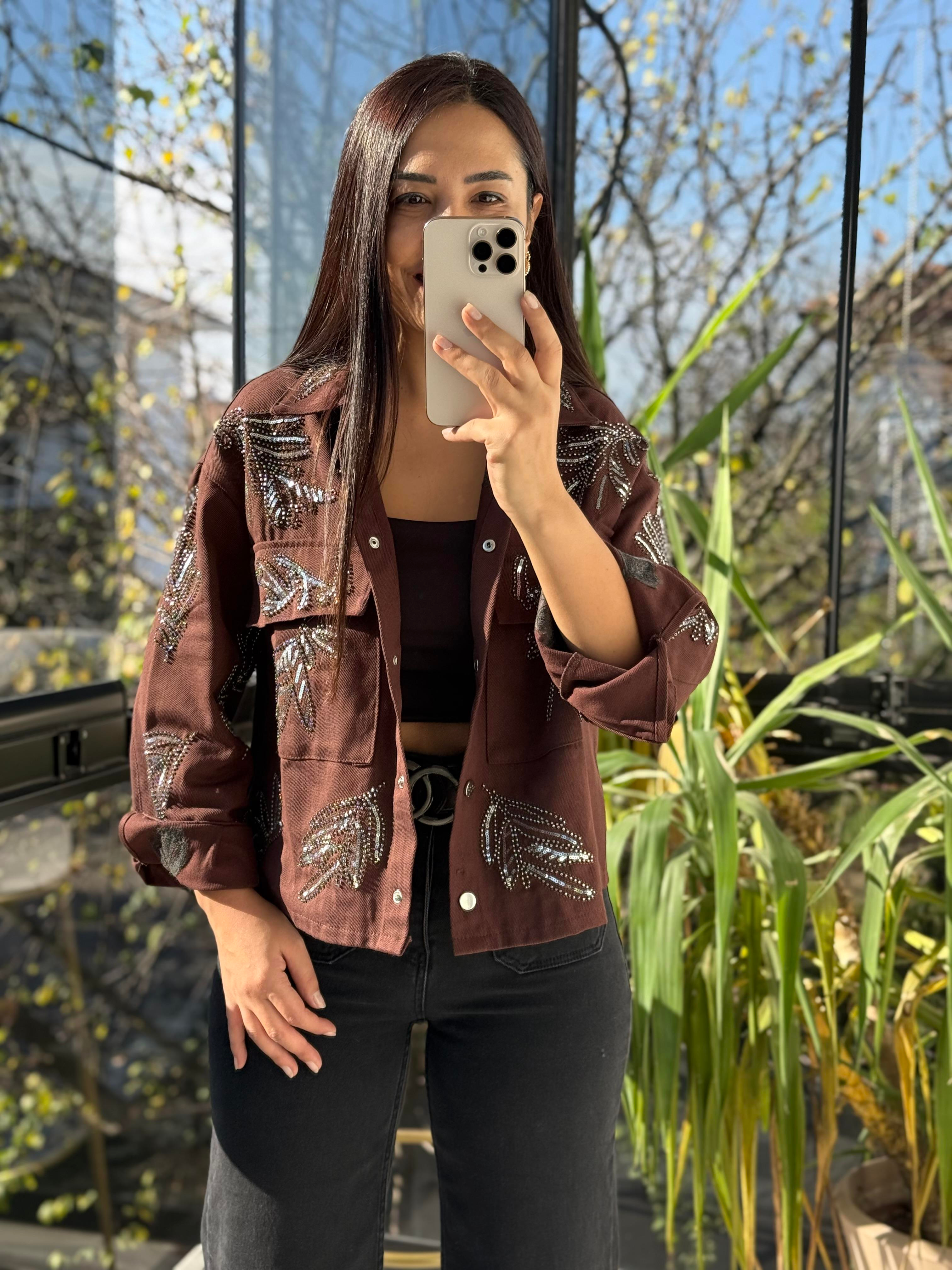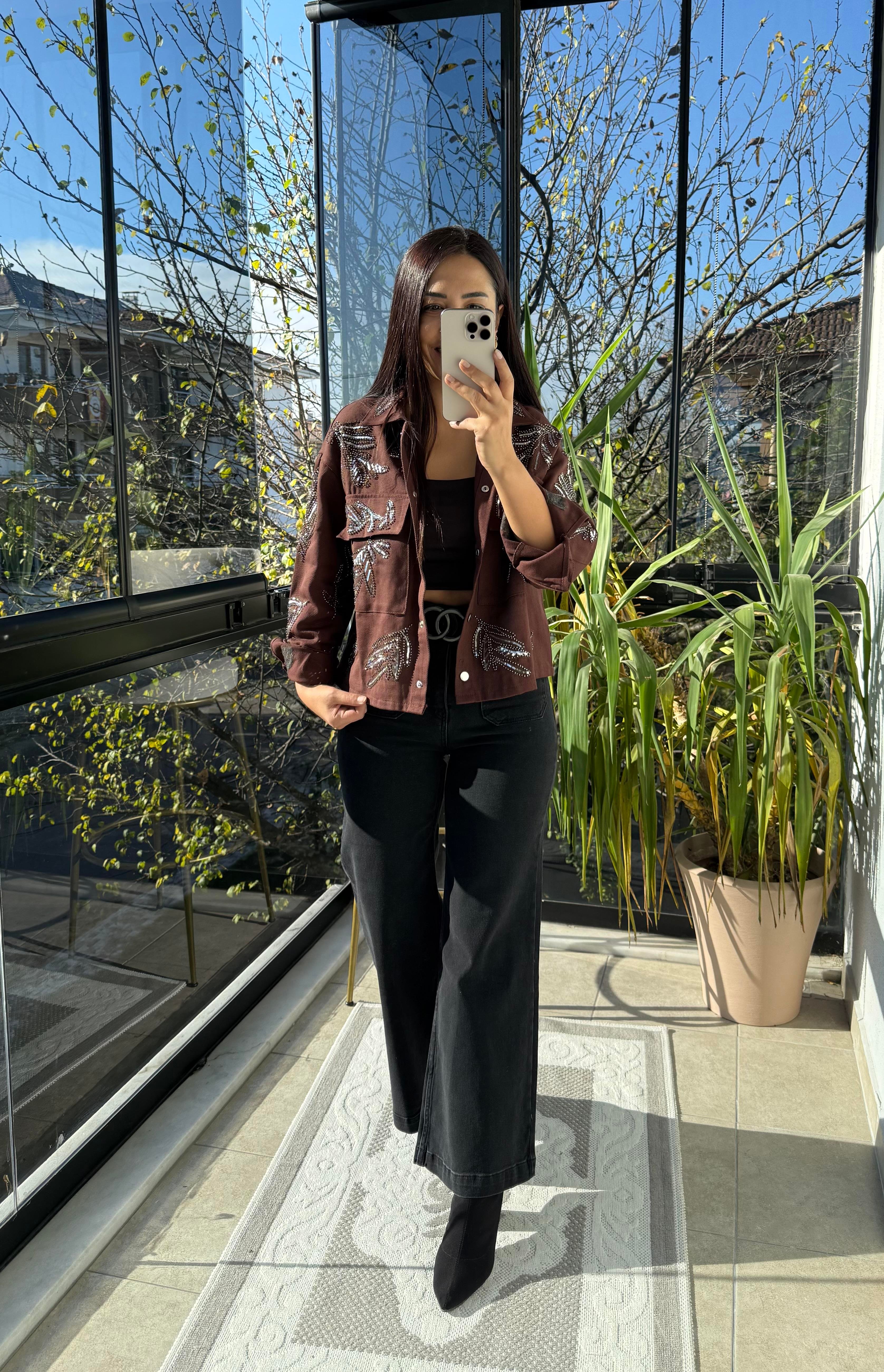 Payetli Boncuklu Kot Ceket Kahve