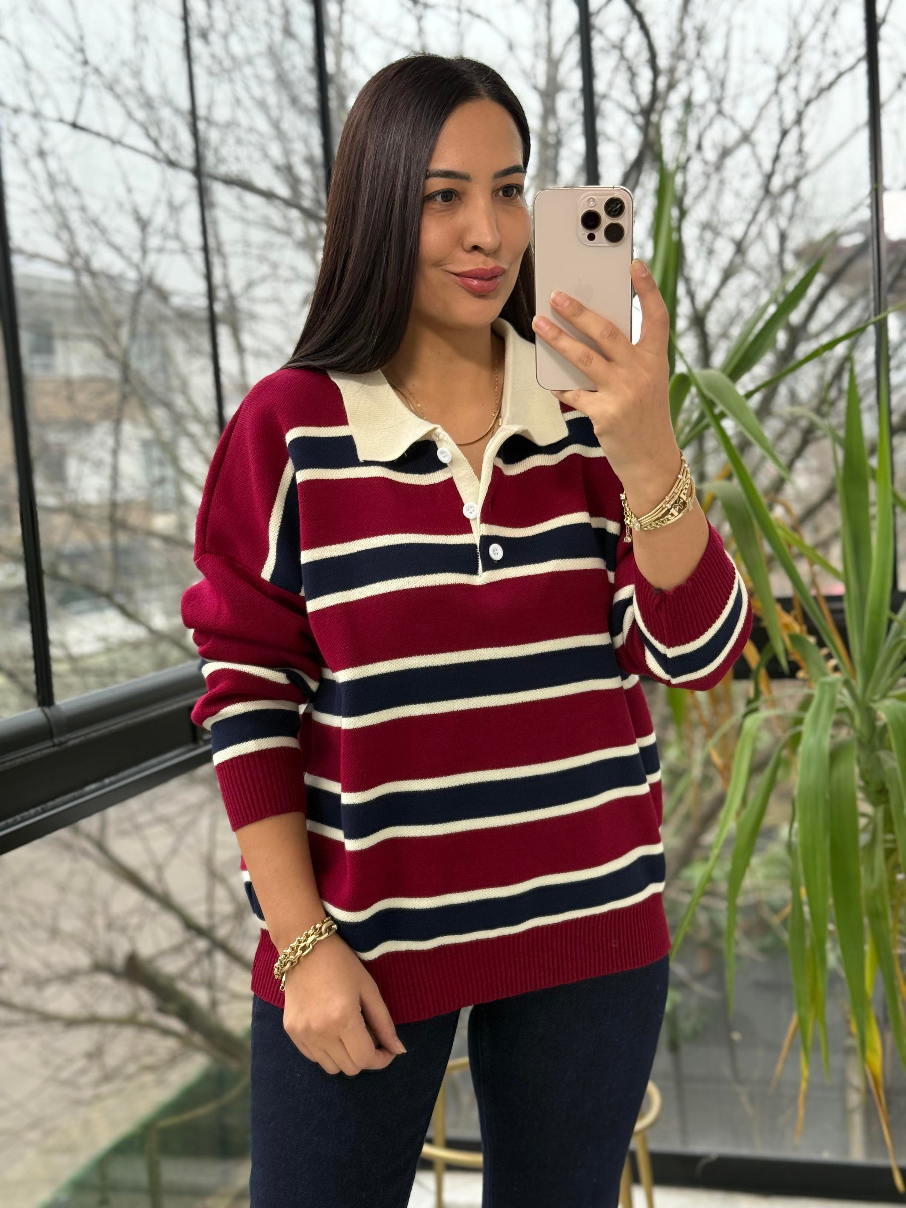 Polo Yaka Çizgili Triko Kazak Bordo