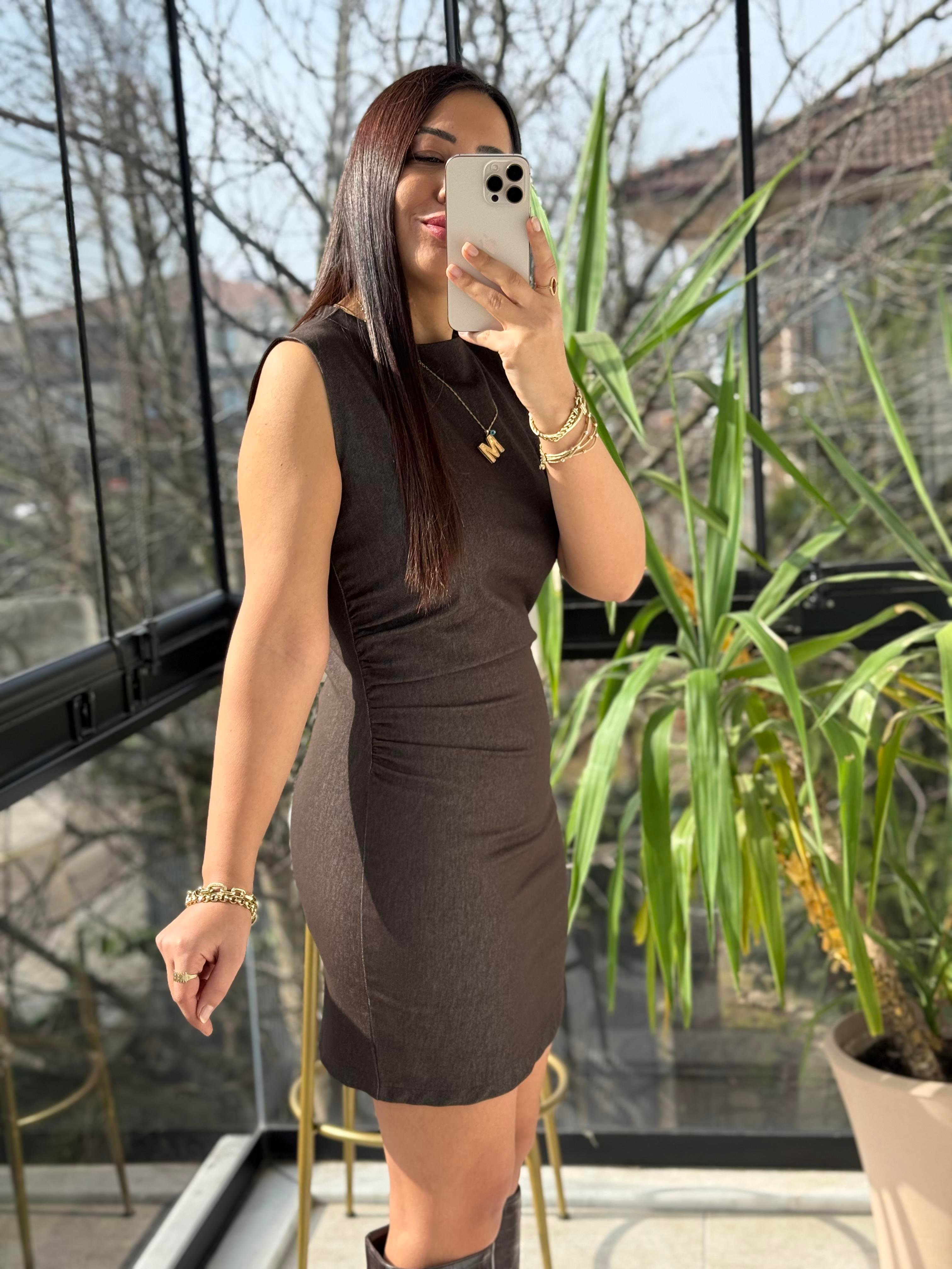 Sıfır Kol Yanı Büzgülü Elbise Kahve