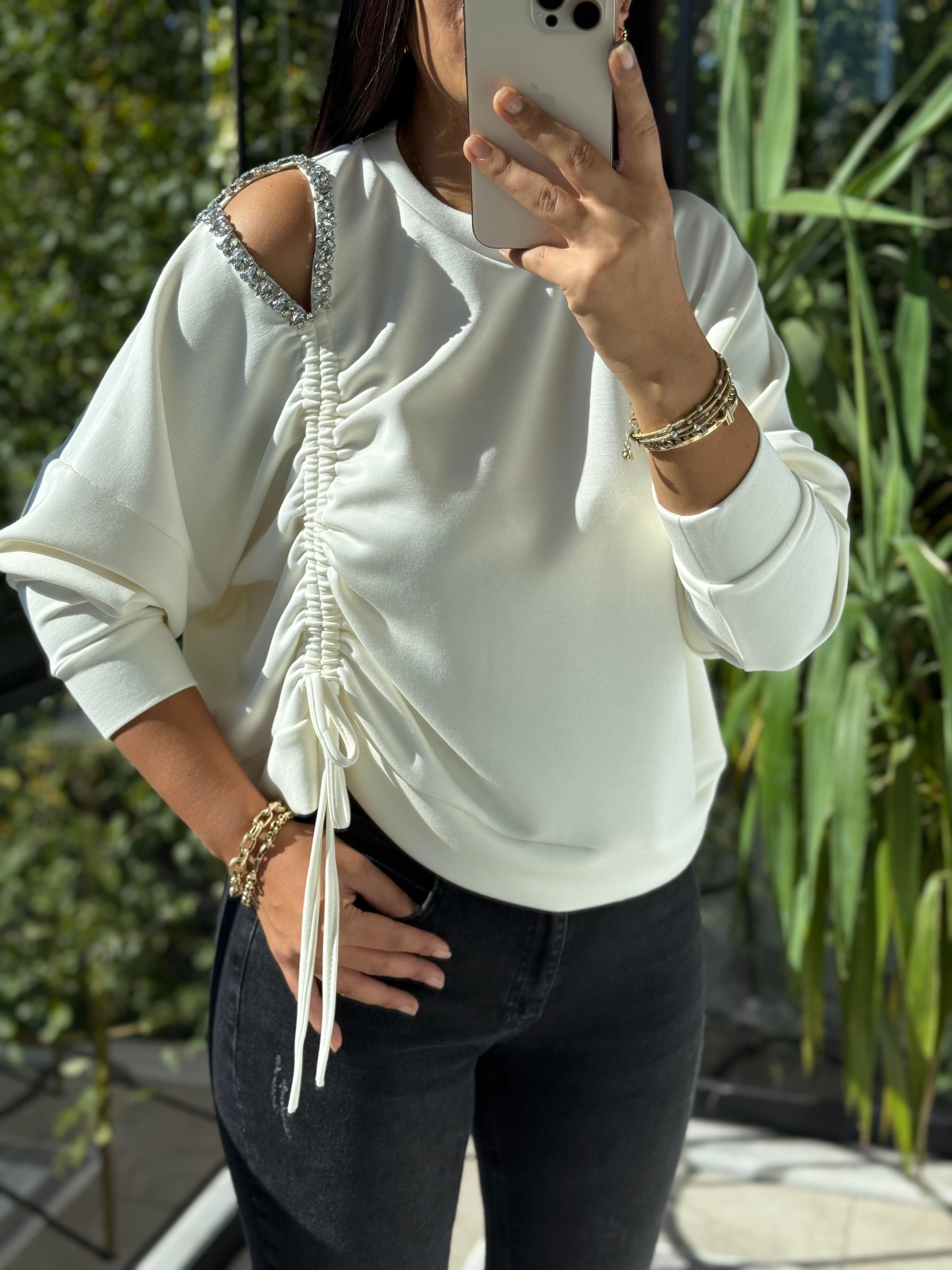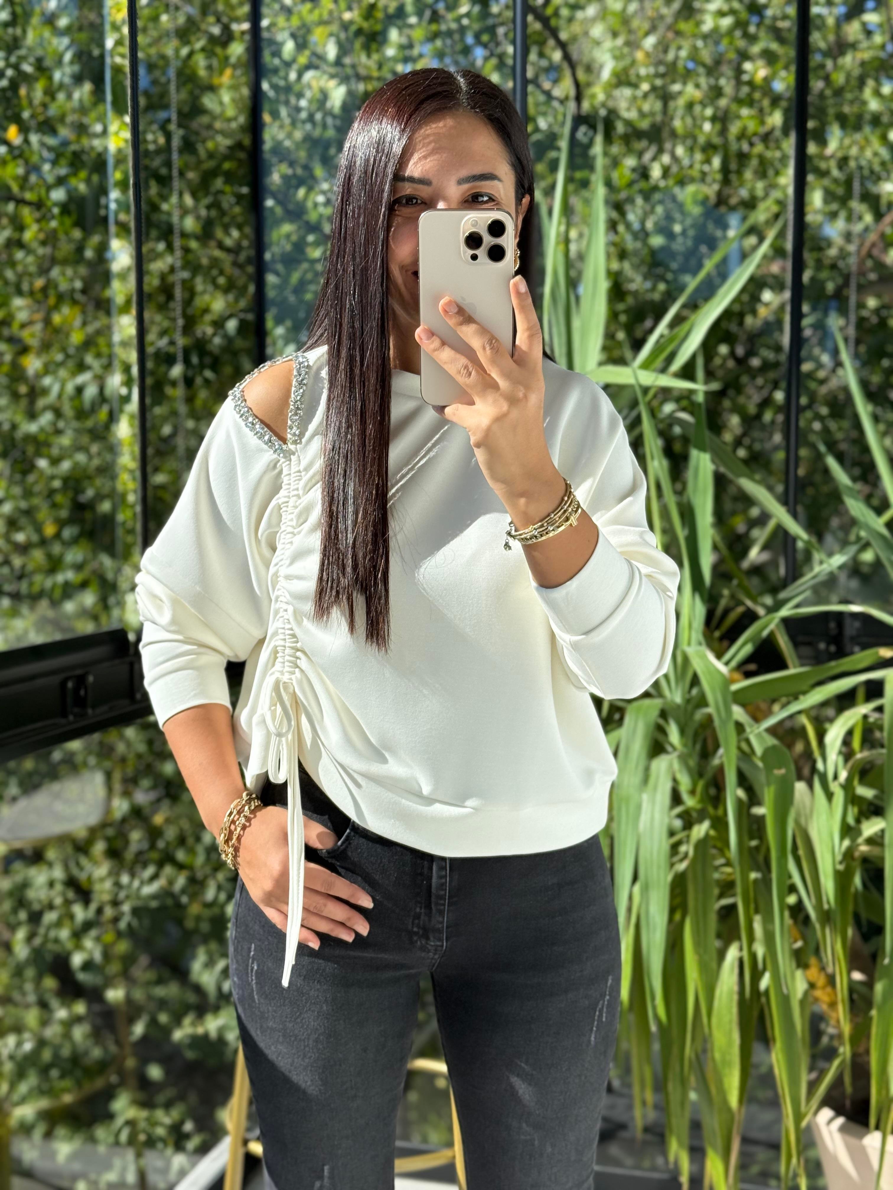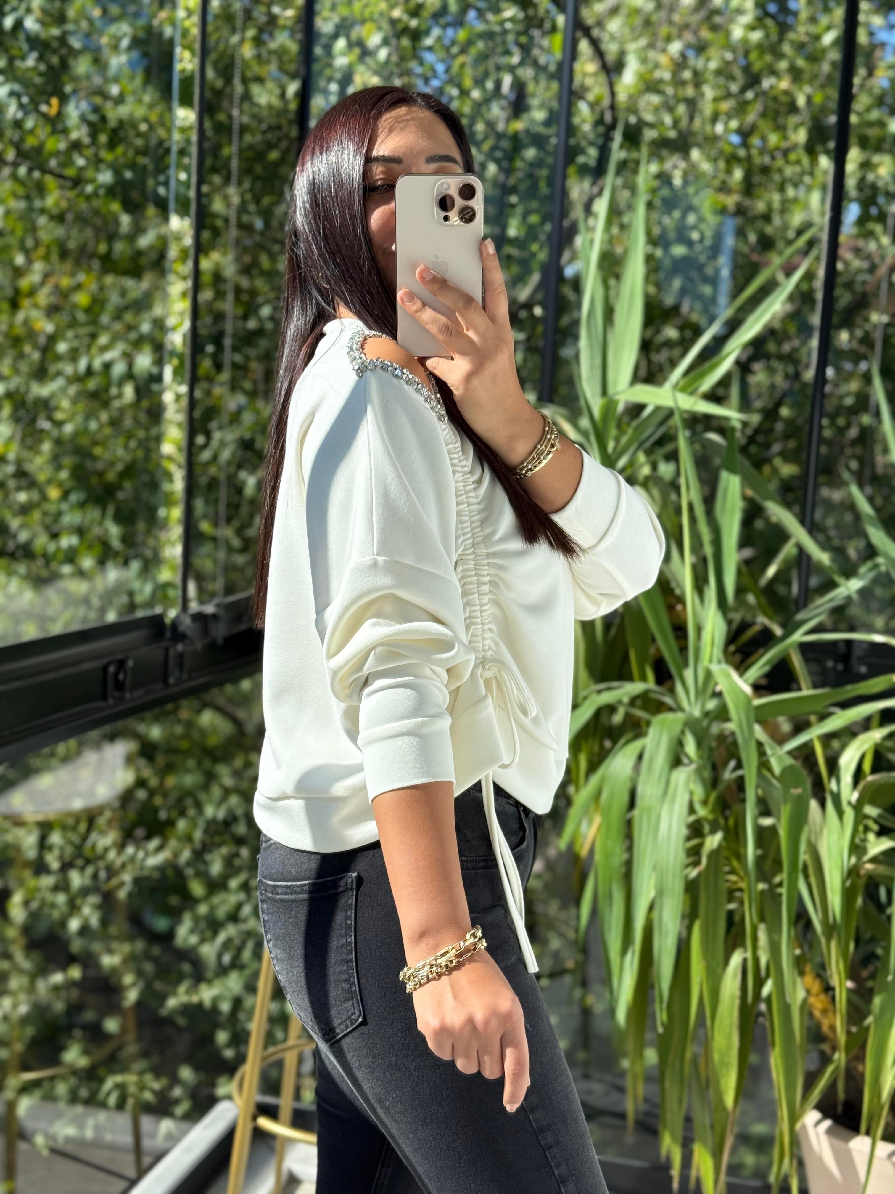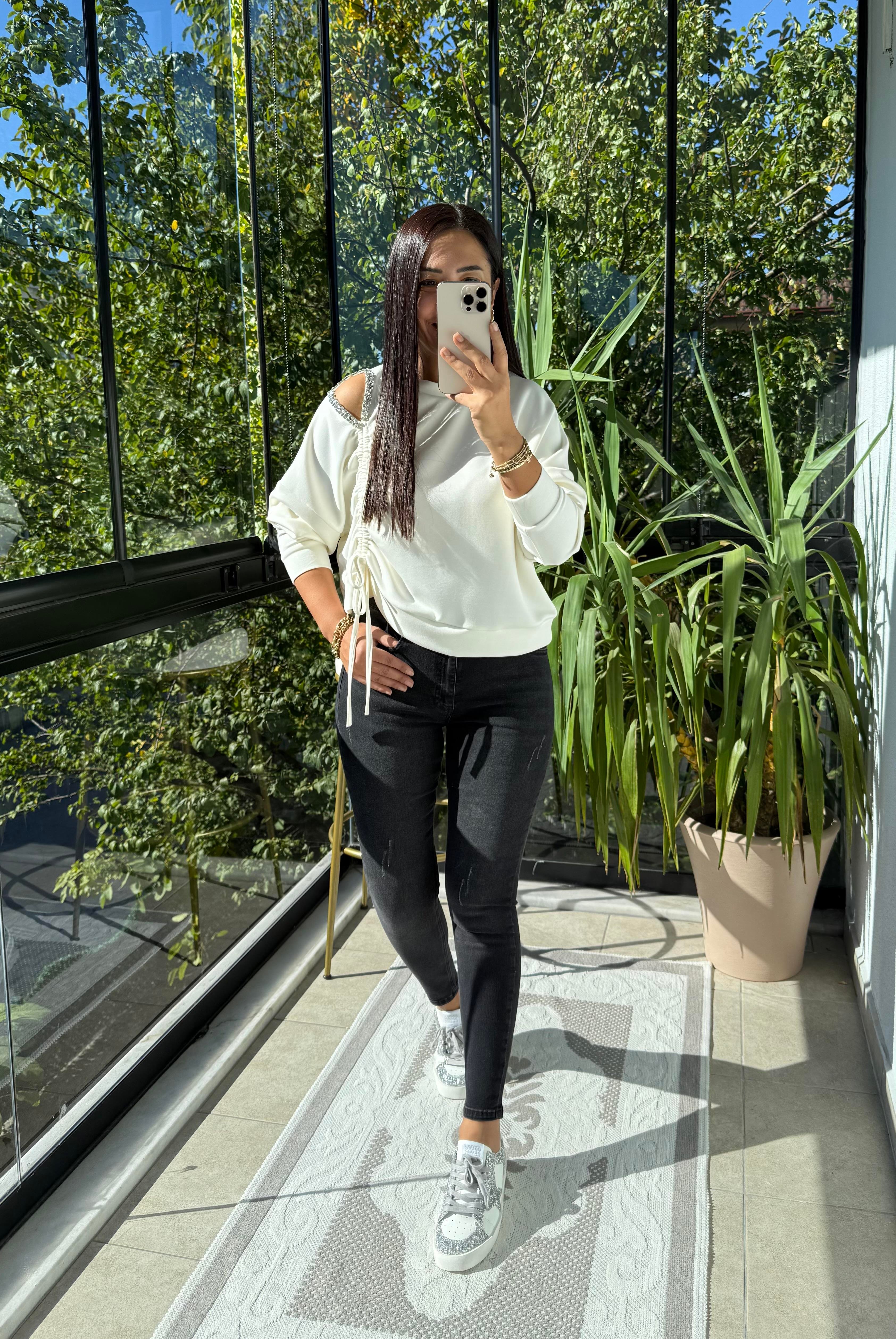 Taş Detay Kordonlu Modal Sweatshirt Ekru