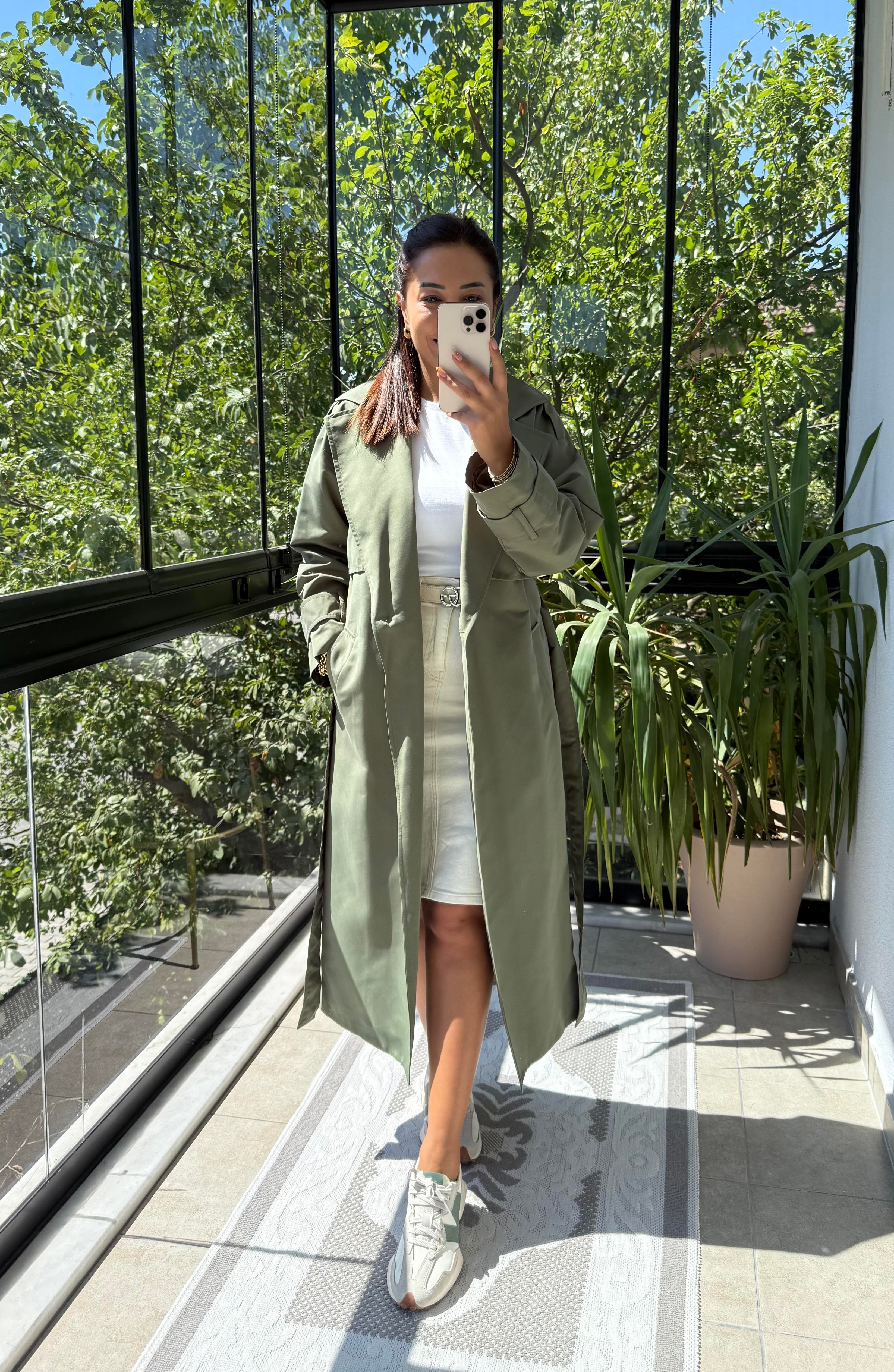 Tek Düğme Kuşaklı Uzun Trenç Yeşil