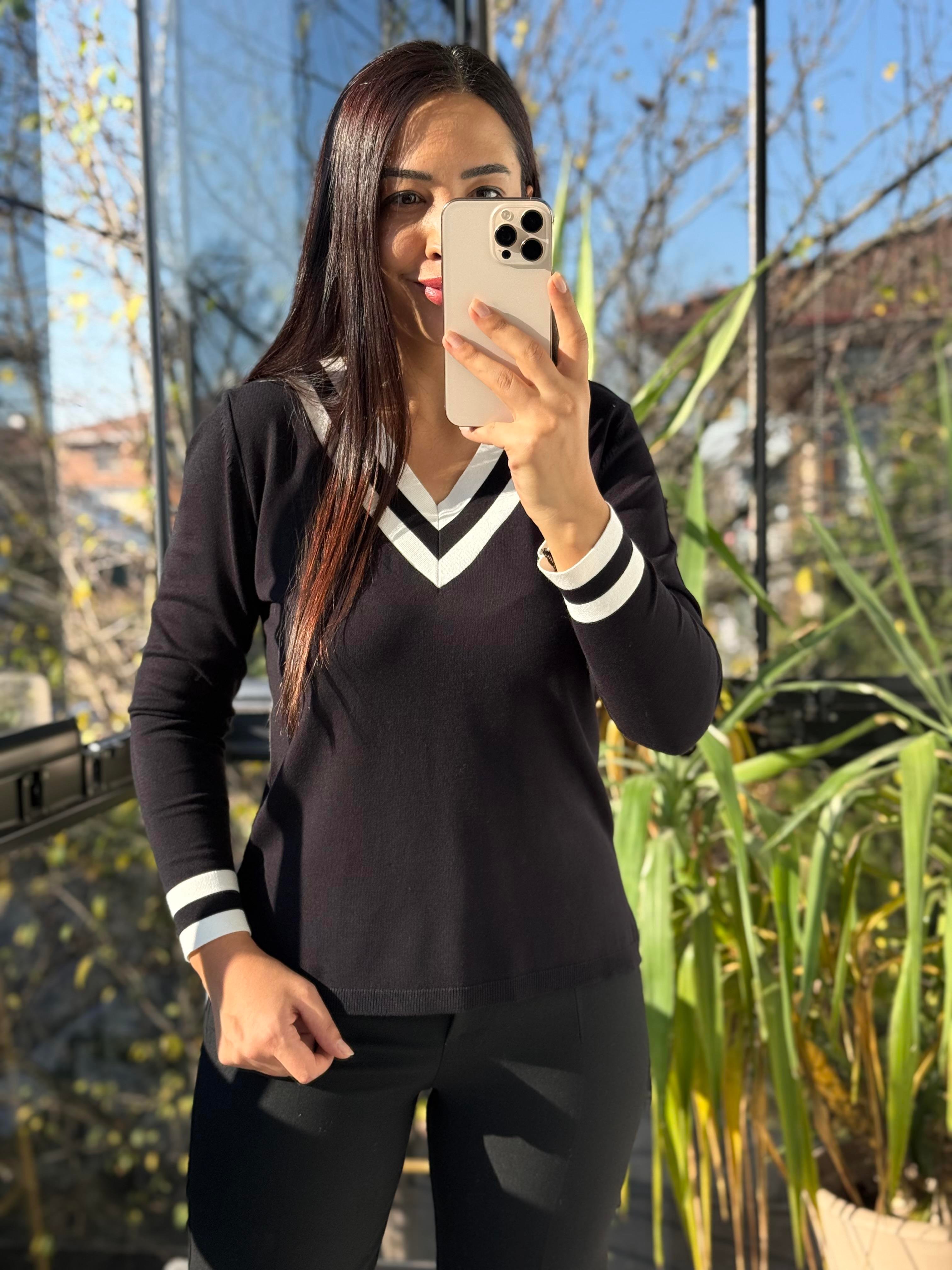 V Yaka Çizgili Merserize Triko Siyah V Yaka Çizgili Merserize Triko Ekru