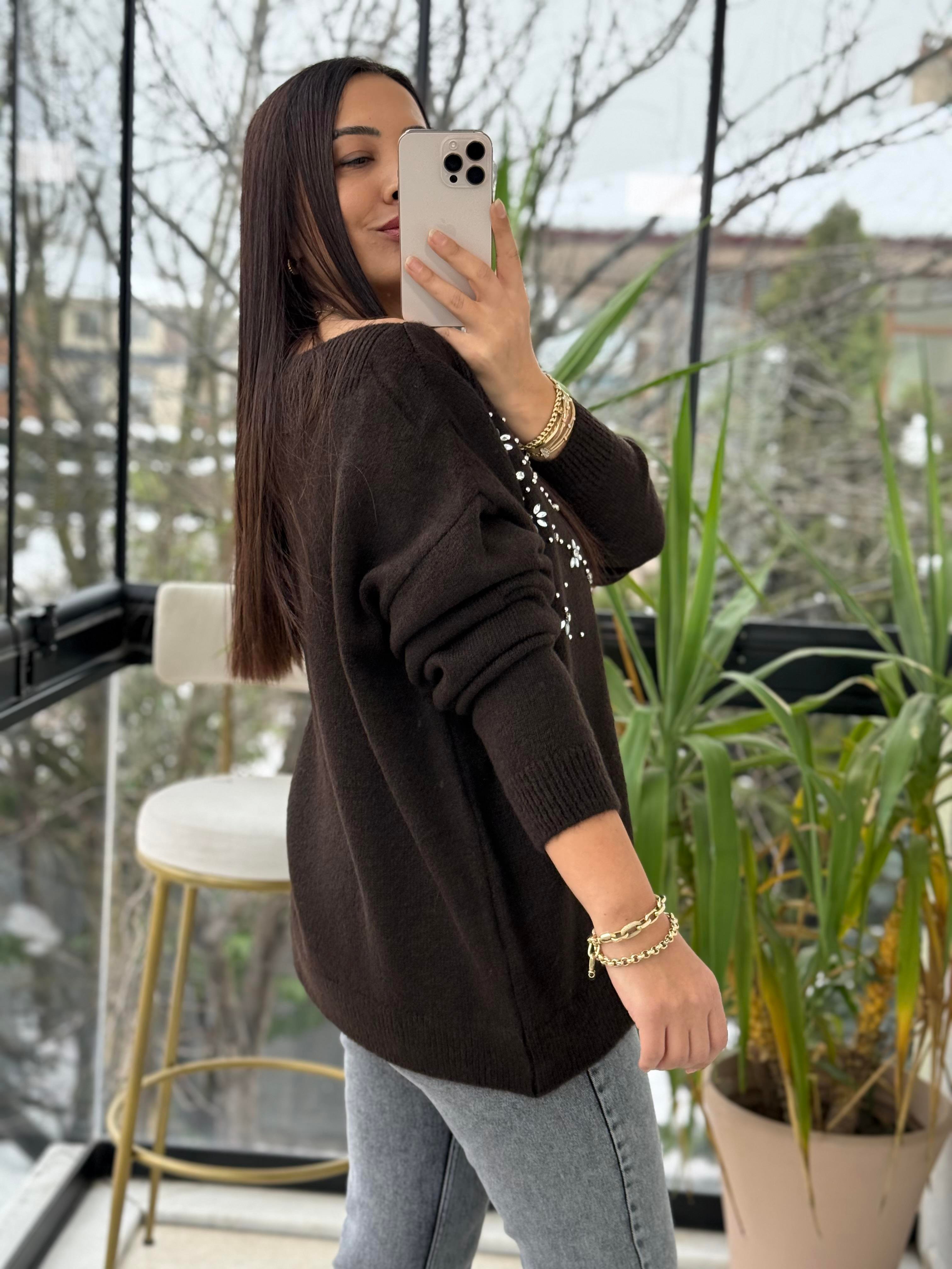 Yaka Detaylı Taşlı Yumoş Kazak Kahve