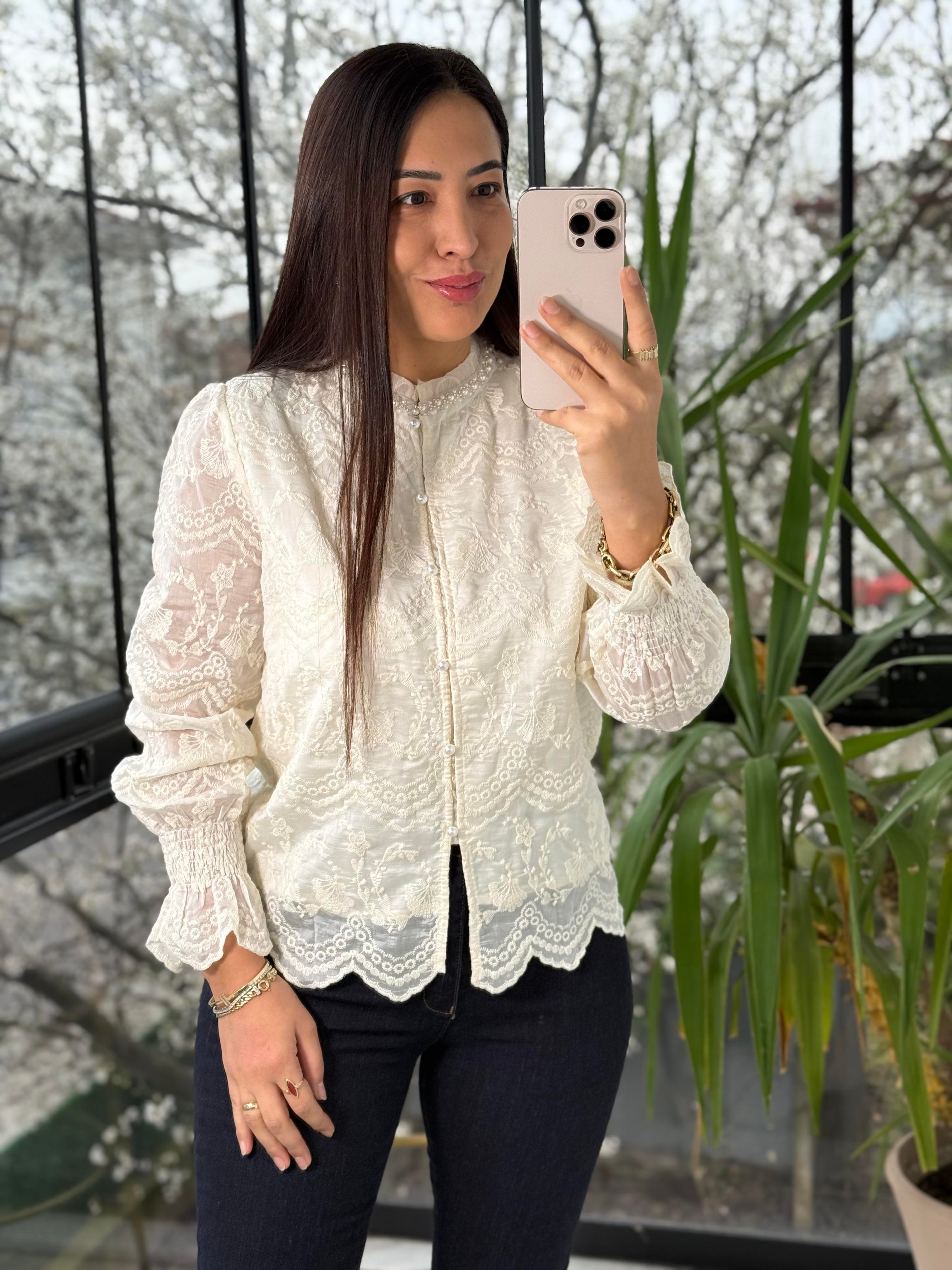 Yakası Sıra İncili Güpürlü Gömlek Ekru