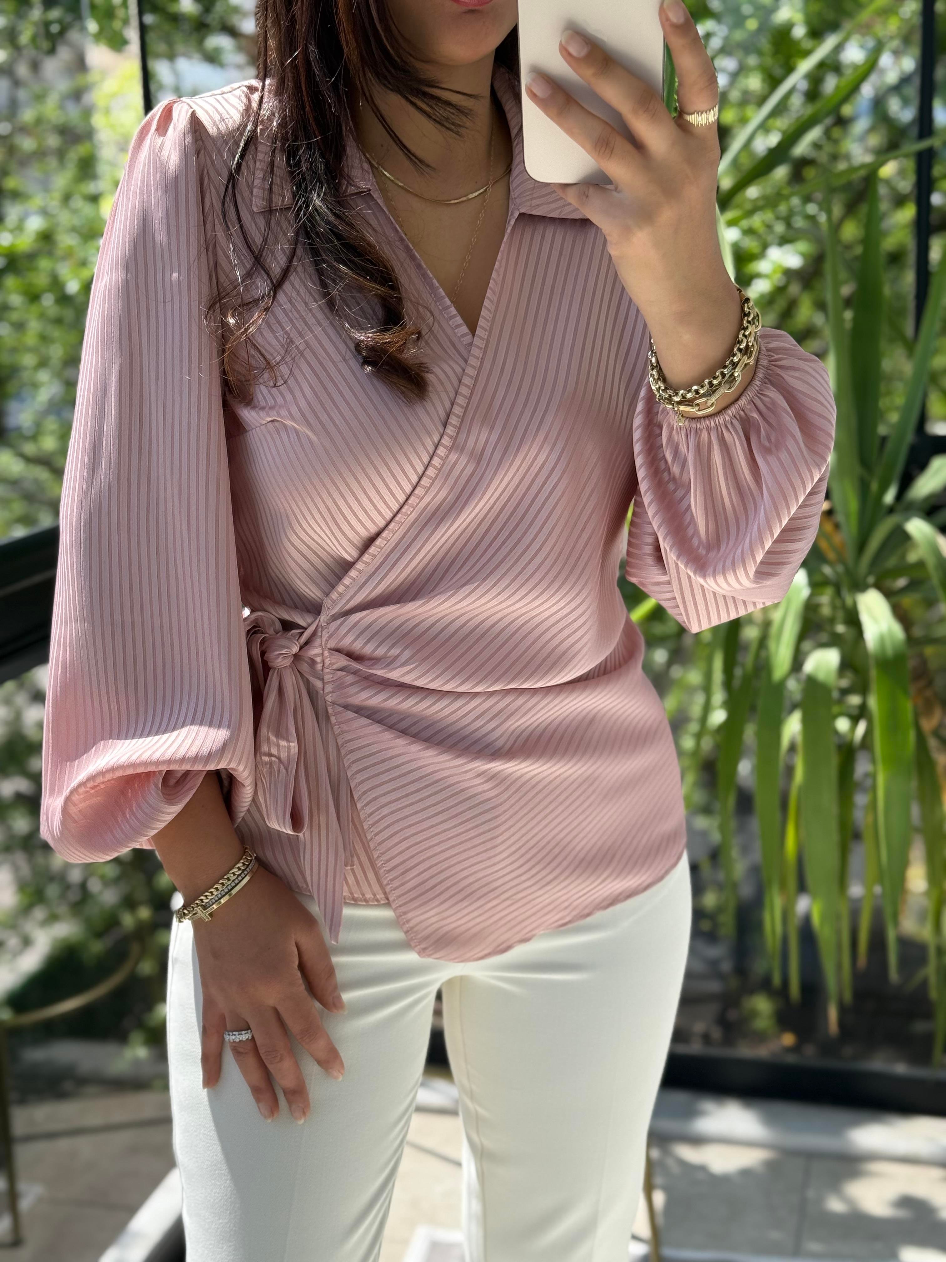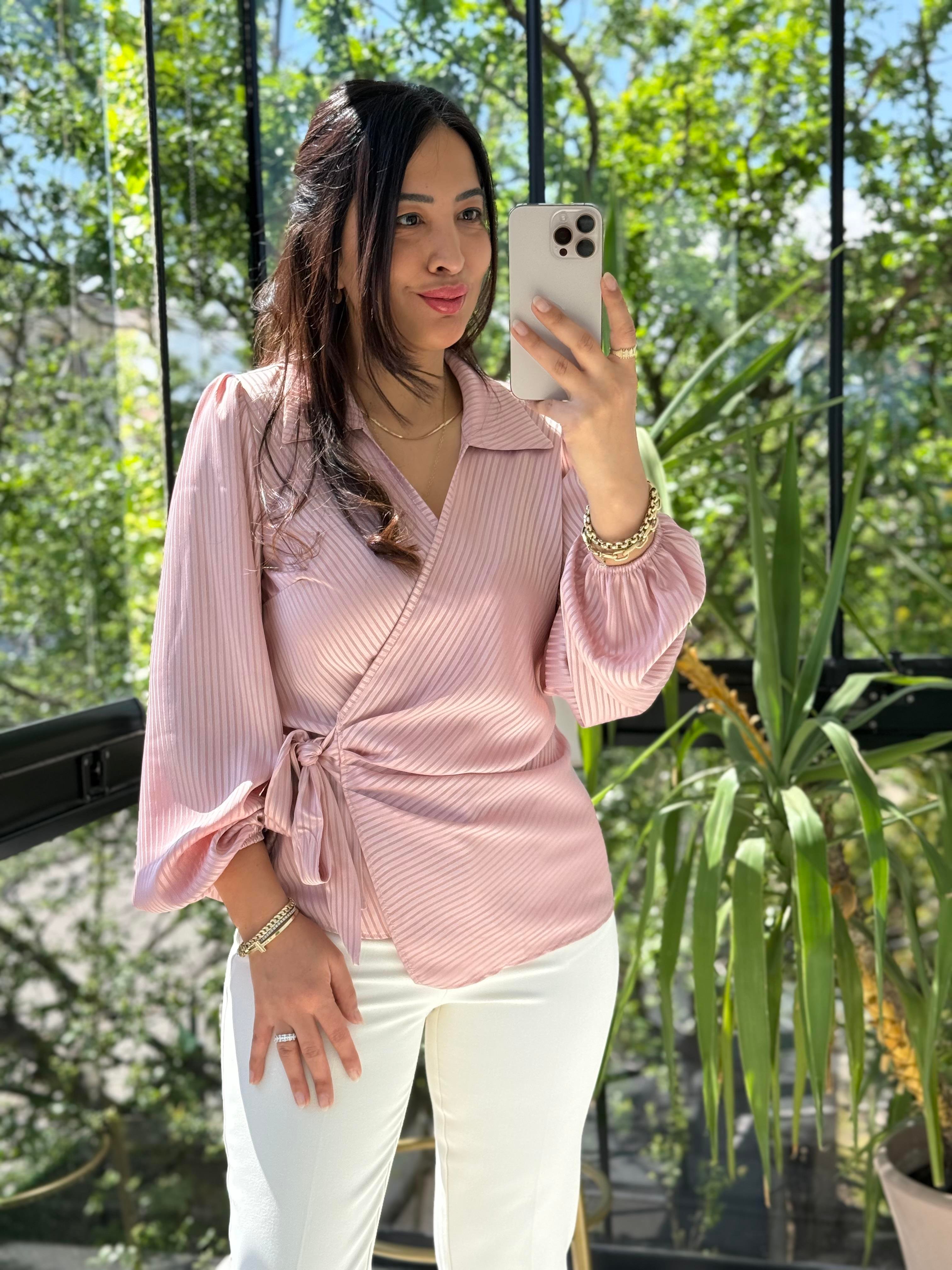 Yan Bağcıklı Yakalı Bluz Pudra