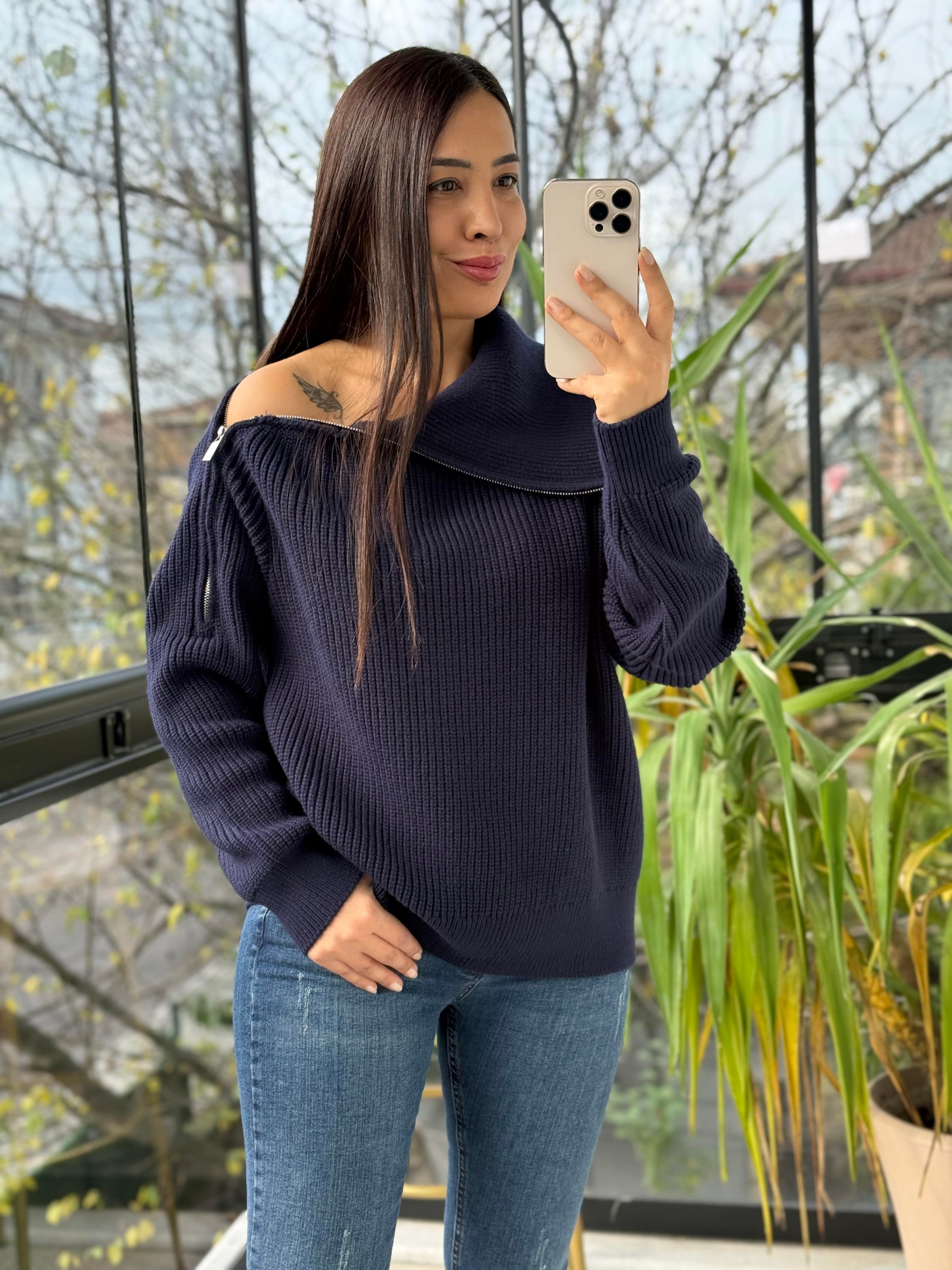 Yandan Fermuarlı Geniş Yaka triko Kazak Lacivert