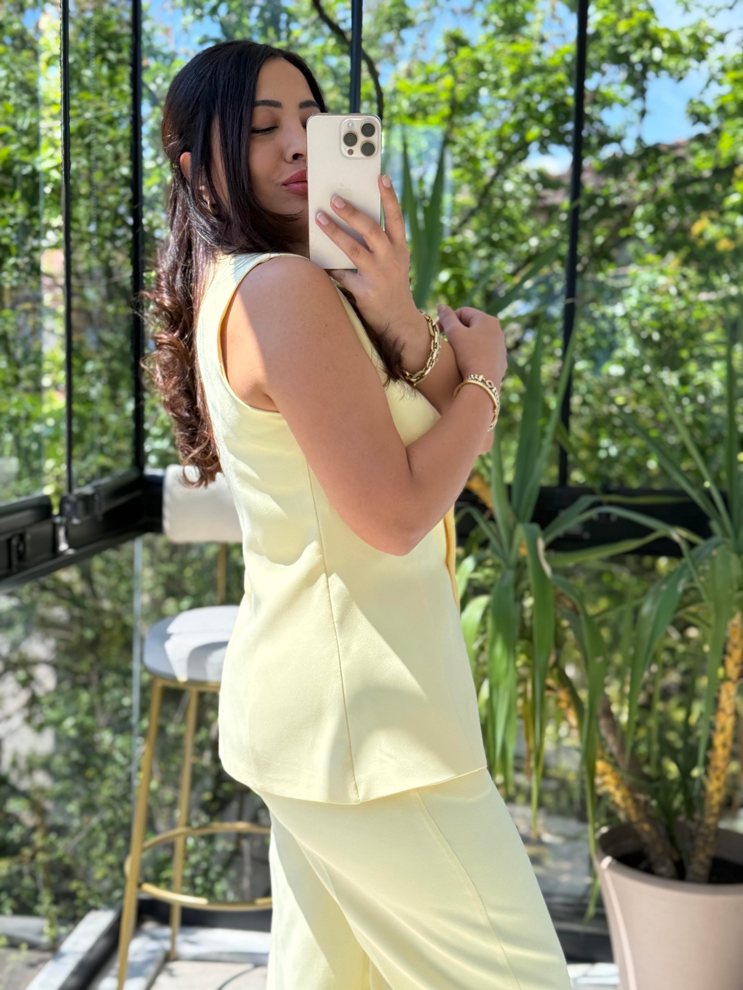 Yelekli Palazzo Takım Siyah Yelekli Palazzo Takım Sarı Yelekli Palazzo Takım Pembe Yelekli Palazzo Takım Mavi